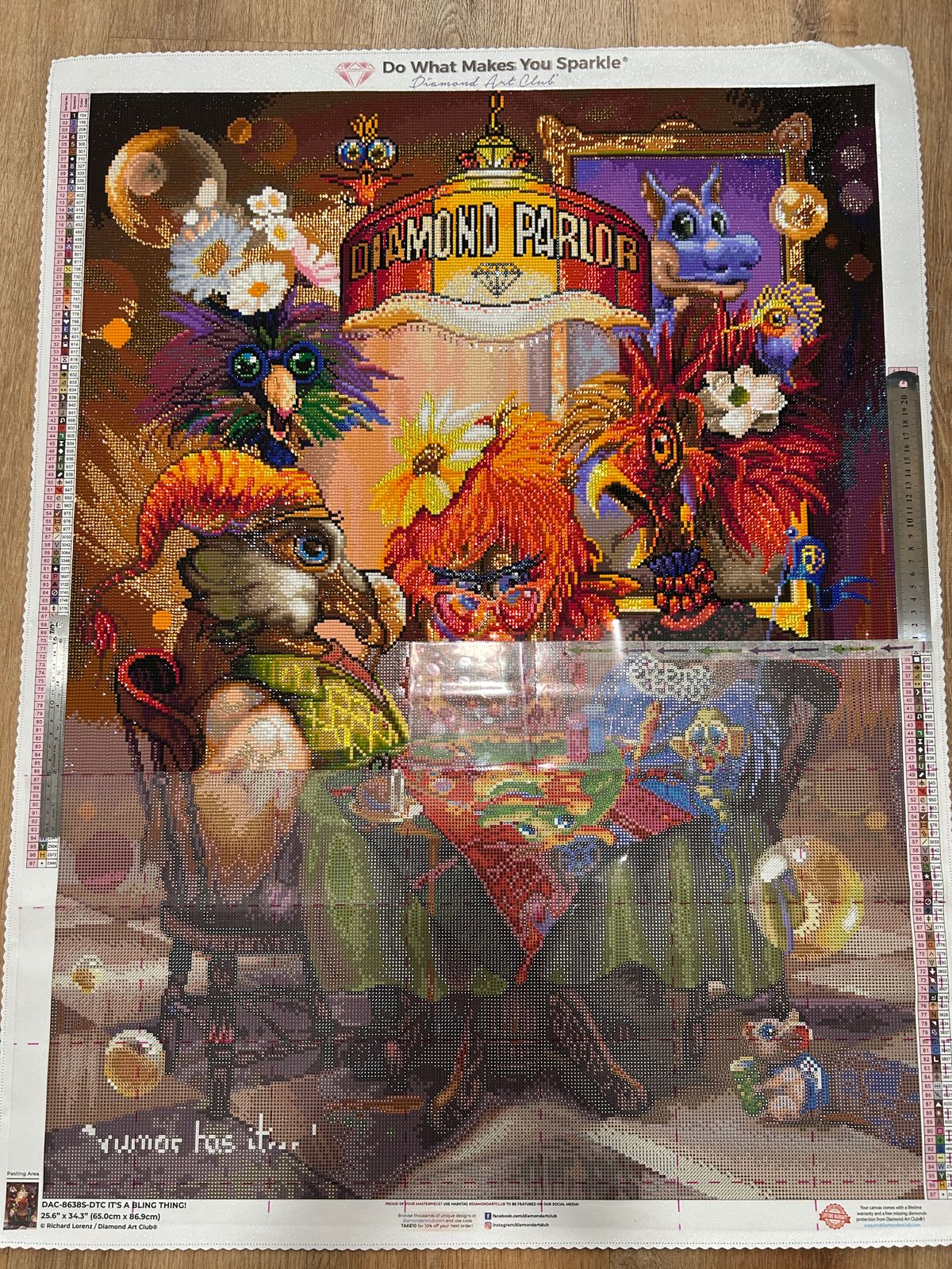 I think this one has it all. The birds and diamond painting of dragon on the table. Colors are vibrant! Square drills and it is 25.6x34.3 inches. It has 97 colors. I can’t wait to do it. I also bought enhancements for this one.