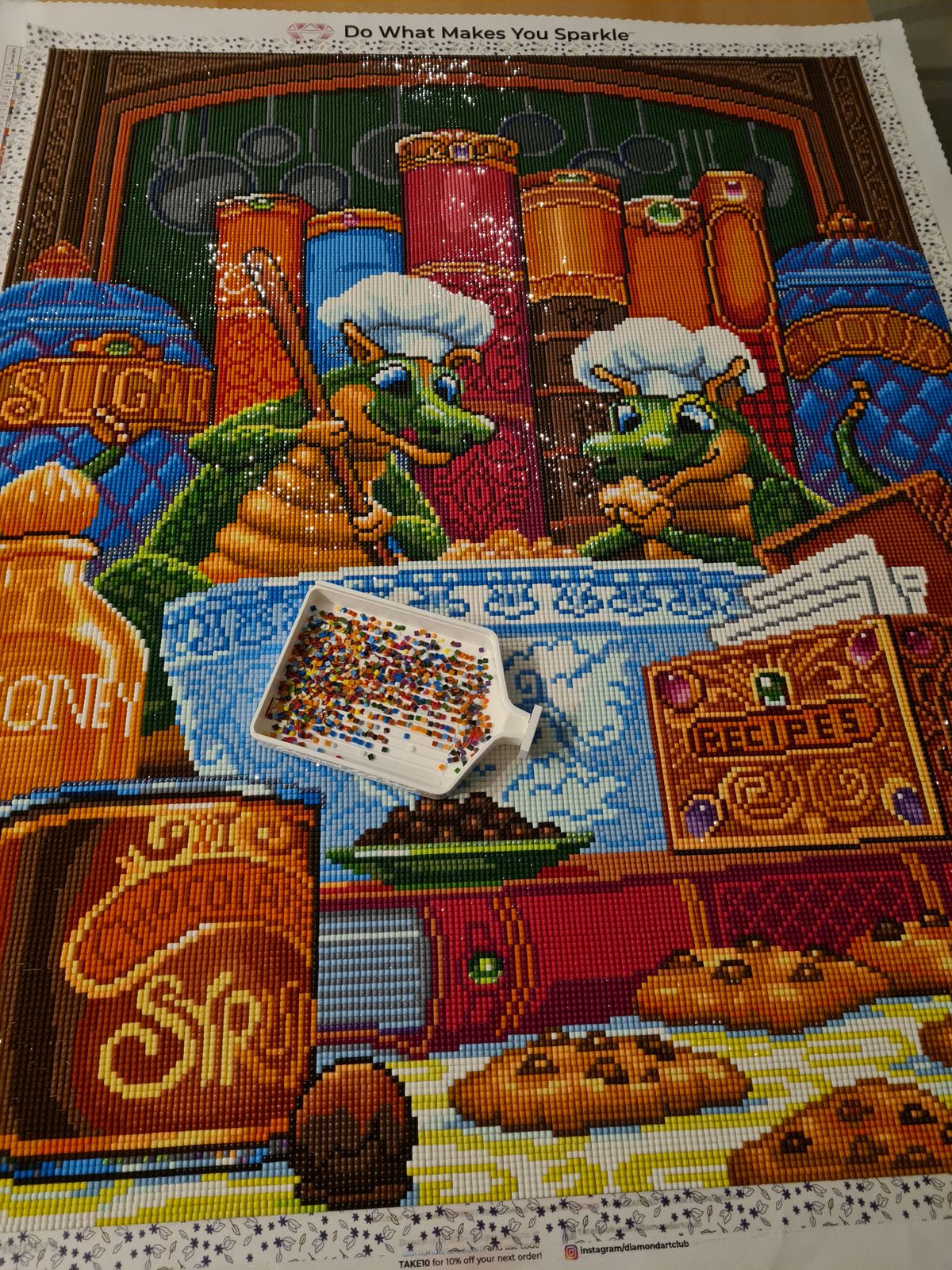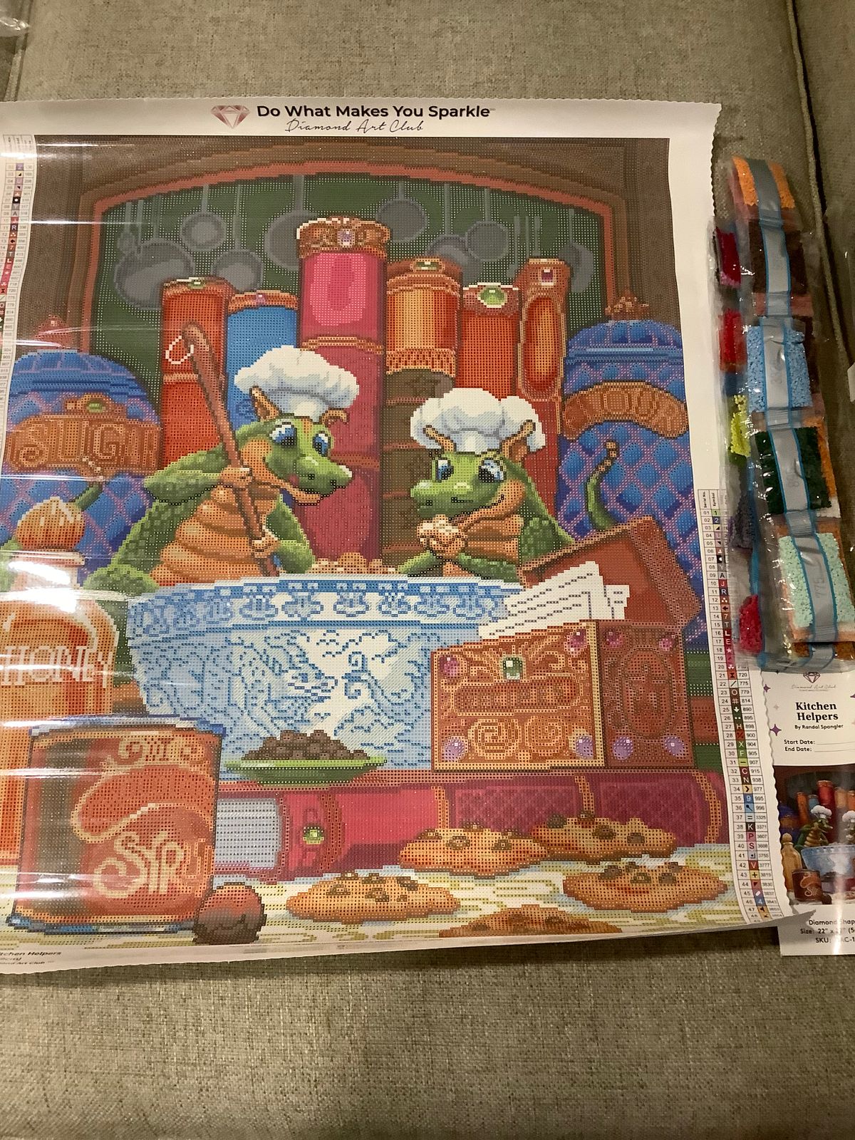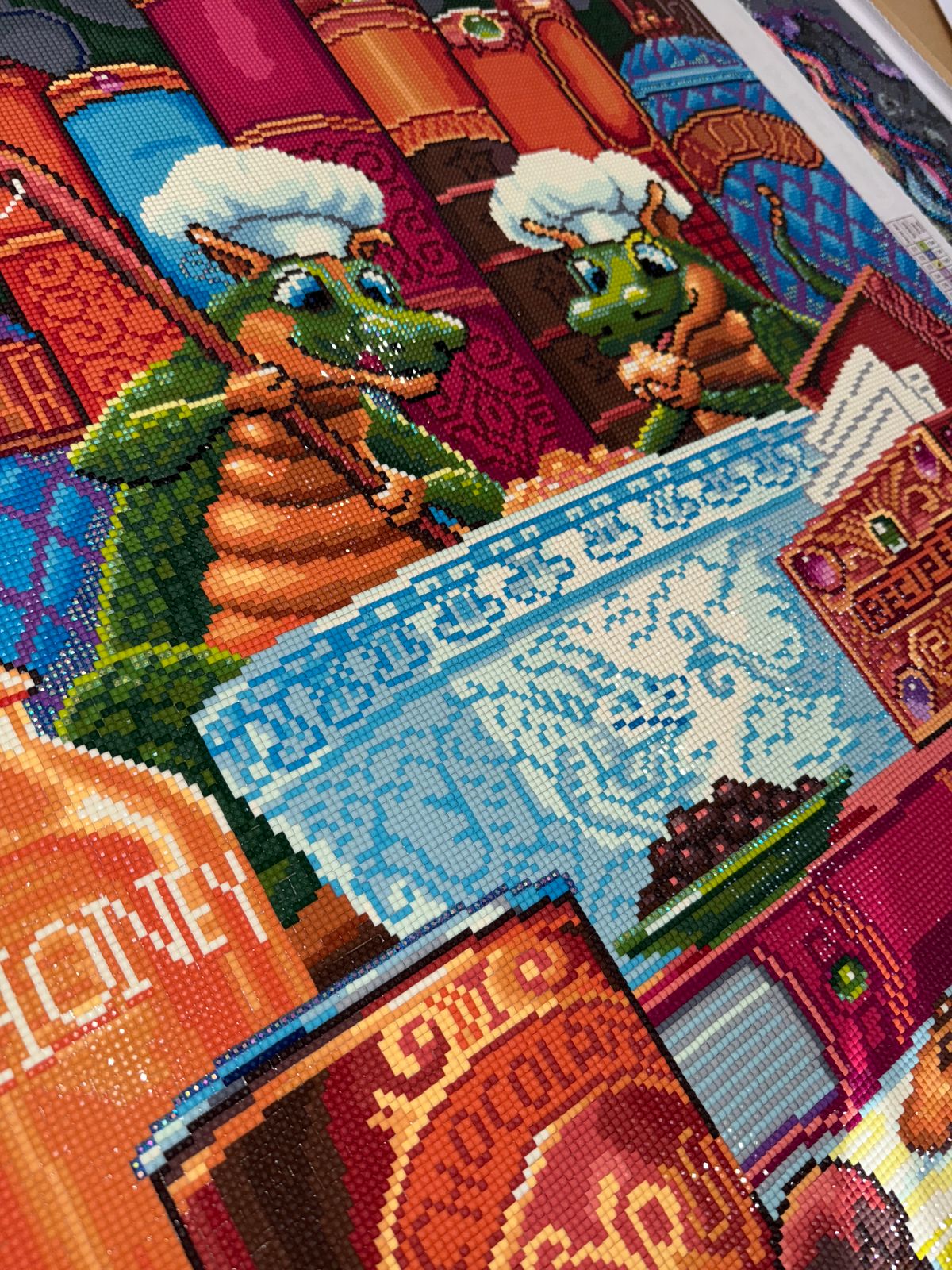 Cute little diamond painting of Randal Spangler’s dragons. It’s a good size for a beginner and would look lovely hung up in a kitchen once completed. Happy to have gotten this one, the rendering is great.