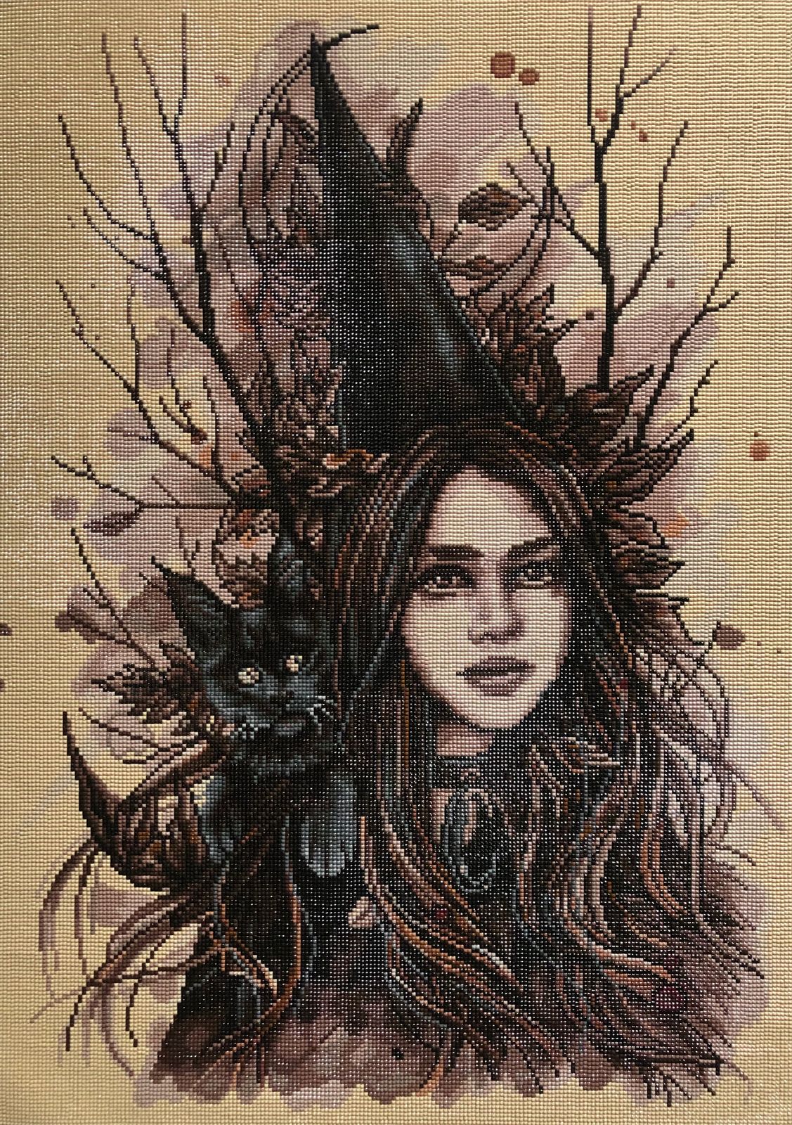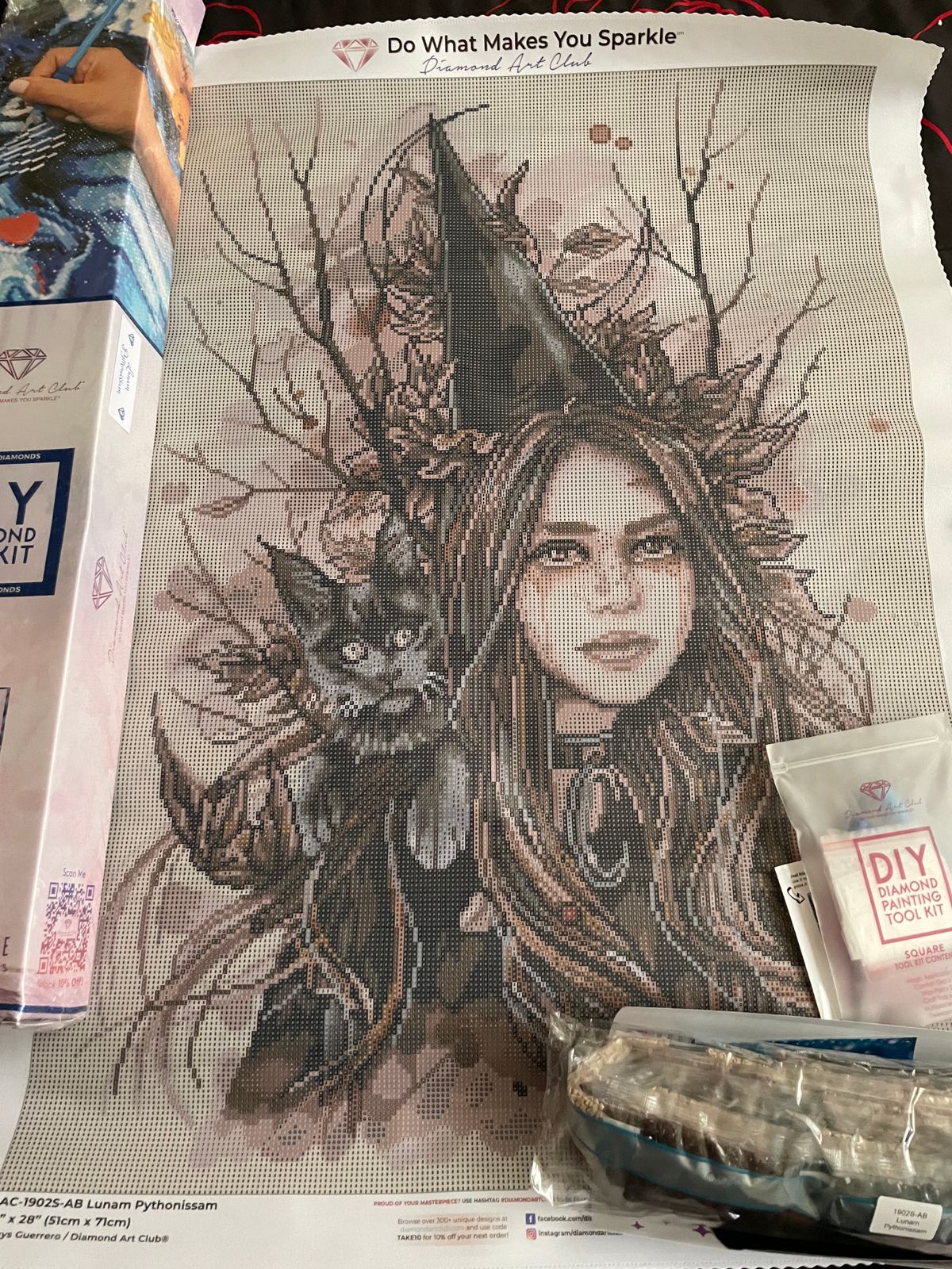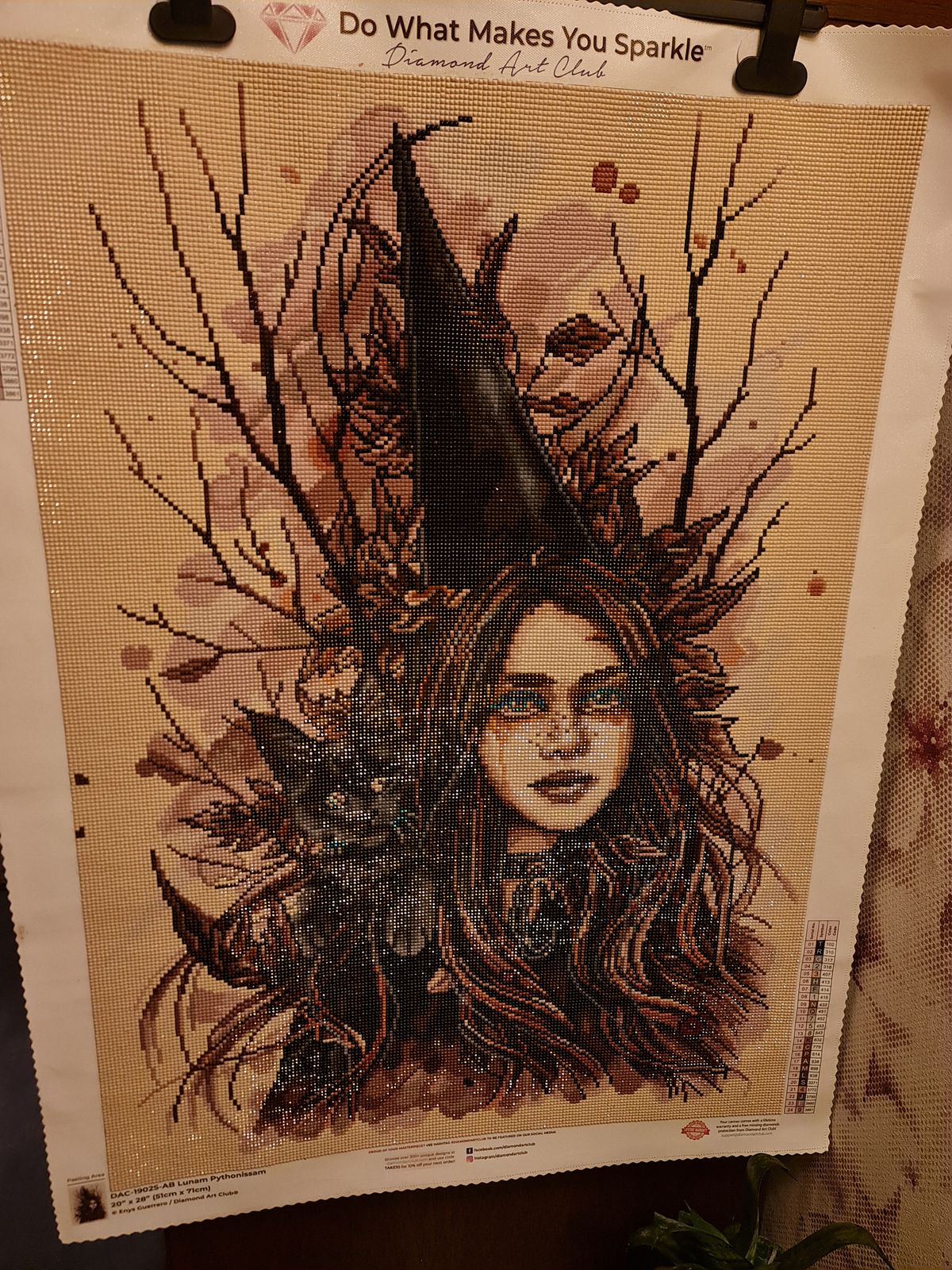 I chose her because my mom said that she looks a lot like me a few years ago, and the cat too, we had a very similar looking black cat 🥺 which gives the painting so much meaning to me and that's also why the disappointment was probably more than it would have normally been because of very obvious gapping, I know that the picture is older but I got the new diamonds and they just don't fit like they should, they're too small. I tried to ignore it and it's not as obvious from a viewing distance but it still upsets me. I also made a few changes, not because I didn't like it but because I made her look even more like me and a friend of ours actually came around a few days ago and noticed the resemblance without me even saying anything and that made me smile because it has so much emotional value.