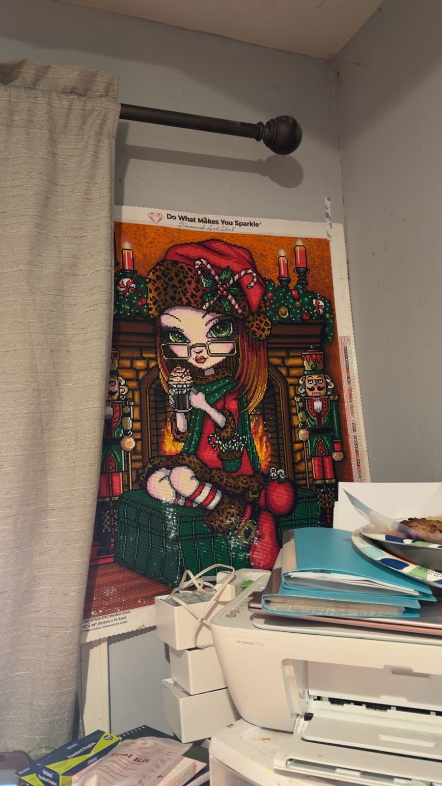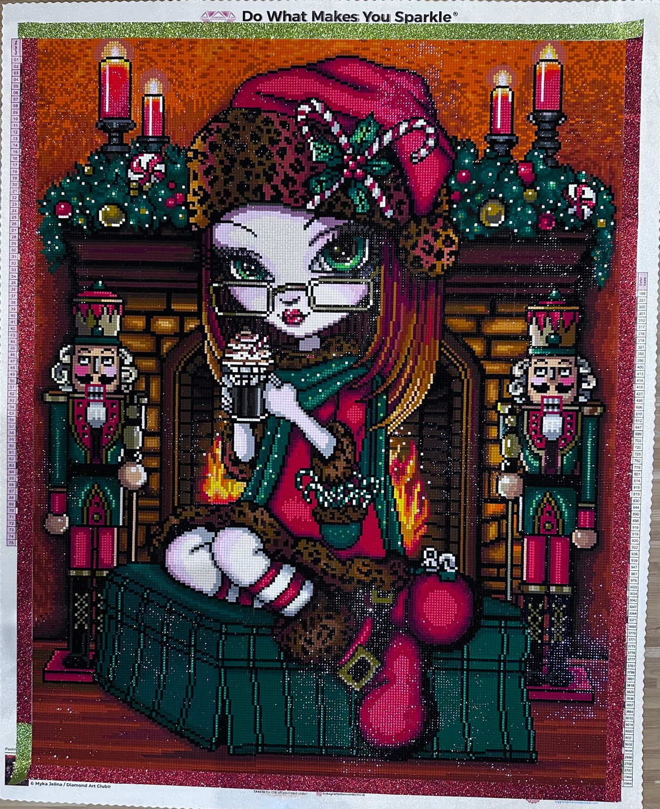 Just finished in time for Christmas this traditional red and green colored elf by Myka Jelina. Love the detail and signature big eyes! The hot cocoa whipped cream and candy canes in her pocket look good enough to want to eat. Really enjoyed working on it.