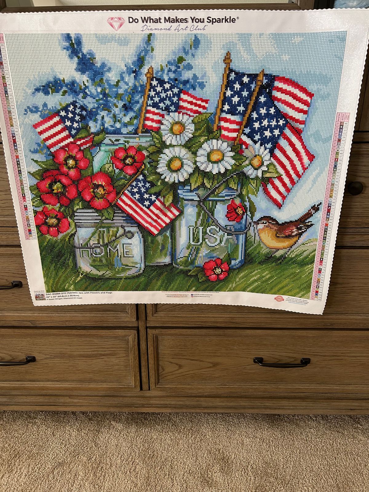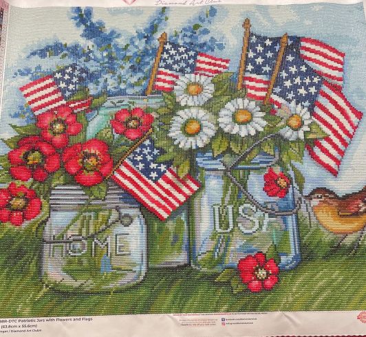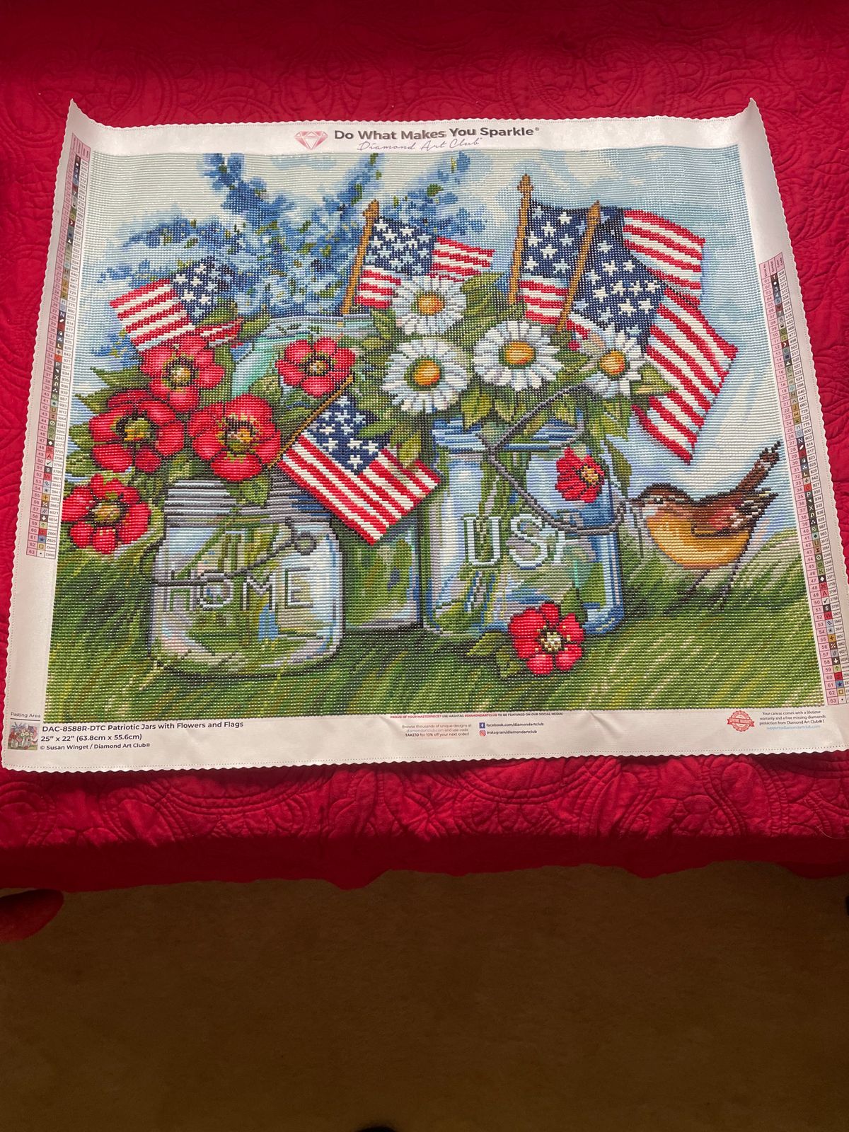 This was fun to work on even though it's rounds. I prefer the squares but enjoyed this one. The colors are great and very sparkly. Hard to get the sparkly in the picture. Will look very nice with my 4th of July decorations. This artist has very nice art, I have several and I'm now ready to start on the next one. Love the themes for different seasons to be able to swap out.