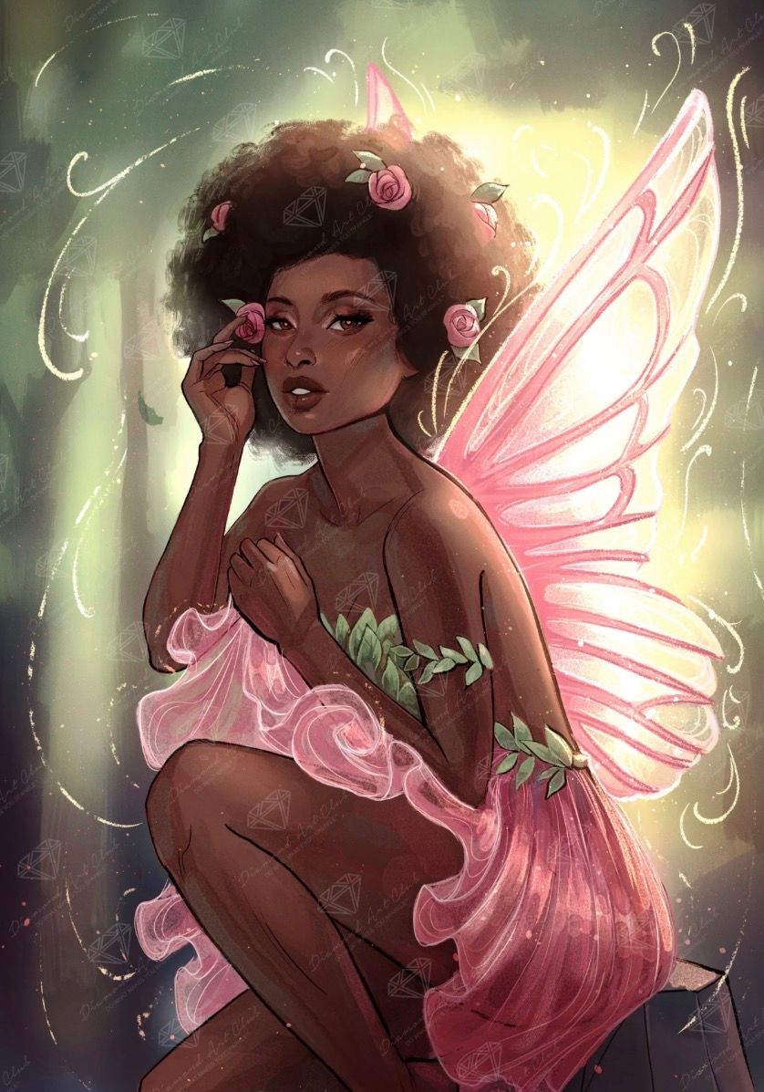 Flutter through the enchanted forest surrounded by pink petals and bathed in soft, golden light. Every delicate whisper of wings carries the scent of shimmering roses and the promise of sparkling magic.