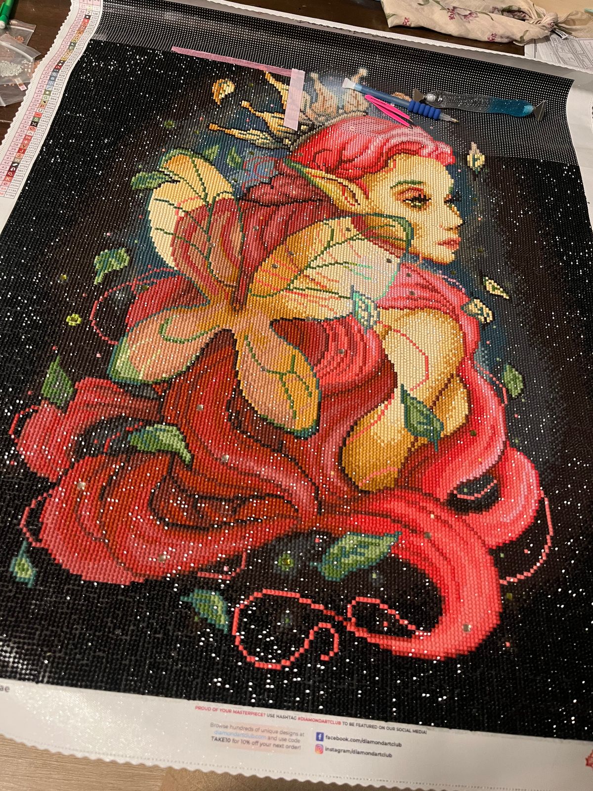 This kit is an older DAC kit. It comes in rounds. What a joy it has been to work on. Although there was a decent number of trash in 310s, the ones that didn't have them were so much to place. Like Glenda the good witch said "there is no place like home". DAC is home because of its consistency. I began working on this kit 2 years after I bought it, & the stickiness of the canvas has not faded or become less stickier at all. I have 10% left to do. I'll be working on her wings & face next. Don't worry if you are getting an older kit, everything about it is on point.😊❤️