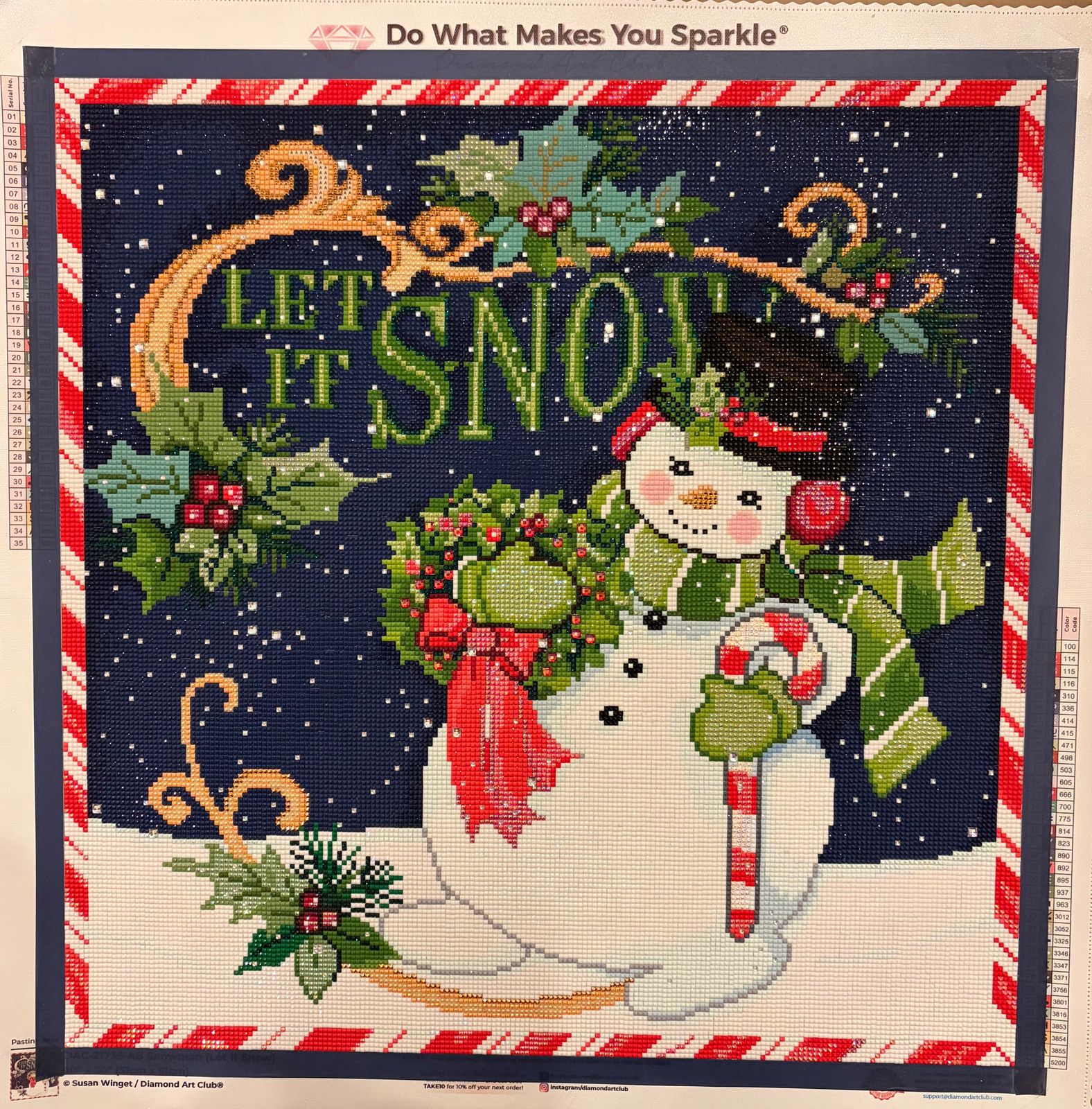 This little snowman was a dream to work on. He sparkles of snow and chill. Perfect for a beginner or experienced diamond painter alike. Enjoy!!