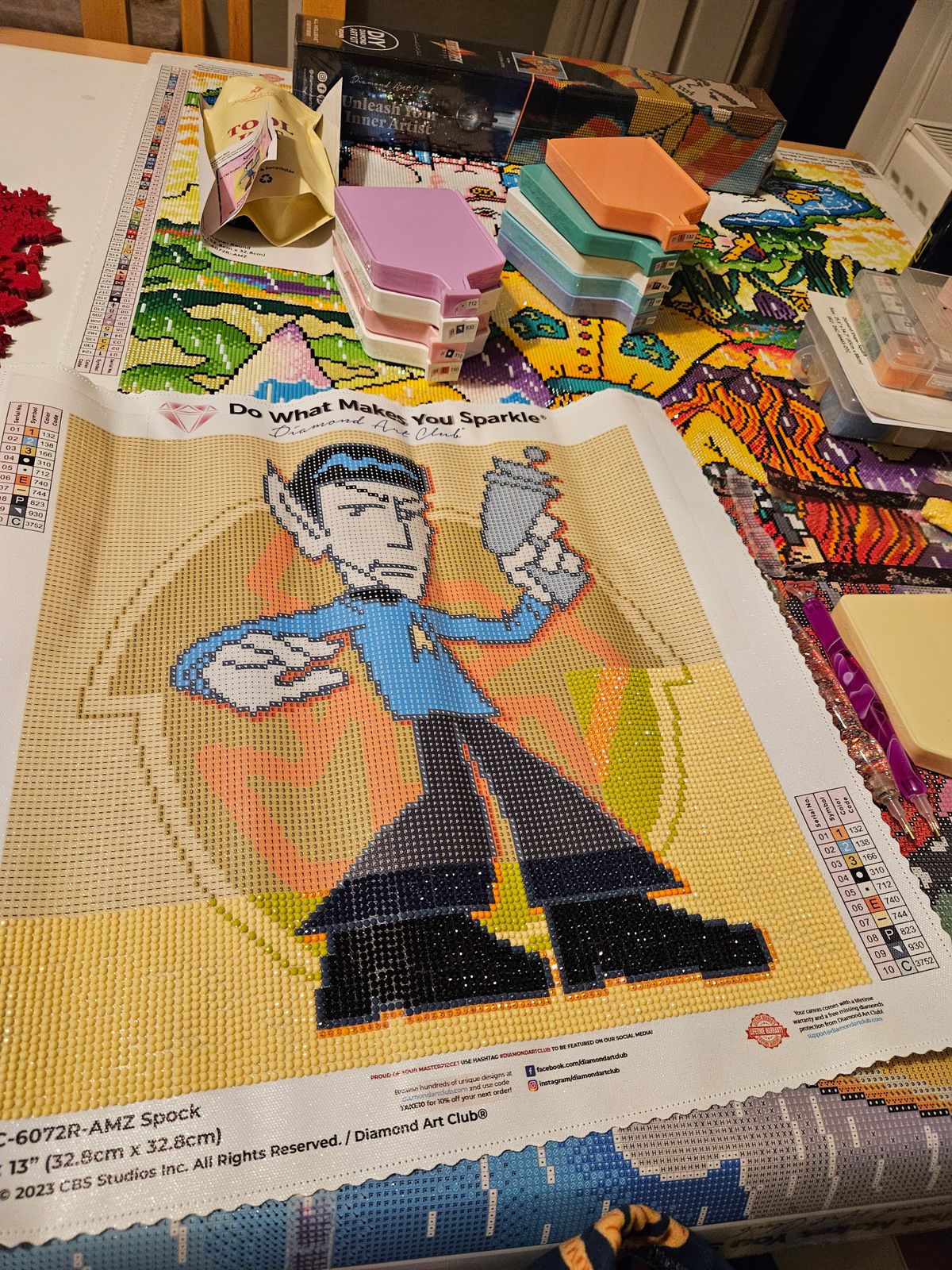 Bought this to do as a gift, was quite late being delivered as it seemed to be held up in Europe for some reason, but it's a cute snack size piece to work on. Due to the colour blocking it's working up quickly, just under 2.5 hours so far, however the drills are some of the most staticky I've ever worked with which is a bit annoying