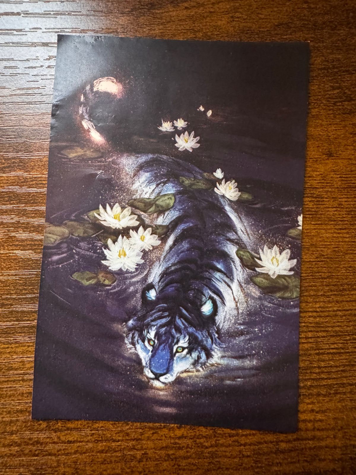 Gliding through the cool, violet waters of the night, this majestic tiger silently swims in silence as the moon above illuminates its silky coat into glowing shades of midnight blue. As peaceful lotus blossoms gently caress and cascade along, our feline friend pierces the night with a fearless strength and graceful stealth only found in the most luminous of creatures.