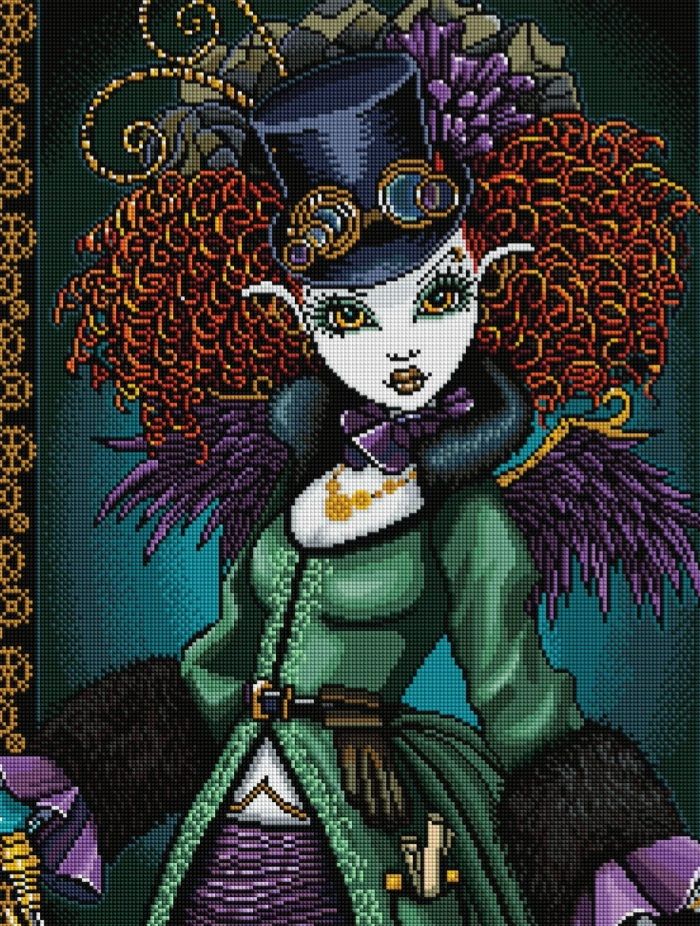 Arrive with presence in lush hunter green, feathery grape, and a complete coiffure of spiraling auburn hair. Steampunk your way across time and place with golden gears and metallic appliances of all sorts.