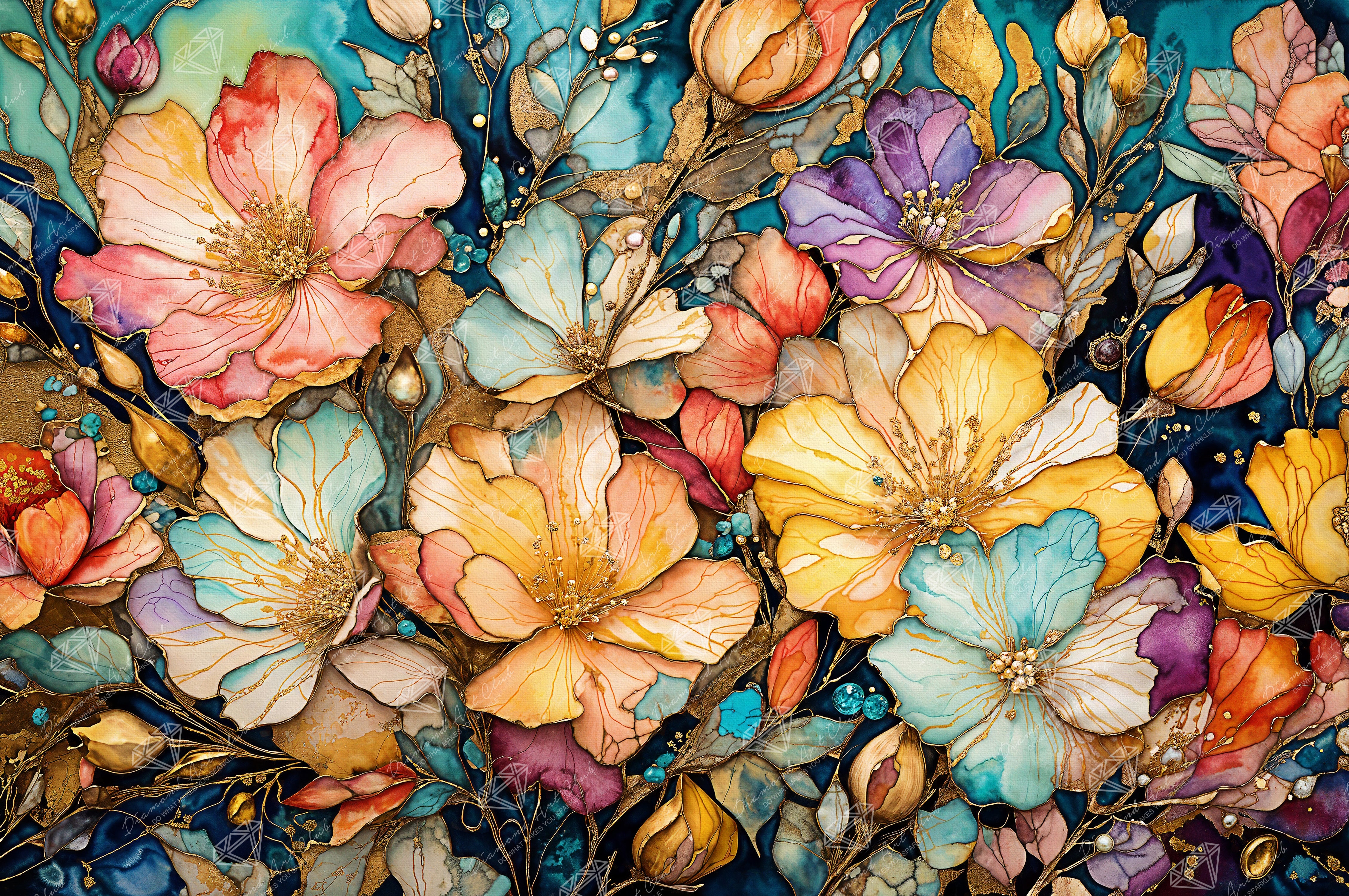 Get lost in a sea of fluttering florals in luminous pearl colors with golden veins. In this radiant garden, each petal blooms with light, kissed by shimmering elegance.