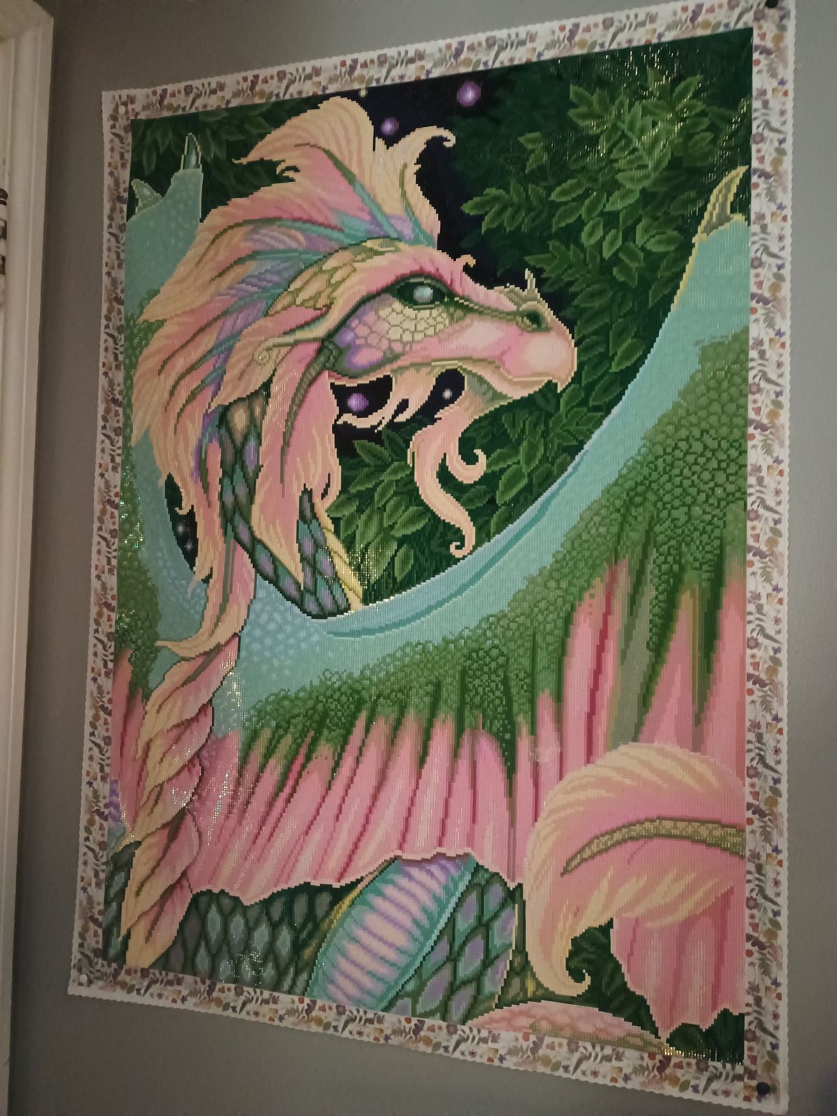 I am not usually a 'pink' girlie. (Purple!!!) But with those sea and mint greens, it just works. I'm almost done with the bottom half, so I'm through my 'gauntlet' and onto the wonderful mass of fairy dust drills in the upper part of the wings. I can't wait to frame it.