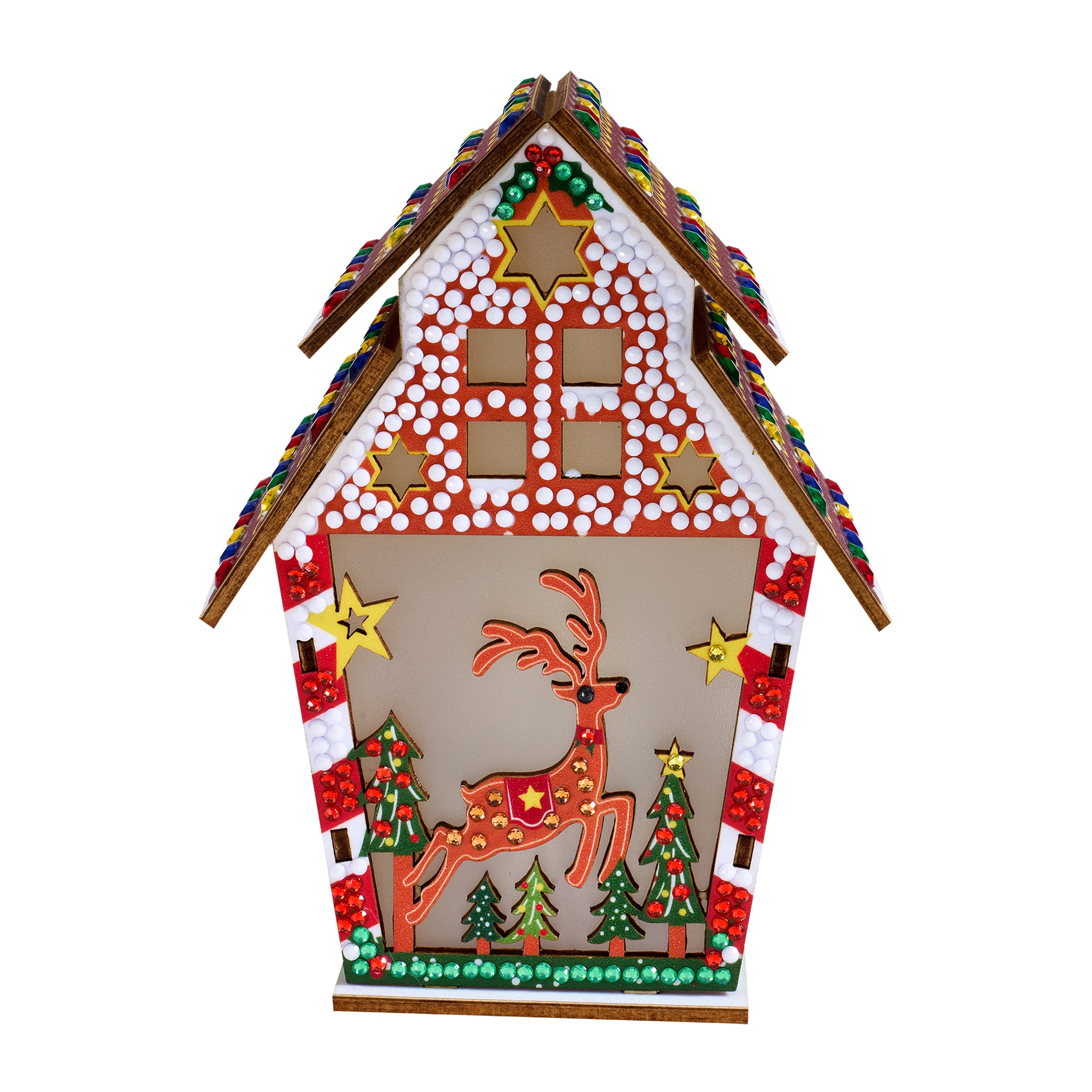 Create this charming gingerbread house with a graceful reindeer prancing among snow-dusted evergreens. The candle inside lights up, giving a glow to the holiday-hued sparkles on its peaked roof.