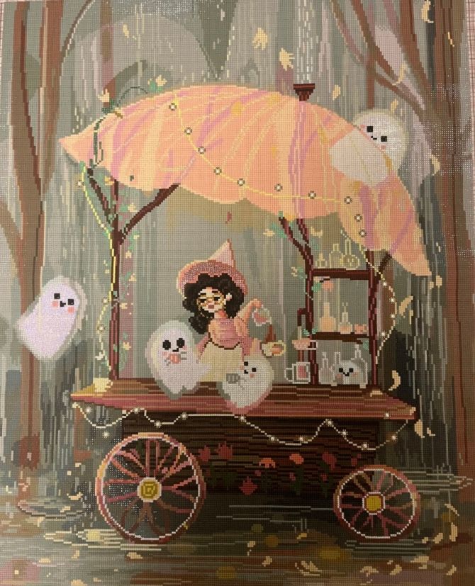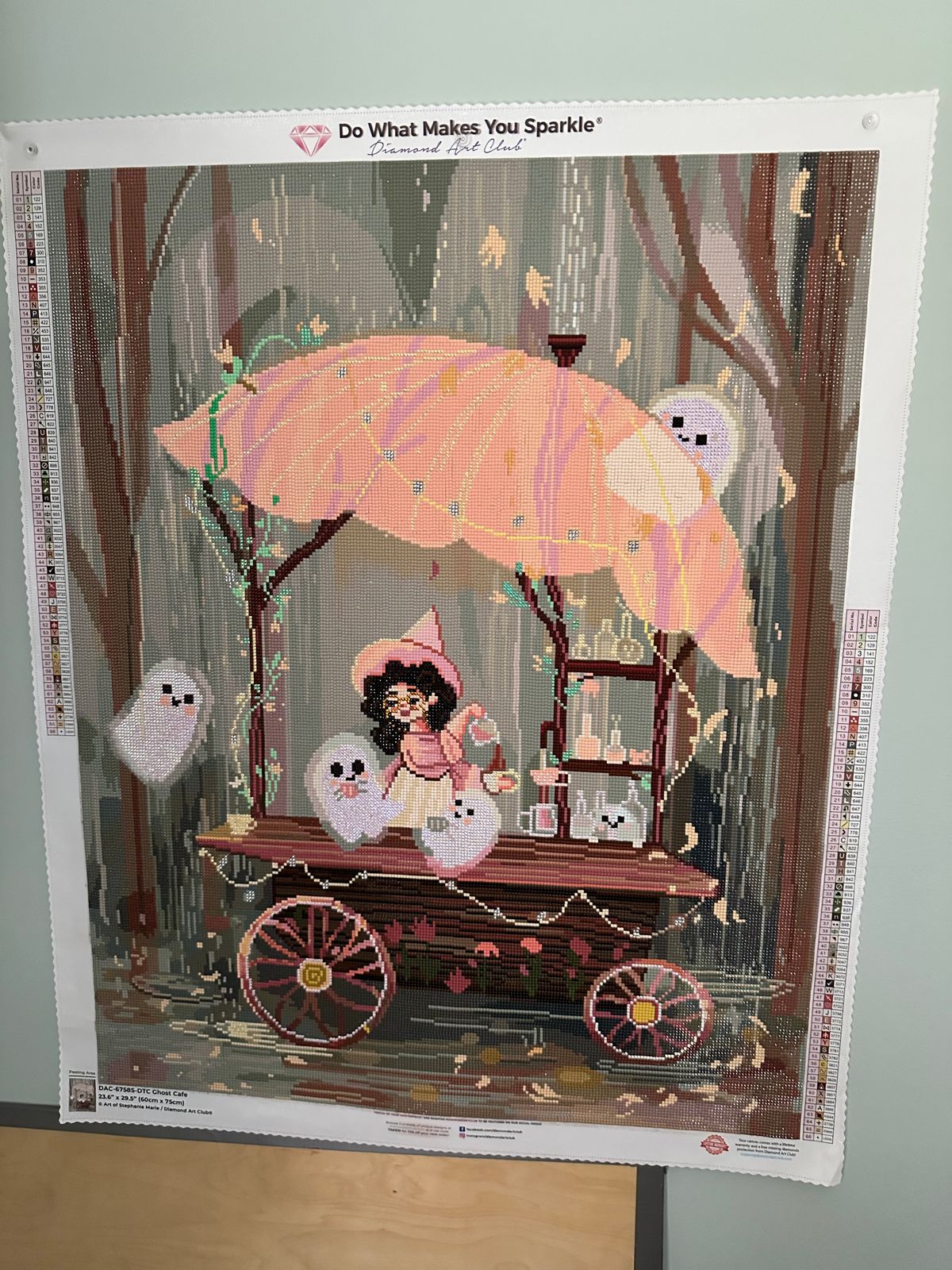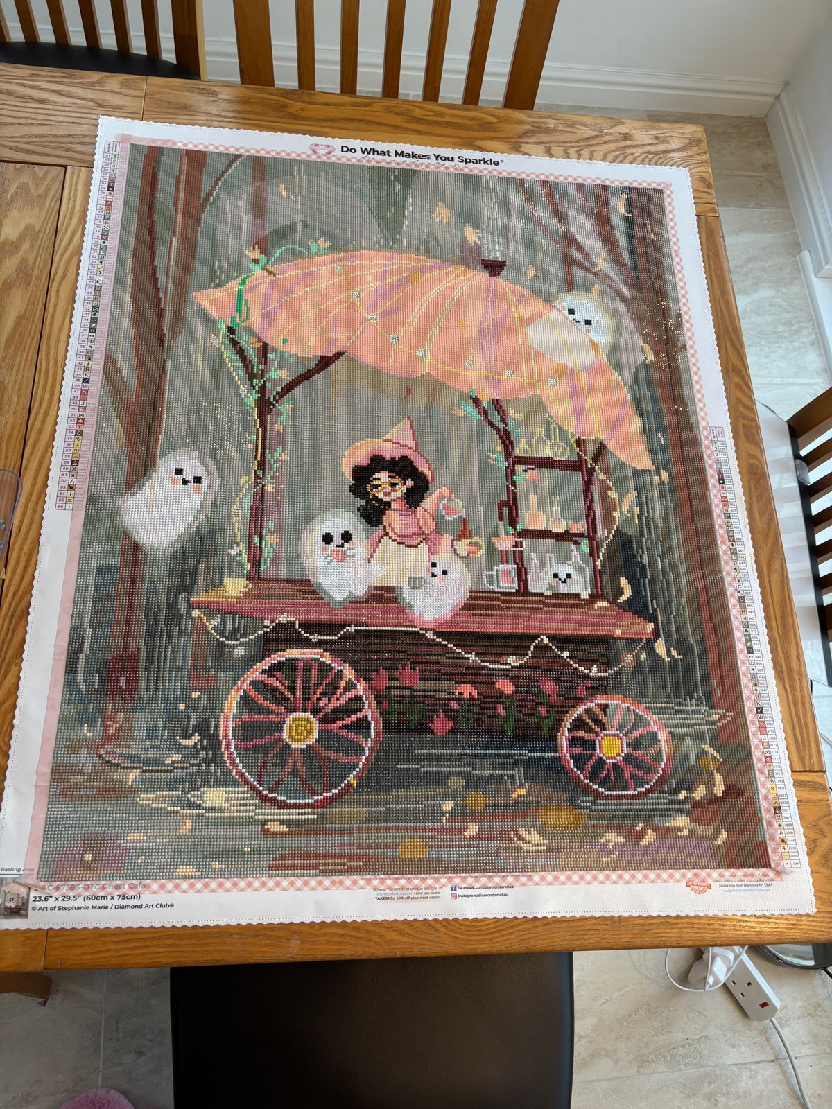 Diamond Art Club’s quality really shines: the canvas is clear and buttery soft, the symbols are easy to read, and the drills sparkle beautifully. Every section felt exciting, and watching the ghosts and café scene come to life was such a treat.