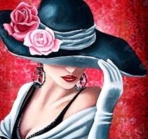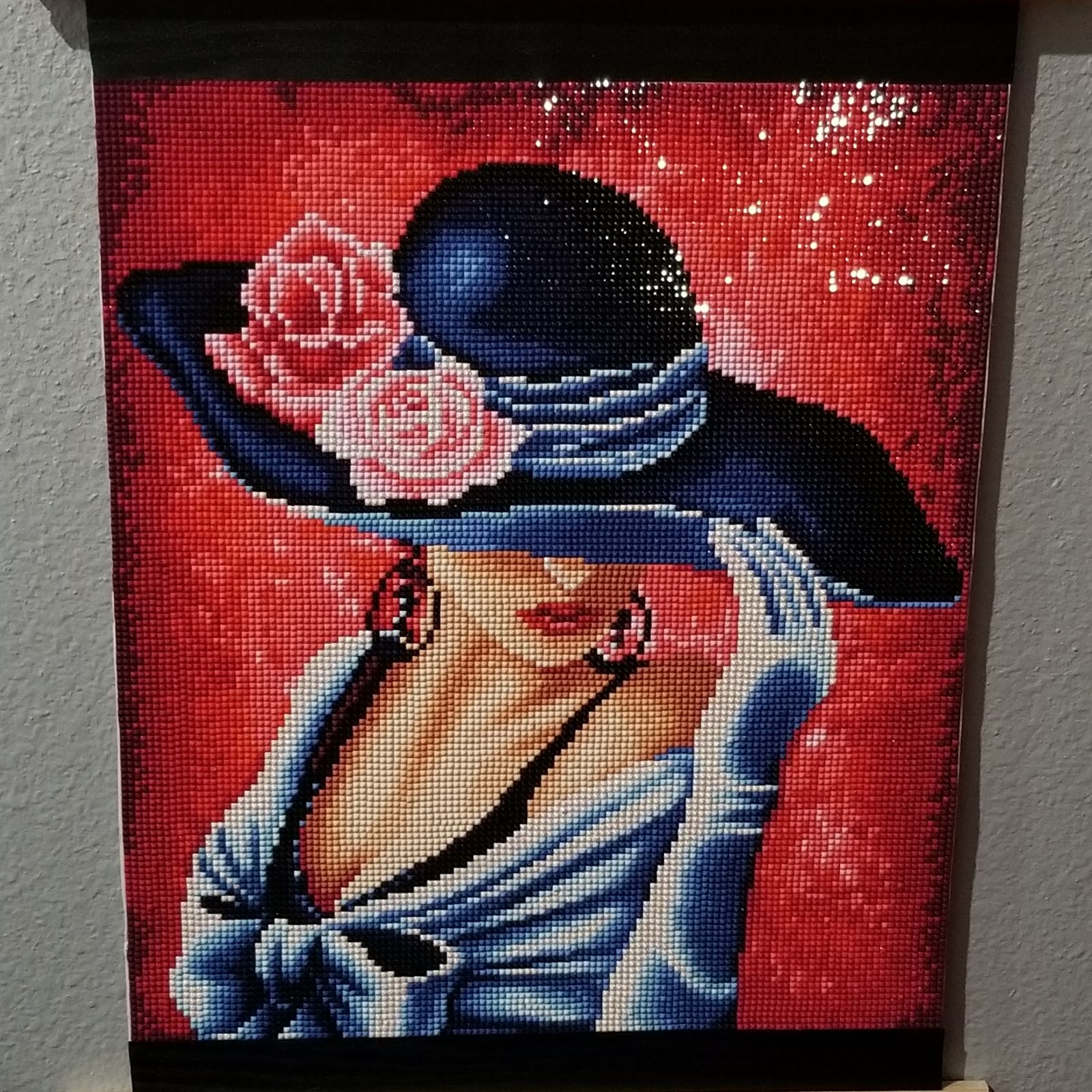 This diamond painting was quick to do, but fun the whole time. It came out very non-pixelated looking, especially for its small size. It was mostly line blocking. The red background was more fun to do and more intricate than I originally realized, since it's not just a solid color but a design. I particularly enjoyed diamond painting the flowers on her hat. I like the way the folds on her clothes look. There was only one special diamond in this canvas, but it was used quite a bit, as all the white on her clothing: the top she's wearing, glove, and bands on the hat.