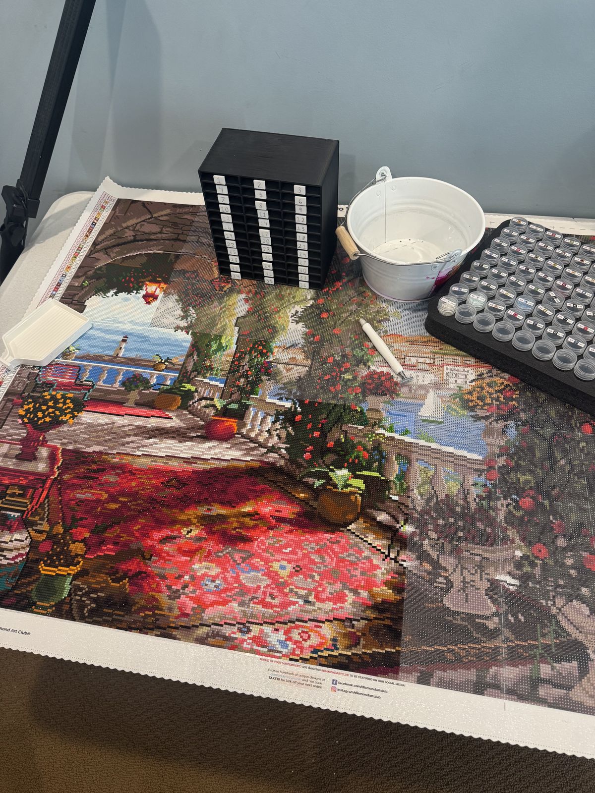 Mediterranean Veranda is a breathtaking piece bursting with color and serenity. The detailed rendering, sparkling drills, and calming coastal scenery make it a joy to complete and display.
