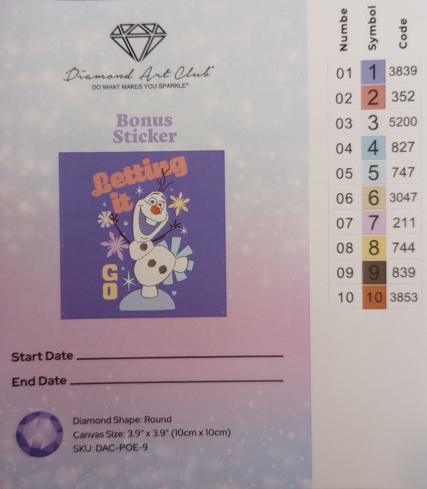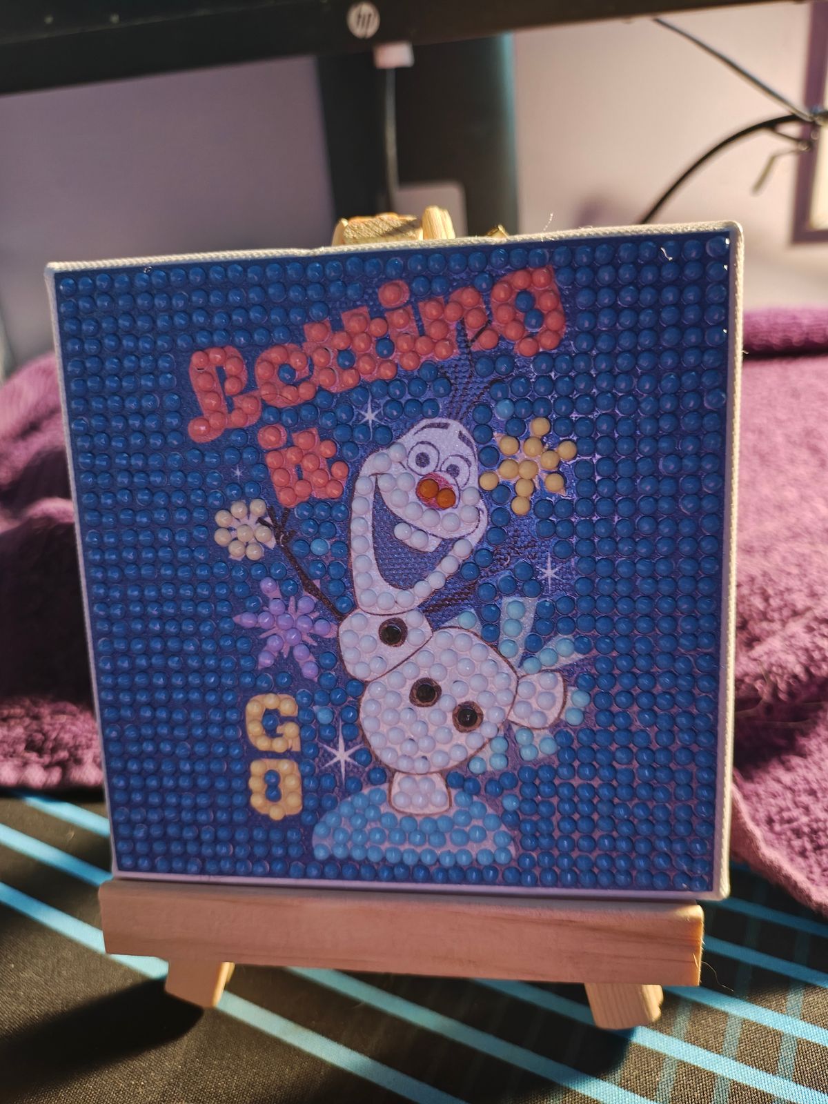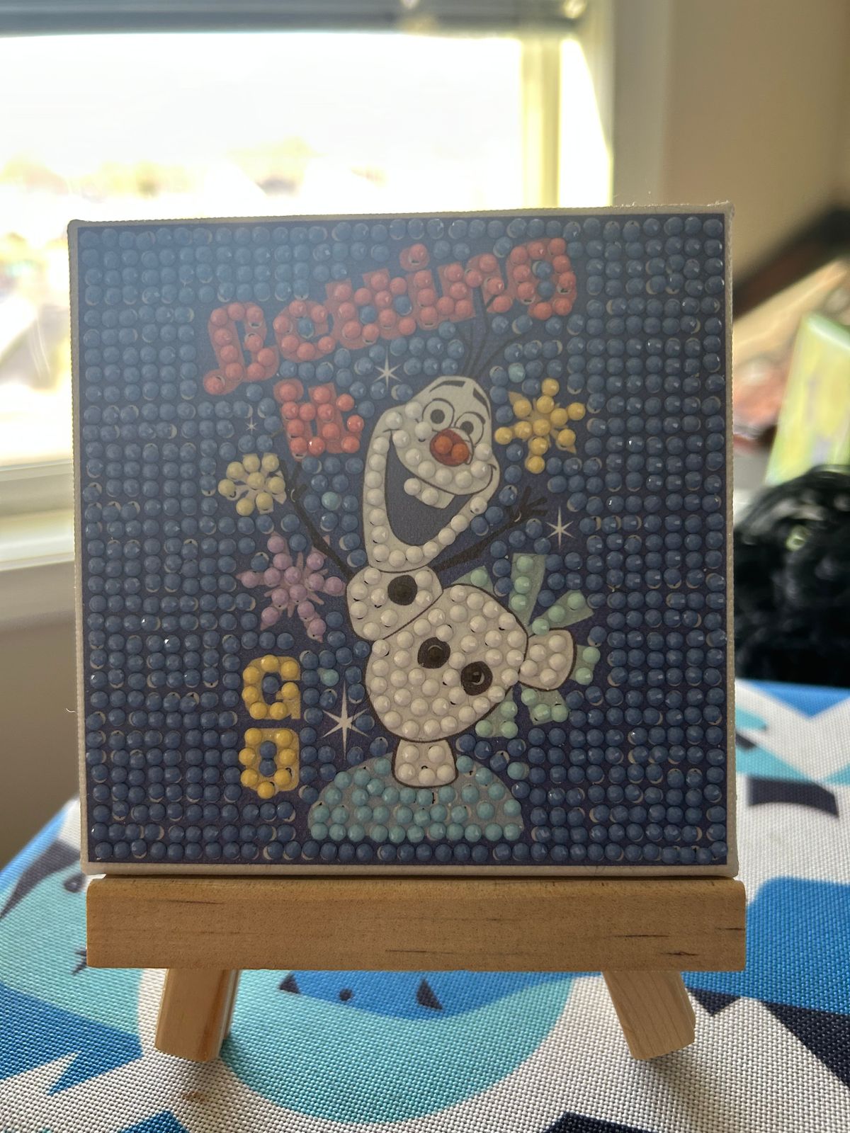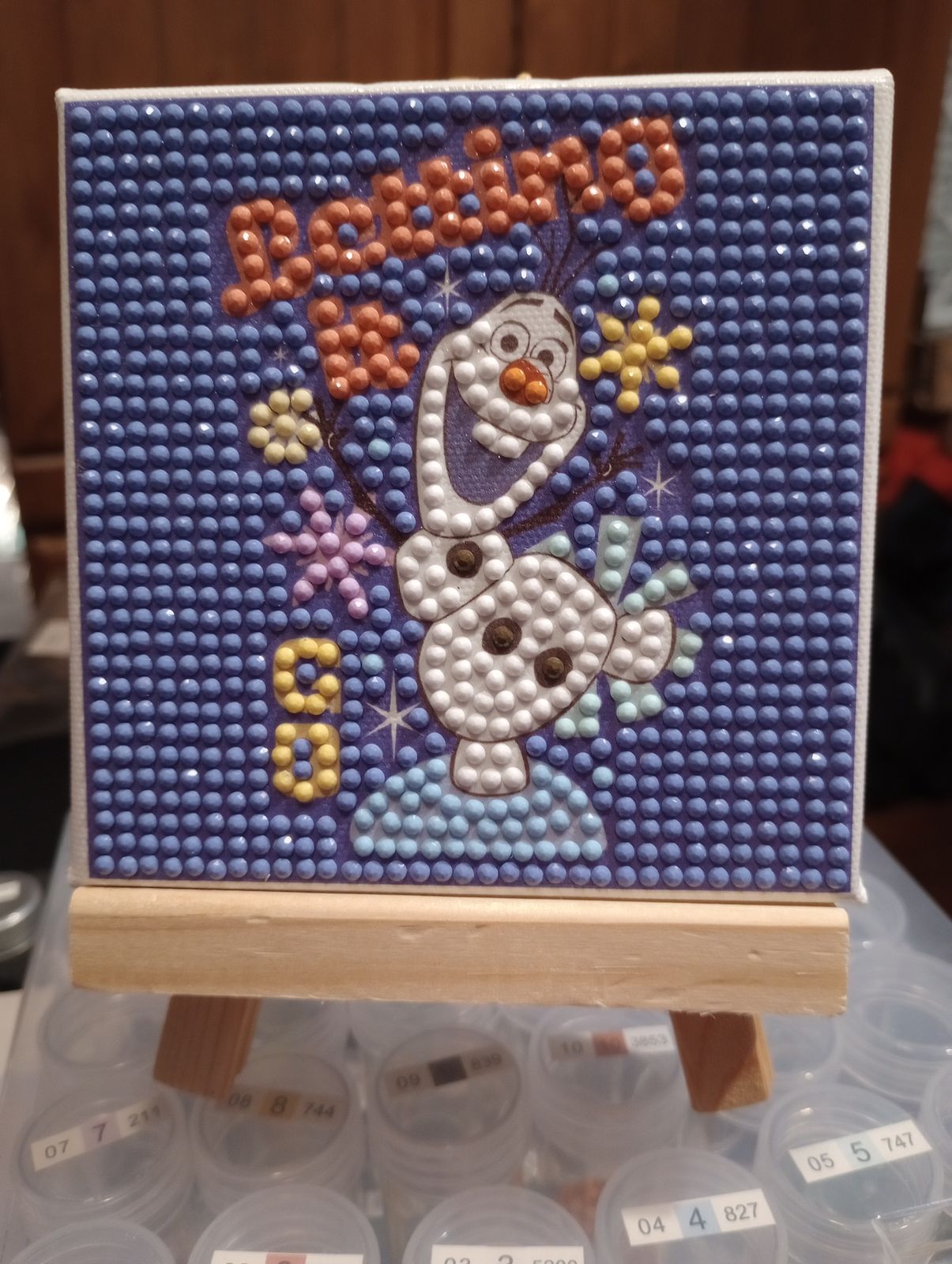 I will admit, when I saw this diamond painting online, I could not tell what that top word was. But, because I love Olaf, I ordered it. (I realized what it said right after purchase. Context clues.)