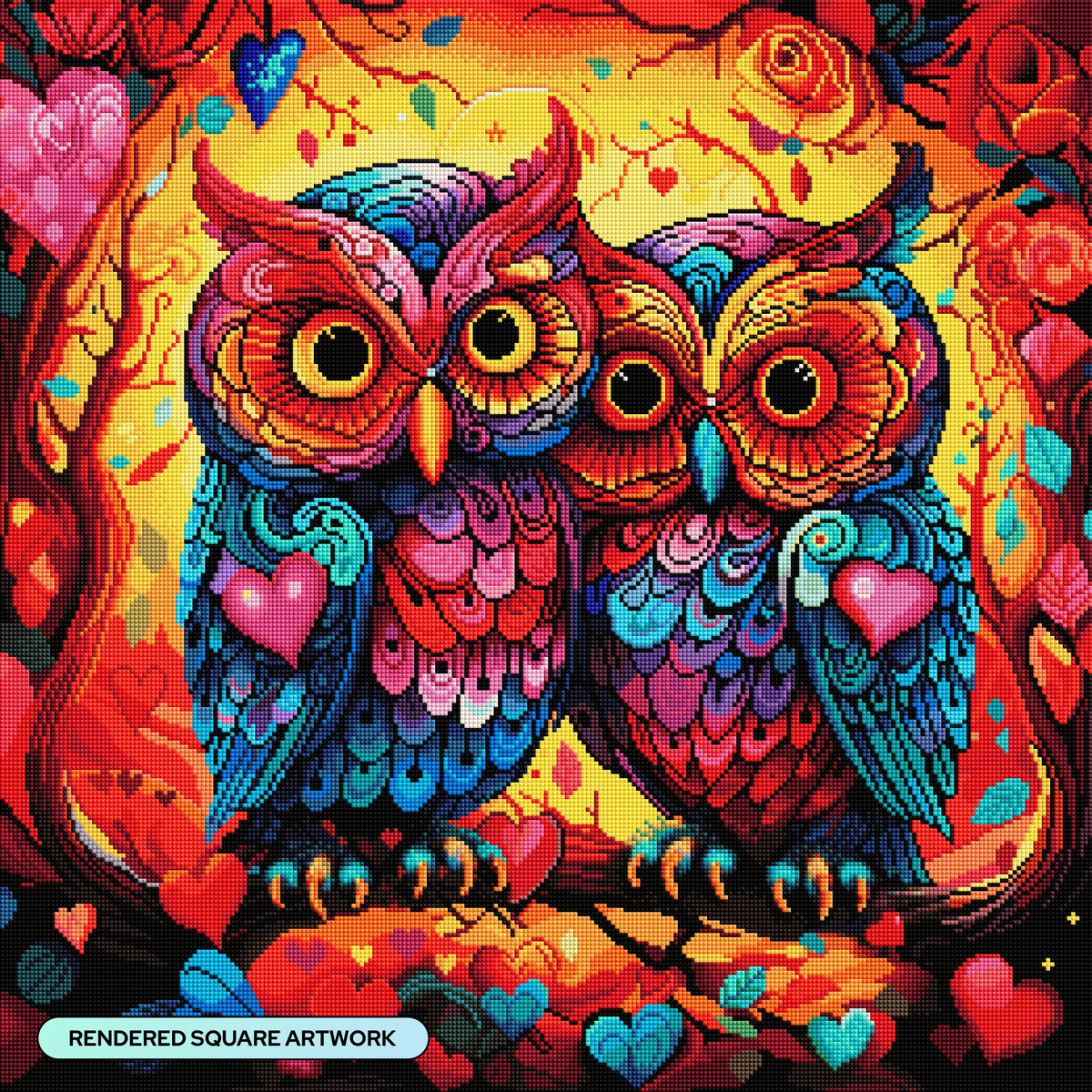 Pair up and perch together on a branch made for two. Love fills the golden air with bold hues radiating warmth and connection.