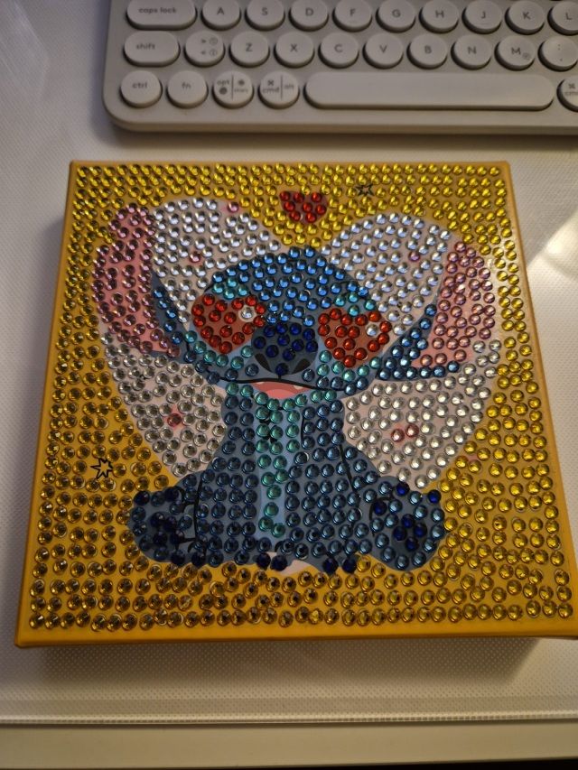 This turned out super cute and it was easy to complete in one sitting. It uses the bigger crystal diamonds, so I found using the prefilled pen that comes with the kit works better with these types of diamonds versus one of my nicer ones. The board material is strong and stood up to my placing, which can sometimes be on the harder side of things.