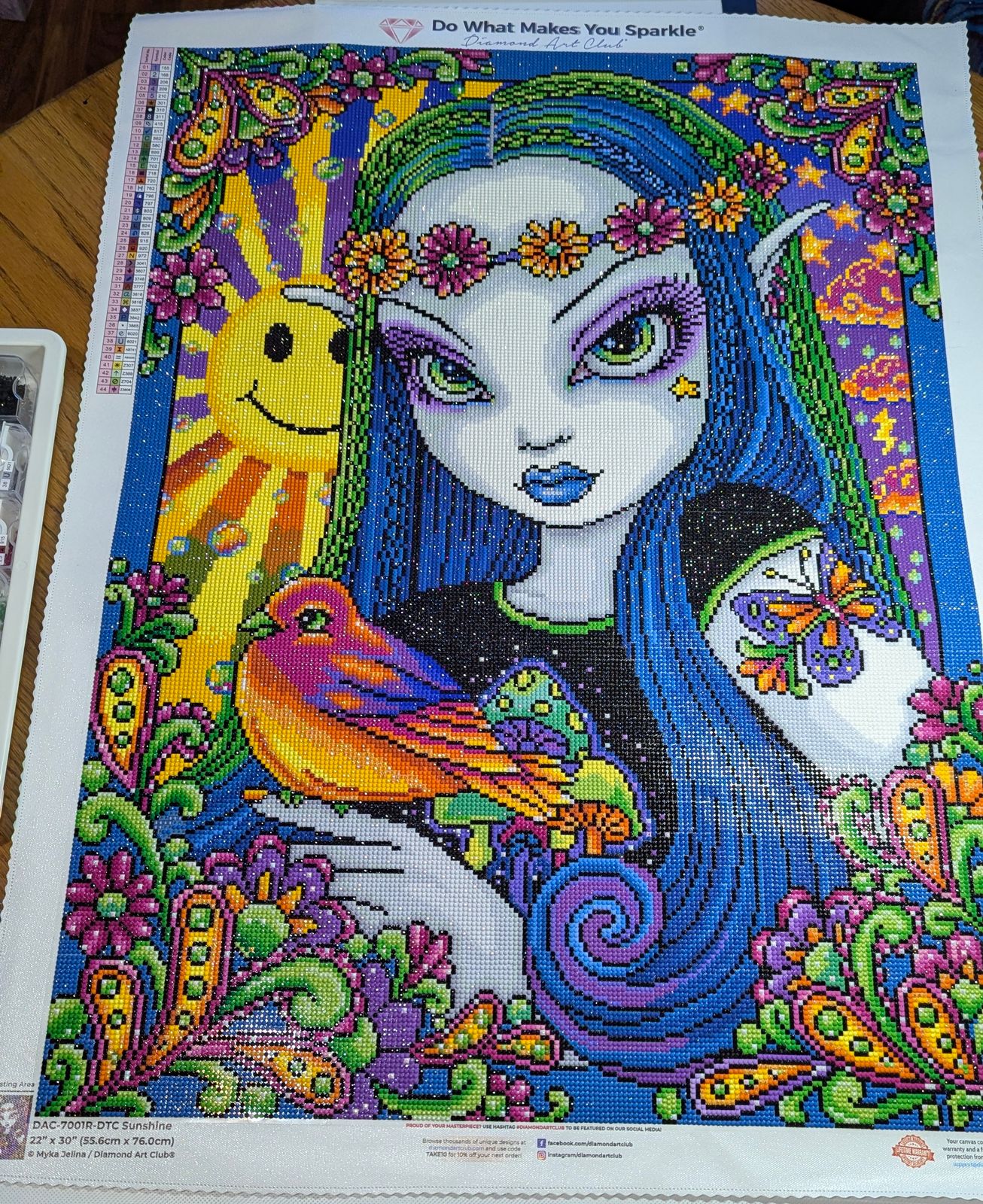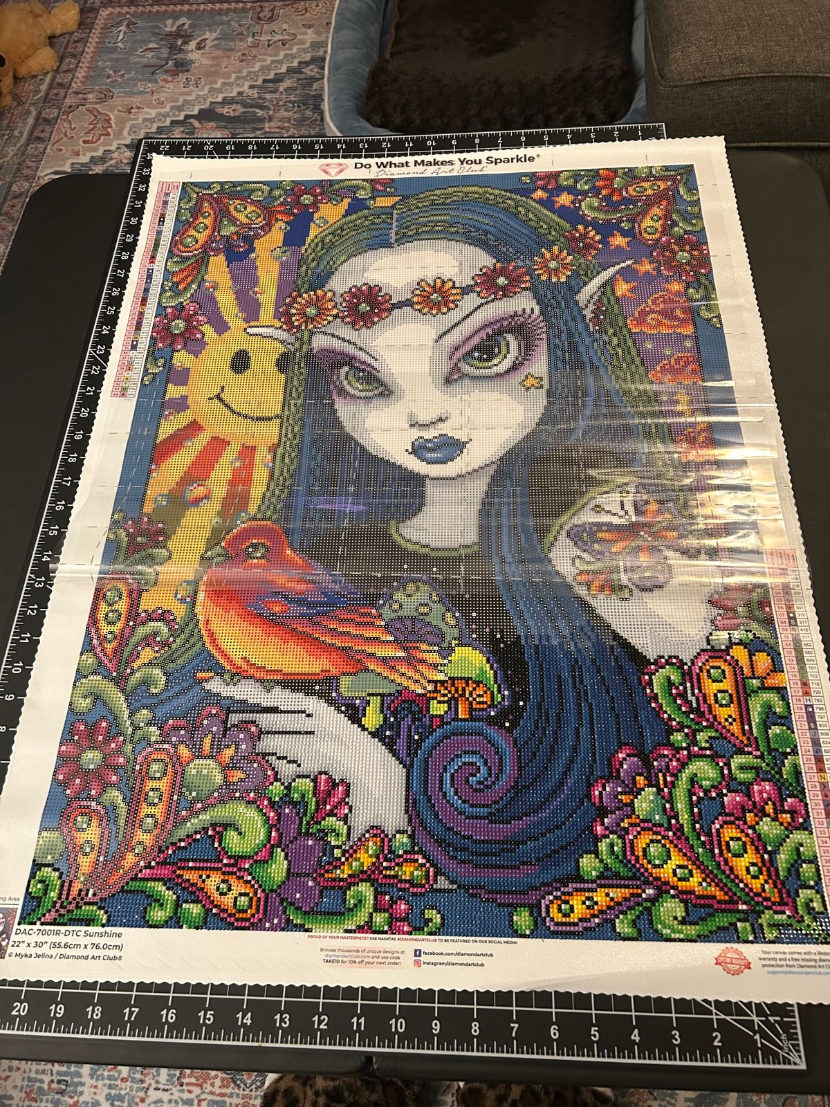 Finished "Sunshine" by Artist Myka Jelina from Diamond Art Club. Started 11/18/25 Finished 11/28/25. Took 11 days and 46 hours to complete. 22in by 30in. 55,752 total drills with 44 colors. Gifting to my daughter for Christmas.. absolutely the funniest painting I've done before. Loved the beautiful colors in this. 💜💜💜