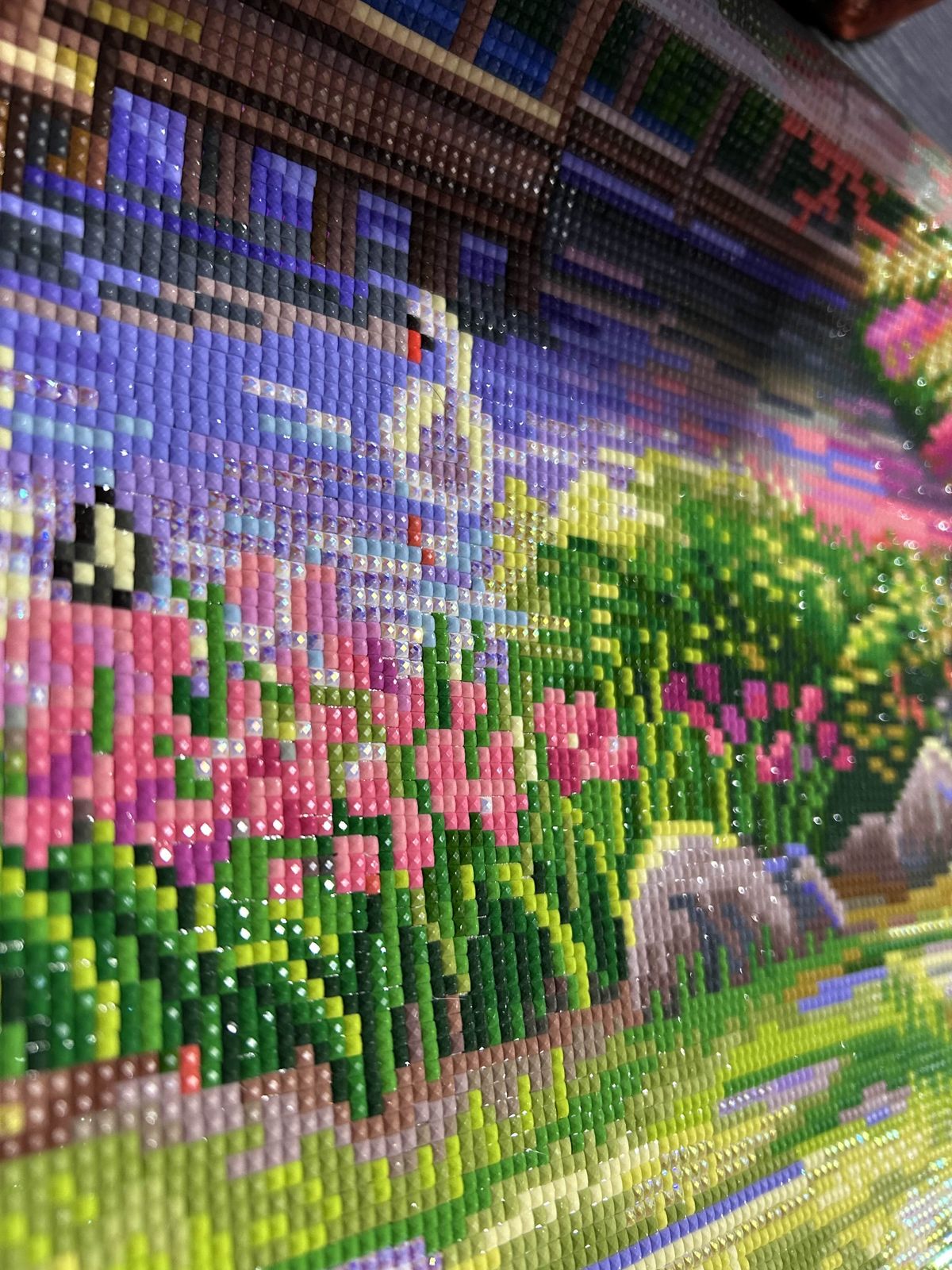 This was my first square diamond arts and by far the largest I have done. It is beautiful and very fun to do. It took me about 2 months to finish. Good quality as I have a small desk to work on and had to fold the canvas a lot and had no issue.