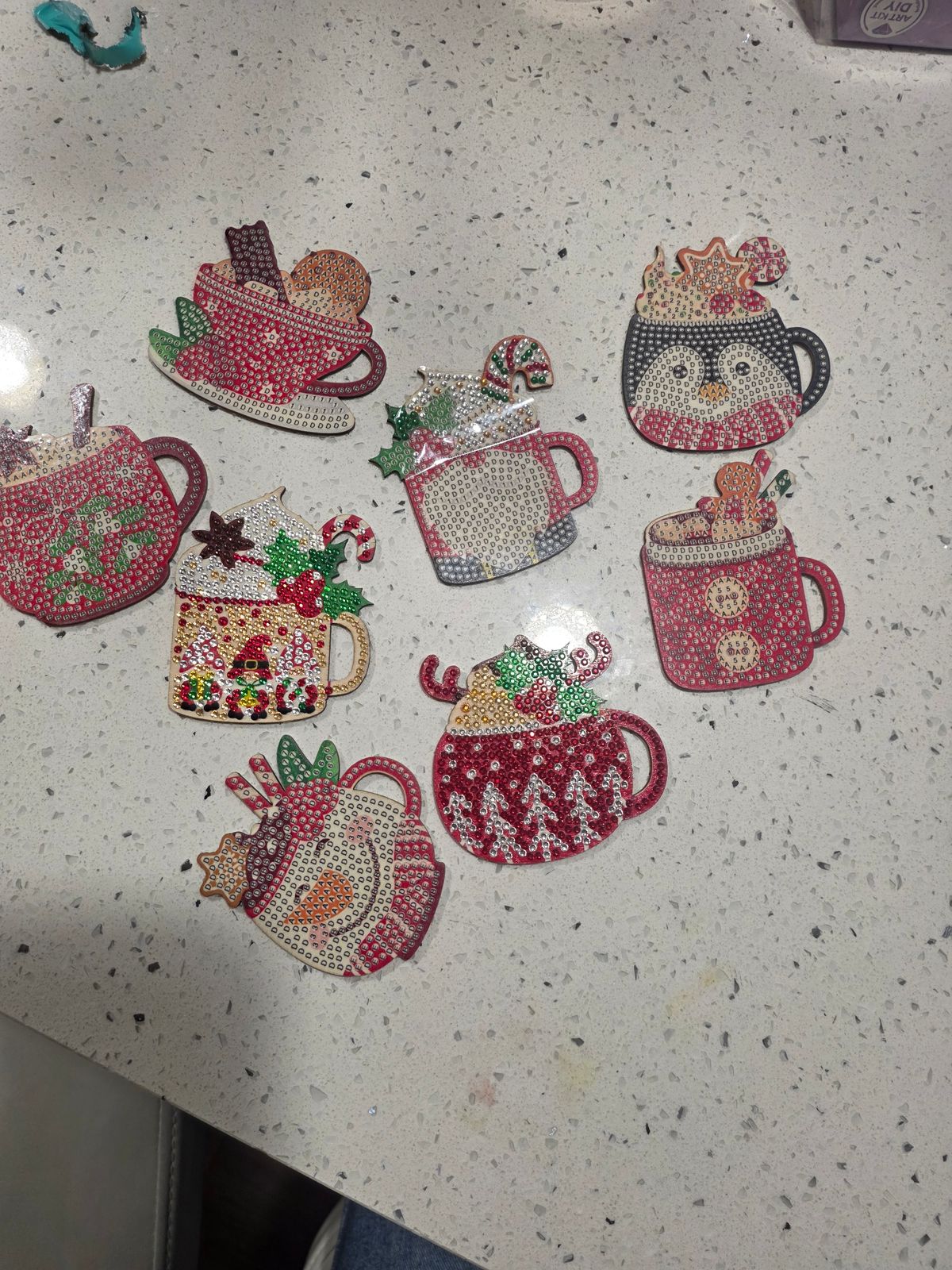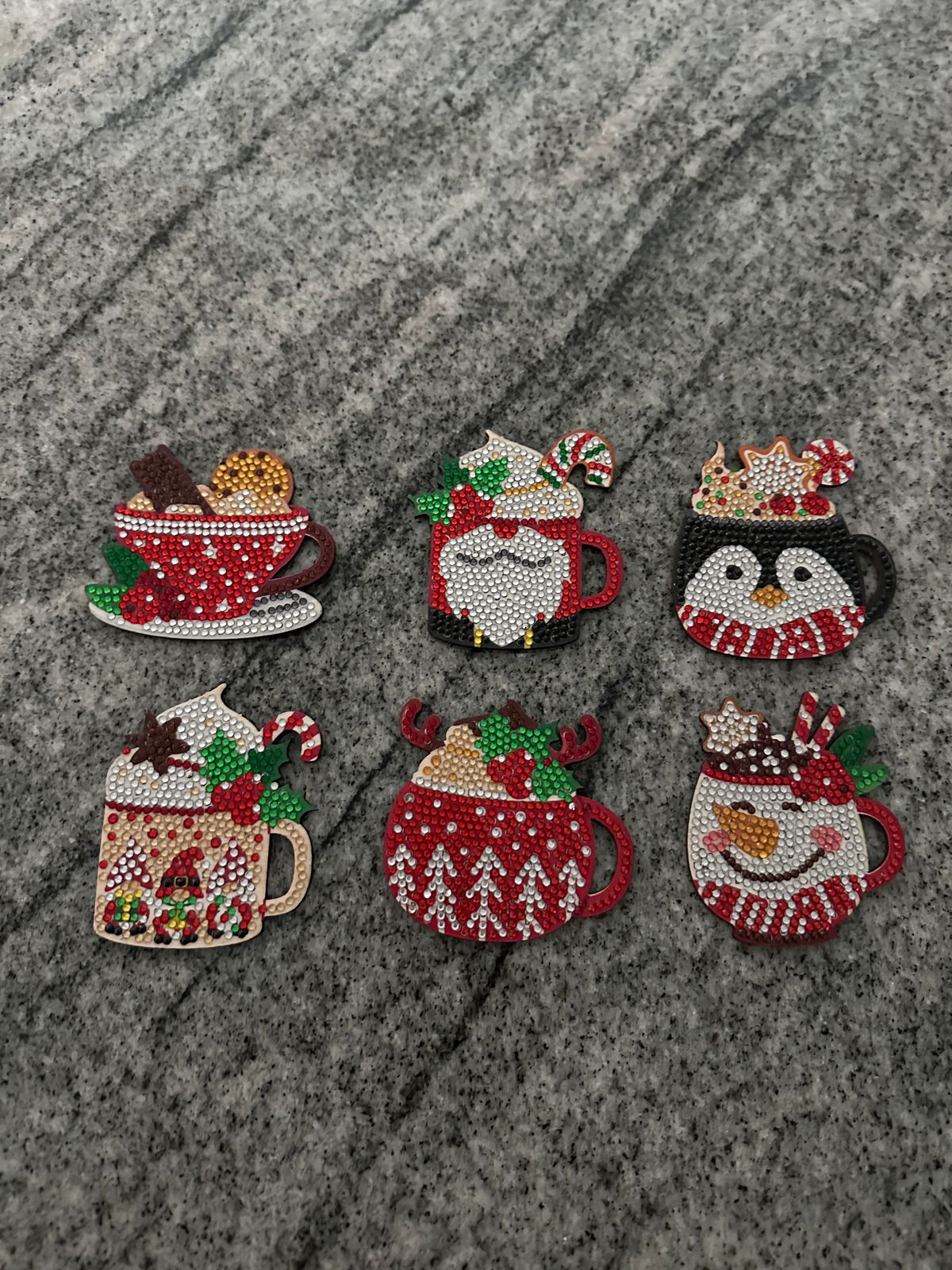 Cute designs that are quick to work up during the holiday season. My main concerns were the size of these, they are very small and won’t fit many mugs or cups. The backing to the coasters is a wood material that is rather thin and has chipped in some areas. Also don’t love all the exposed glue that remains in the gaps of the drills.