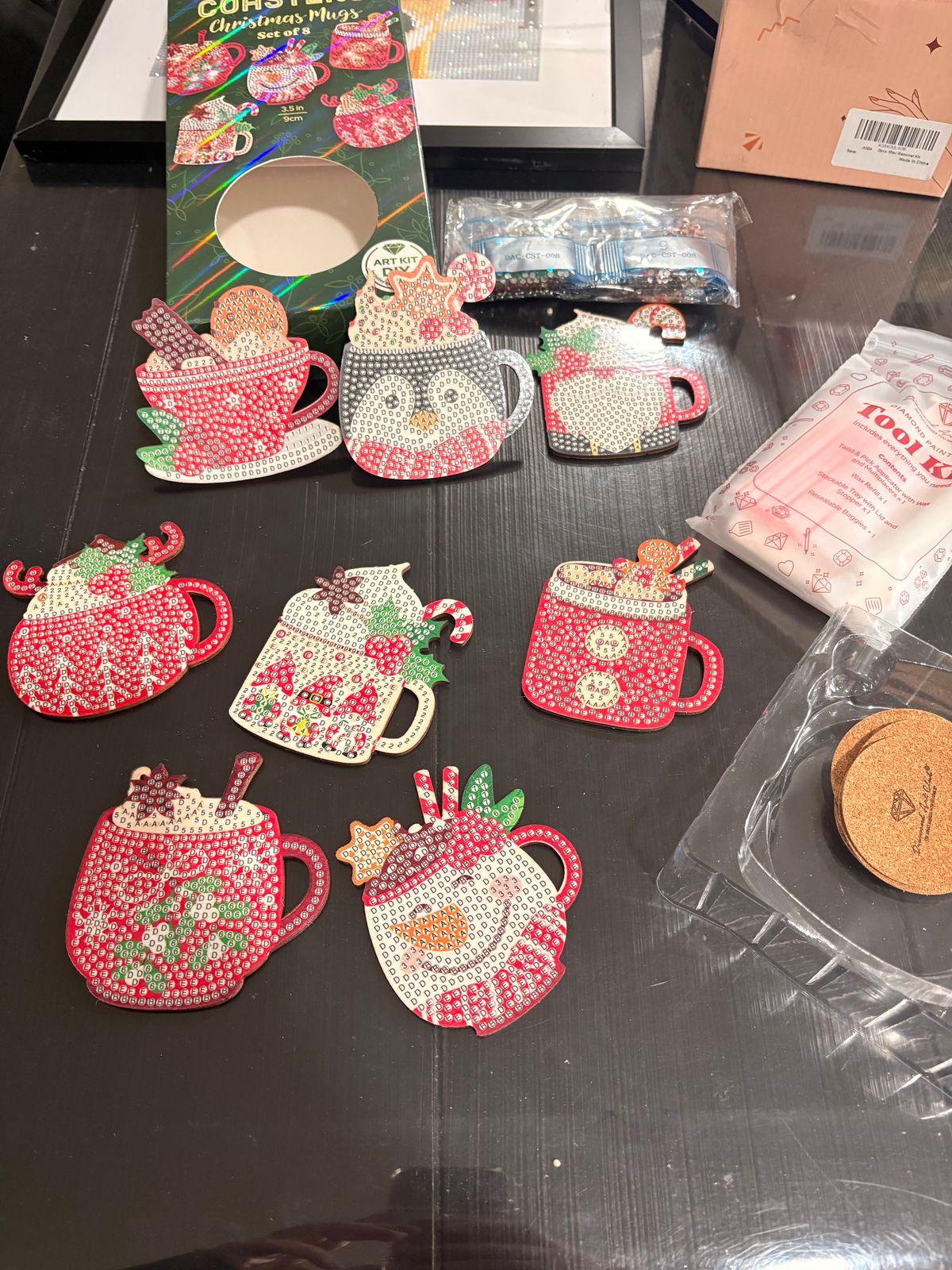 Came with 8 different style mugs. Super quick and easy to have it all come together. Most all drills are crystal and makes for a beautiful shine.