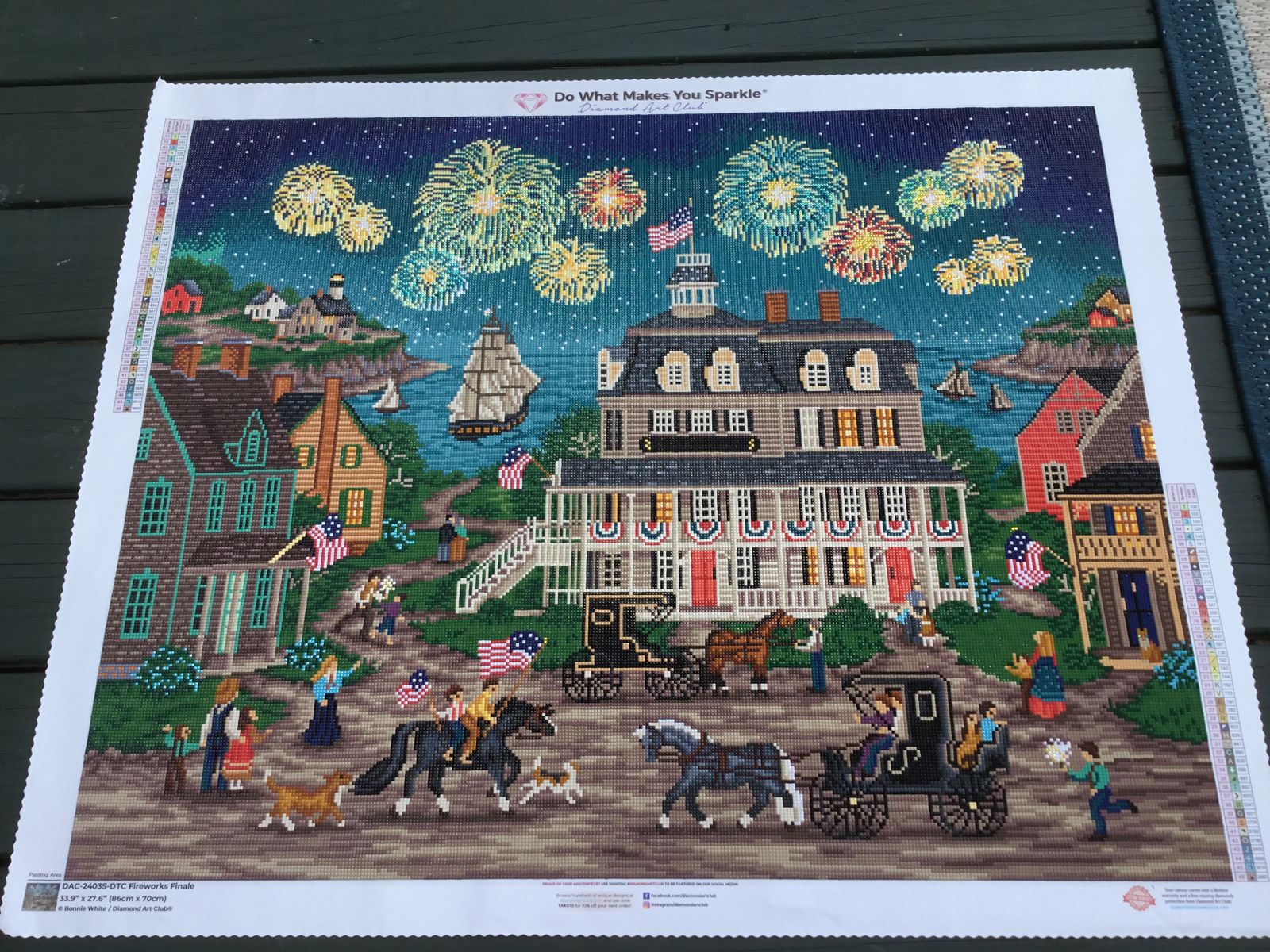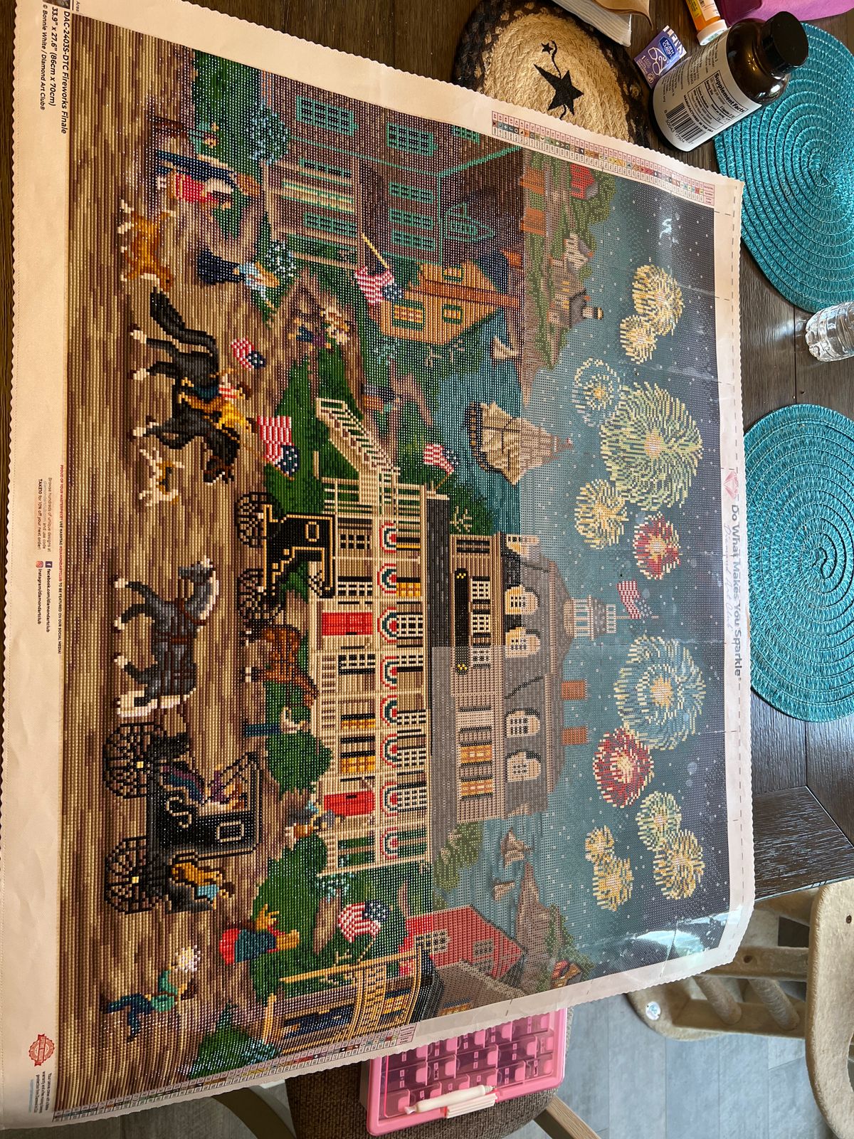 I am a suckered for sparkly things. That got me into the craft of diamond painting. I had seen DAC ads and decided to buy a big canvas. I have been doing diamond art for a few years and the Bonnie White canvas "Fireworks Finale " really caught my eye. My first DAC kit, my first large kit, my first square drills kit, not to mention my first time kitting up and multiplacing. I whirled through this beautiful canvas and enjoyed every minute! The canvas itself and everything included with it was top quality and made the expense of the kit so worth it! If you love a sparkly bit of folk art, I would highly recommend "Fireworks Finale. " Of course I have just HAD to buy several more DAC kits....