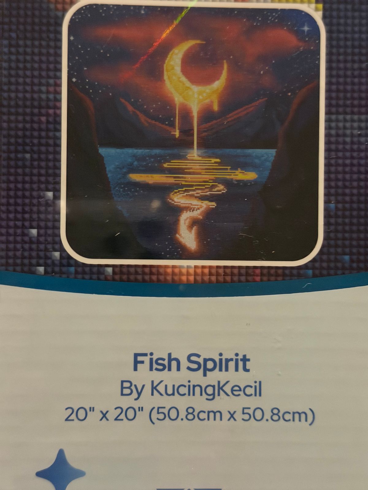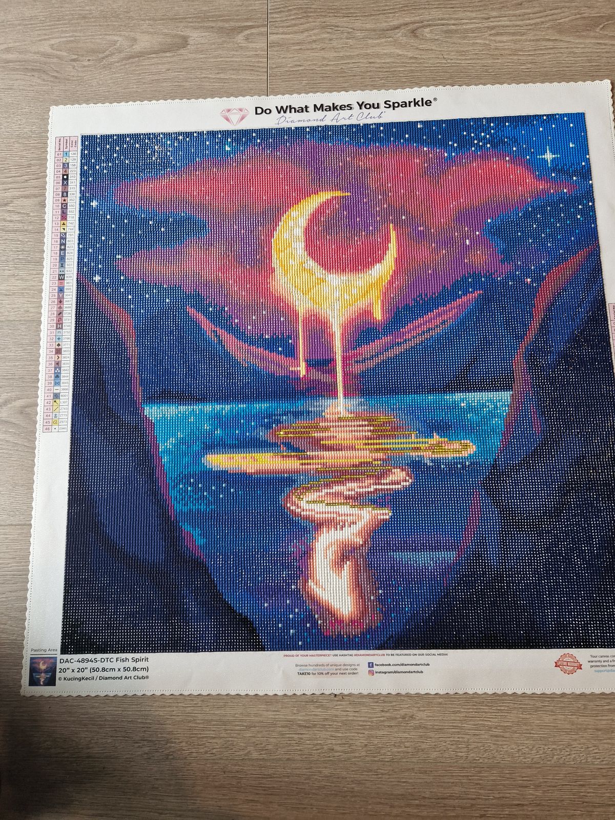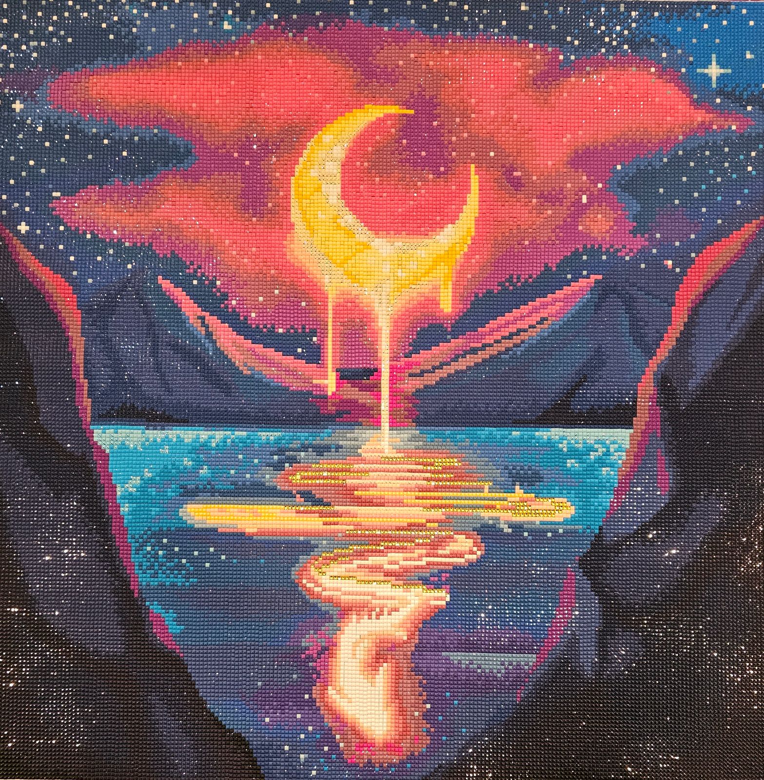 I loved doing this piece. It was relatively easy, not a ton of confetti but not so much color blocking that it got boring. The only thing I don't like is the colors in the water from the dripping moon. The shiny drills look really pretty, but the pink and purple around it are a little weird and don't really look like the reflection I think it's going for. From a distance it looks much better, but maybe consider color swapping if it bothers you!