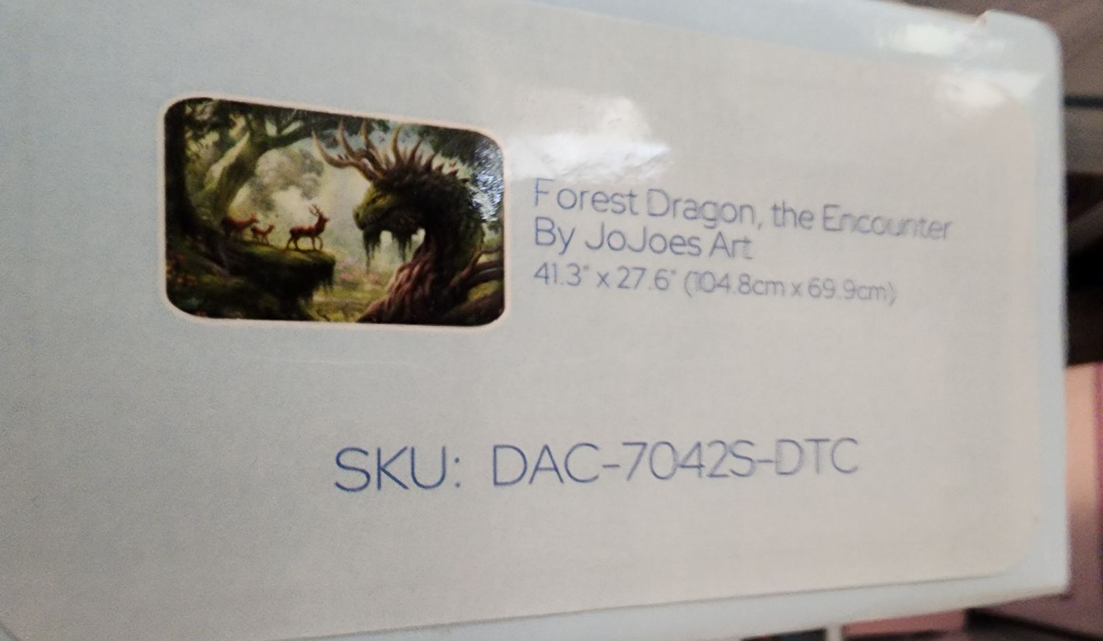 This painting was a joy to complete. The subject matter combined with confetti and subtle colors made for an enchanting diamond painting experience. I was so pleased to find a frame that mirrored the dragons horns.