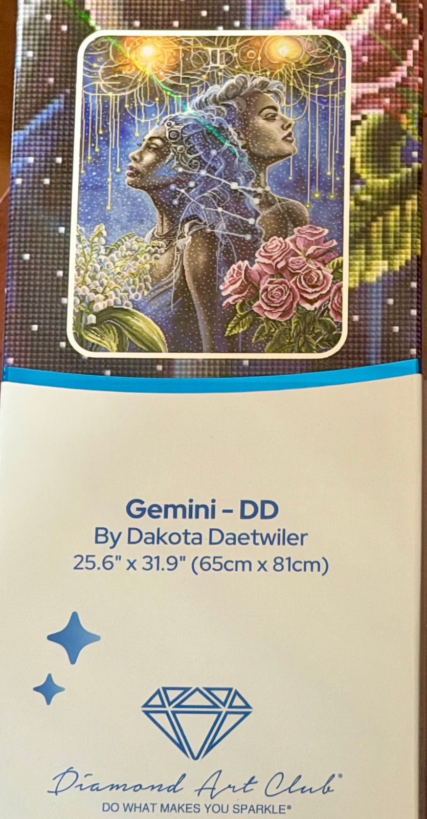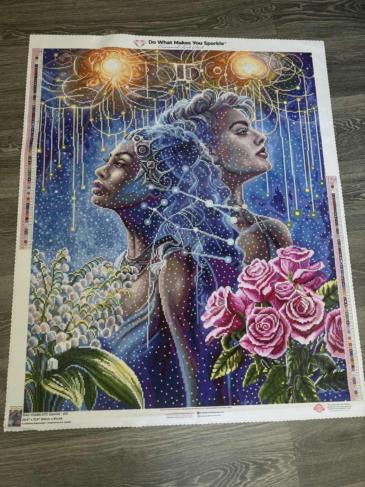 This painting is a perfect representation of Gemini. The rendering is good, although I did make a few changes in some areas to make things look a little neater. I had no problem with drills, but there was a small area that had blurry symbols and the glue was not very sticky in a couple of spots. I used enhancement drills that I purchased separately to amp up the sparkle and shine of the painting. I also changed the color of the jewels in the crown because they're supposed to represent the birthstones for May and June, but the colors in the rendering don't reflect that. Overall, it's a gorgeous image and one of my favorites that I've completed.