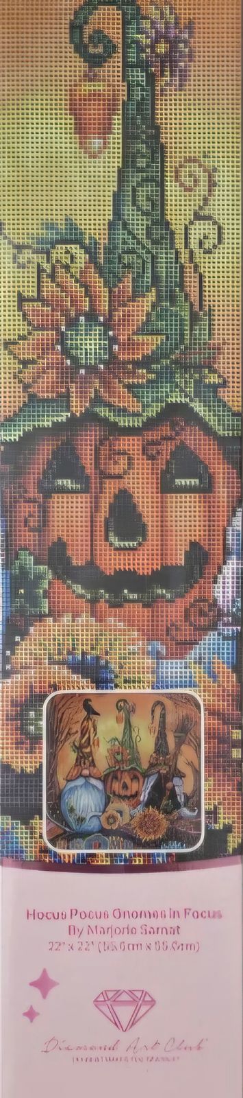 Join the whimsical gnomes and their pumpkin friend for a spellbinding Halloween night! Let the magic of candy corn and vibrant flowers enchant your senses.