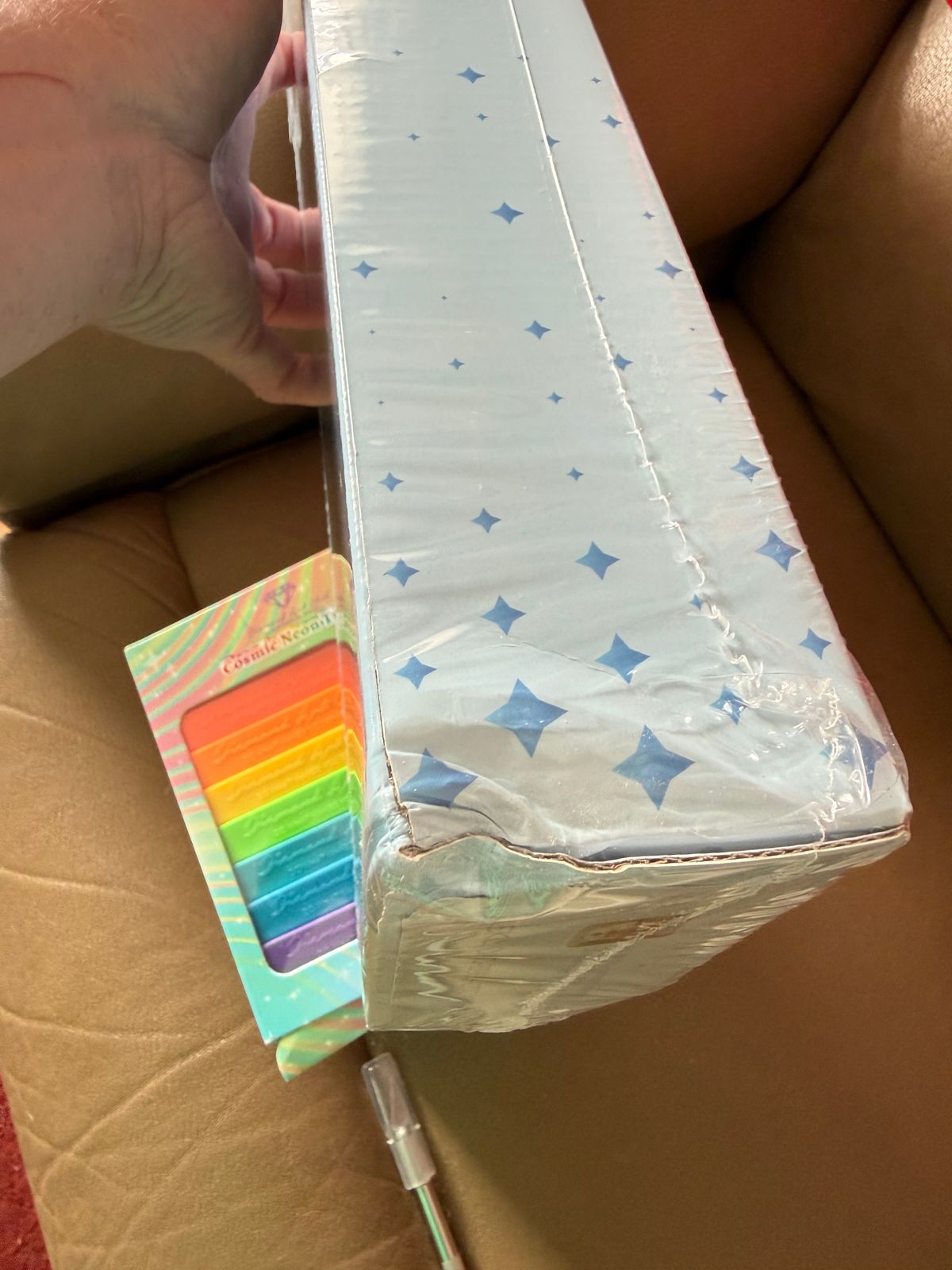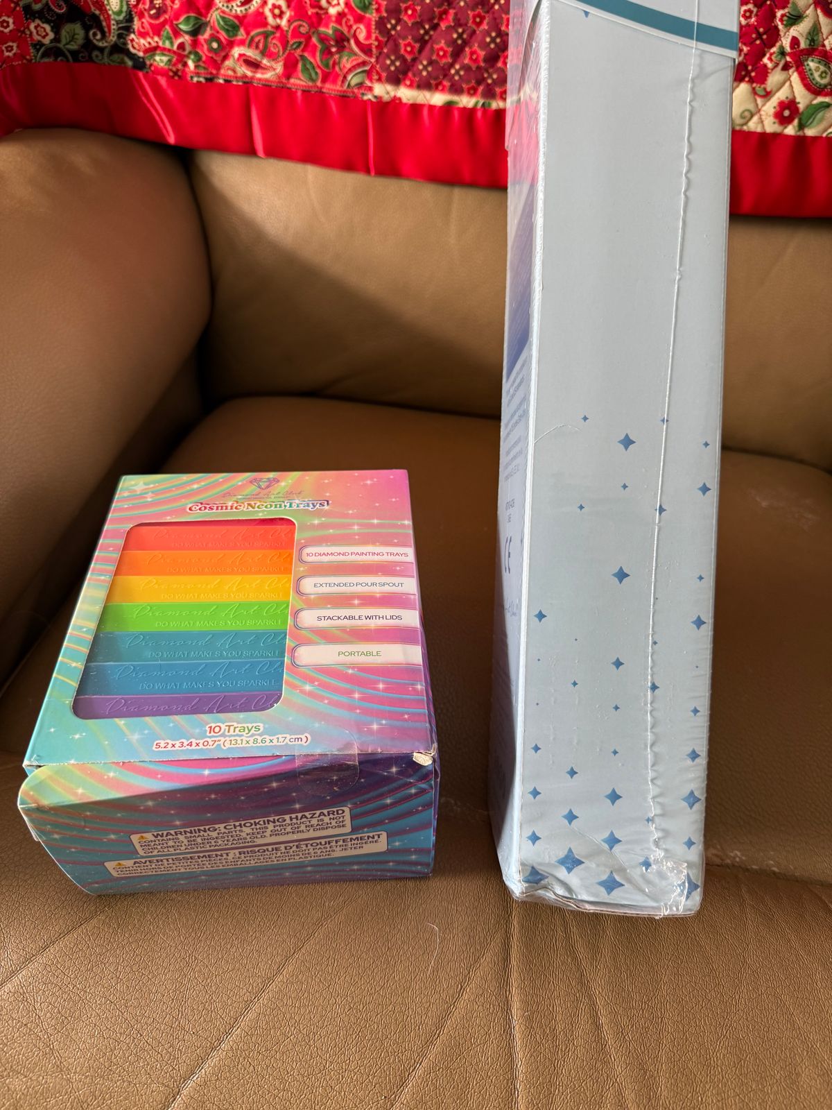 This mystery kit arrived in a box with one other item and the outer box was beat up pretty badly and the box that both items were in were damaged as well. I opened this kit to make sure the contents were okay and everything is fine. I noticed the colors of this mystery and I would describe them as kind of muted. Based on the description of this kit I imagined it to be darker “outer space” colors with bright cosmic milky way colors because the canvas dropped with the neon cosmic trays which are very bright and colorful. Either way I’m excited to watch it unfold and discover what it is. I love mystery kits!