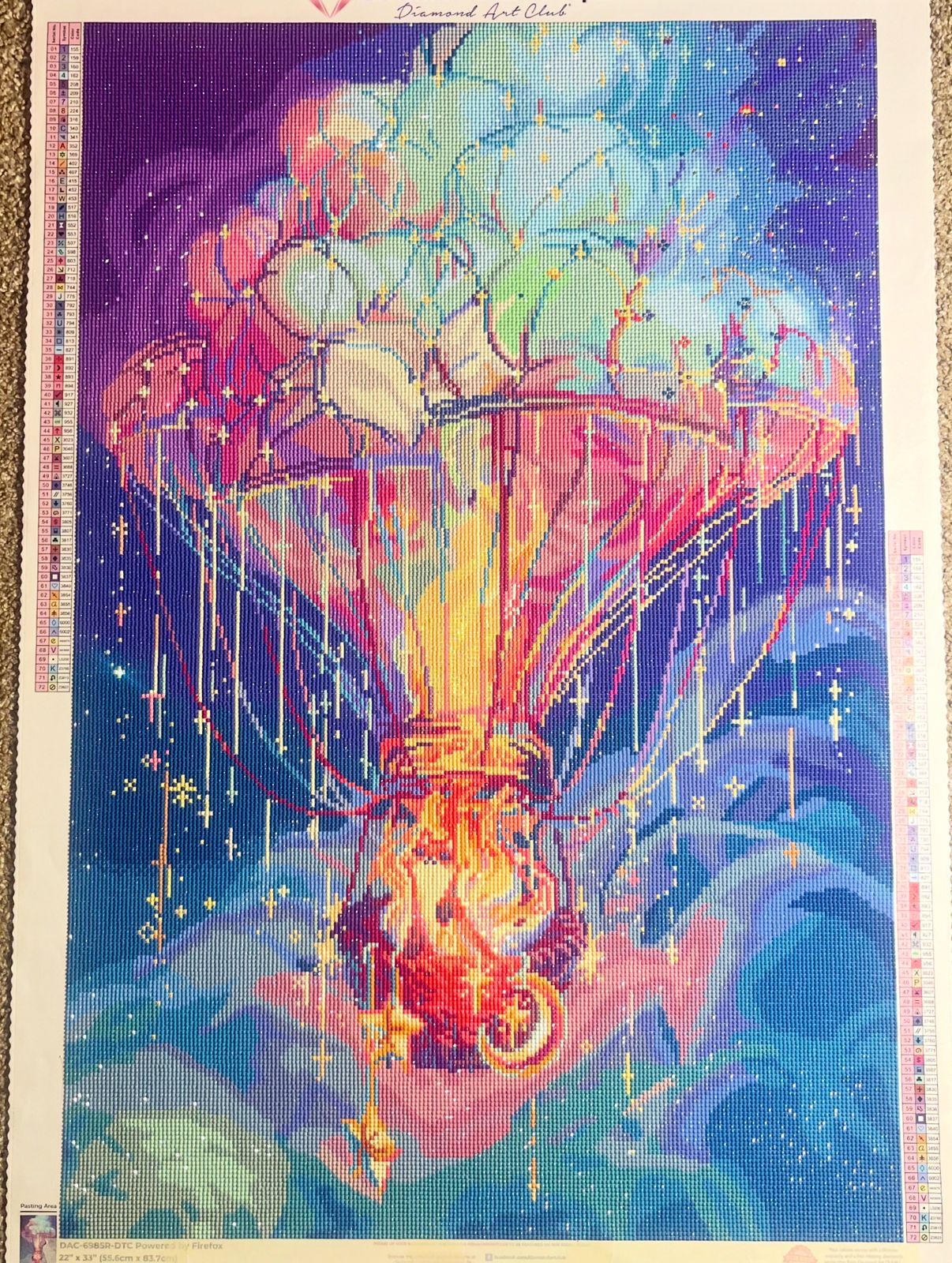 i am so happy i purchased this off my wish list when it restocked! the colors are SO bright and beautiful in person. i love all the different hues, there is such an ethereal vibe. this was a fun canvas to complete and went much more quickly than i had anticipated! i enjoyed the round drills, and how there was a good balance of color blocking the sky and confetti with the hot air balloon!