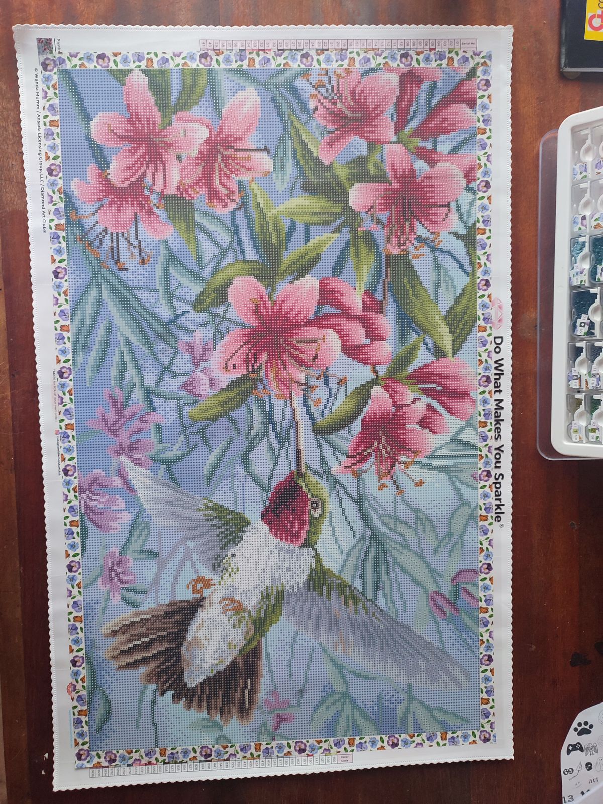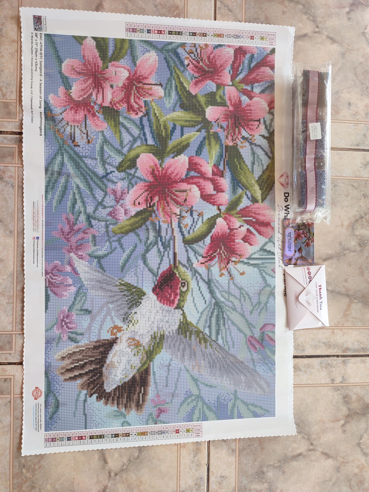 This is a beautiful canvas with two subjects that are near and dear to my heart: flowers and hummingbirds. Though it's just a snapshot in time, I am moved with emotion every time I view the image. I cannot wait to start it. Diamond Art Club equips each kit with all of the essentials required to bring a piece to fruition, which is great for first-time buyers. Thanks, DAC.