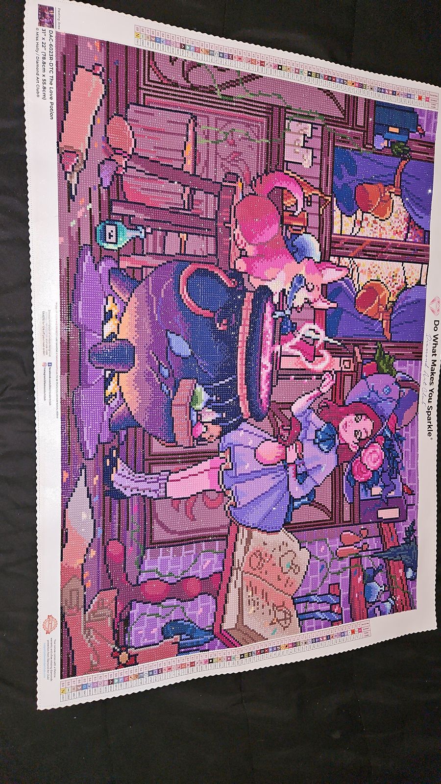 I love how sparkly DAC’s round drills are because this kit shines. The rendering on her face is particularly well done. All the details, like the bottles, turned out well. A lot of color blocking in this one so very enjoyable to work on.