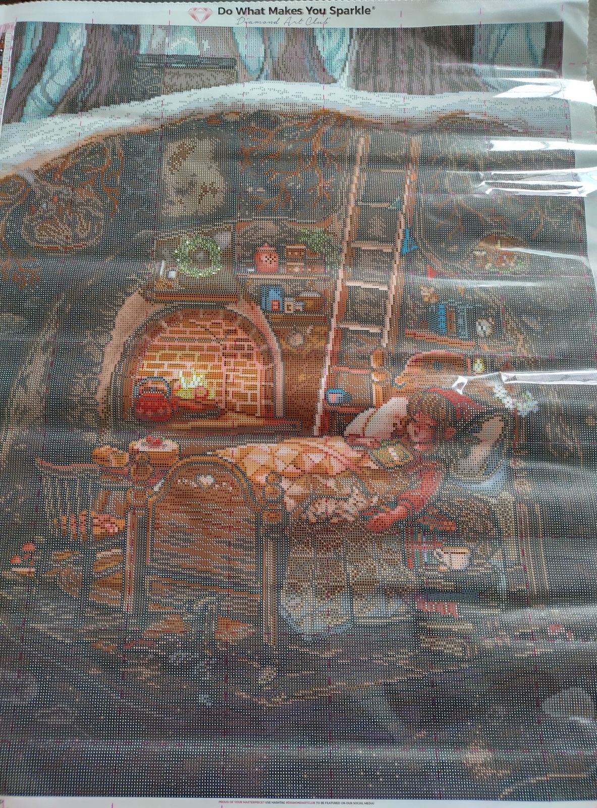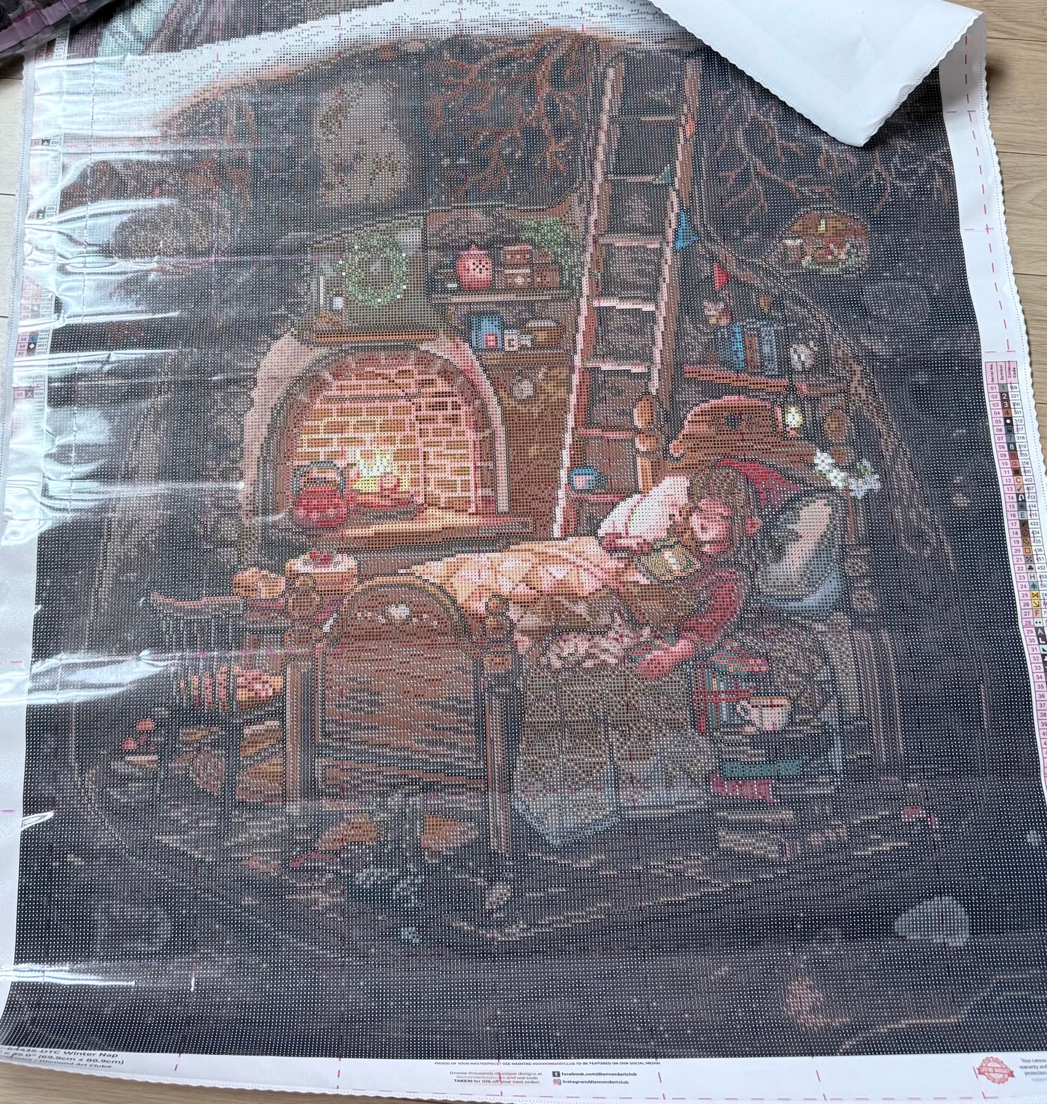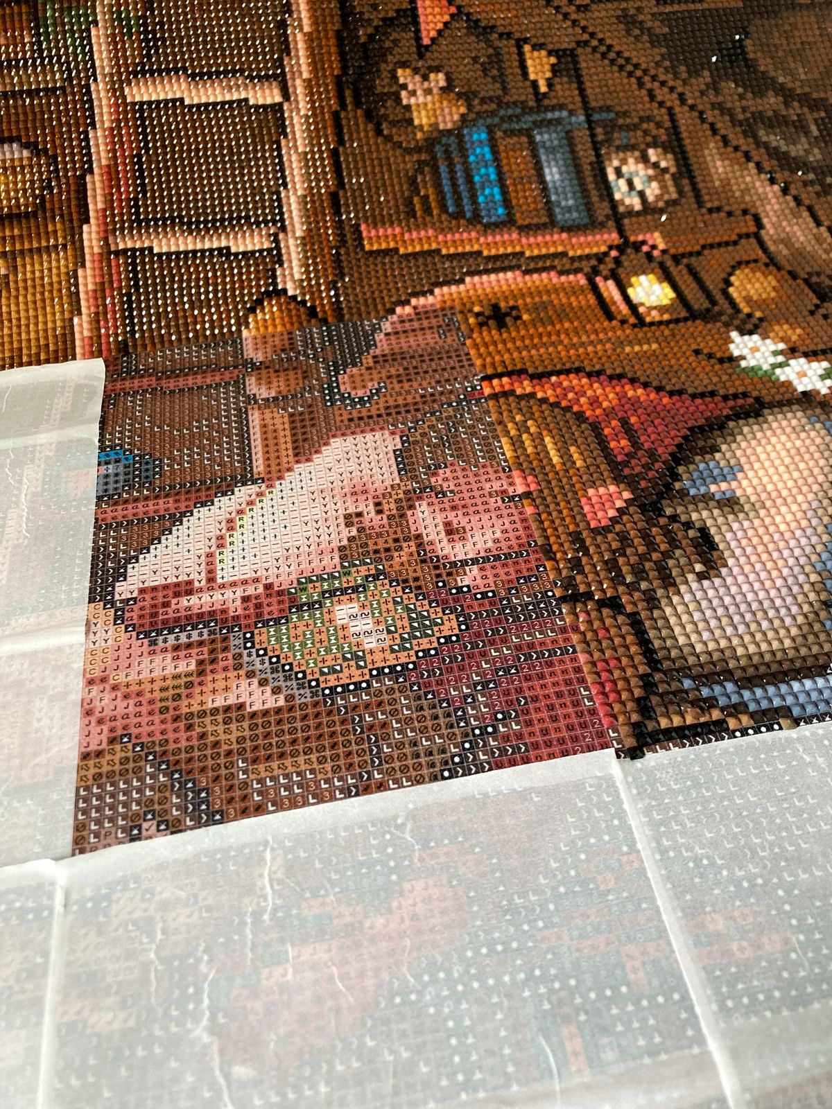 When I first saw the design I was mesmerized because I love the serene feeling it gives me, with the twigs crackling in the hearth, and the books, almost have me feeling as cuddly as the cuddling bunnies. I love this illustration so much that I kept sending it to my friends and telling them about it☺️ Even though it's summer right now where I live, I love how investing my time into making this piece transports me to a serene winter. Perhaps it's the peace diamond painting gives me that calms me down! ❄️ It's also the very first canvas I purchased that measures so large, so it proves a bit challenging but I have enjoyed the process of revealing the gorgeous design bit by bit ✨
