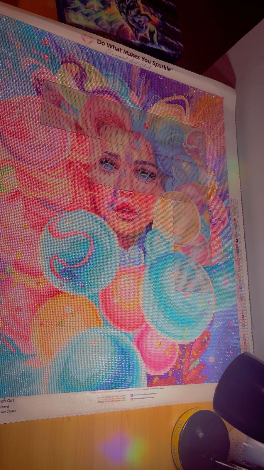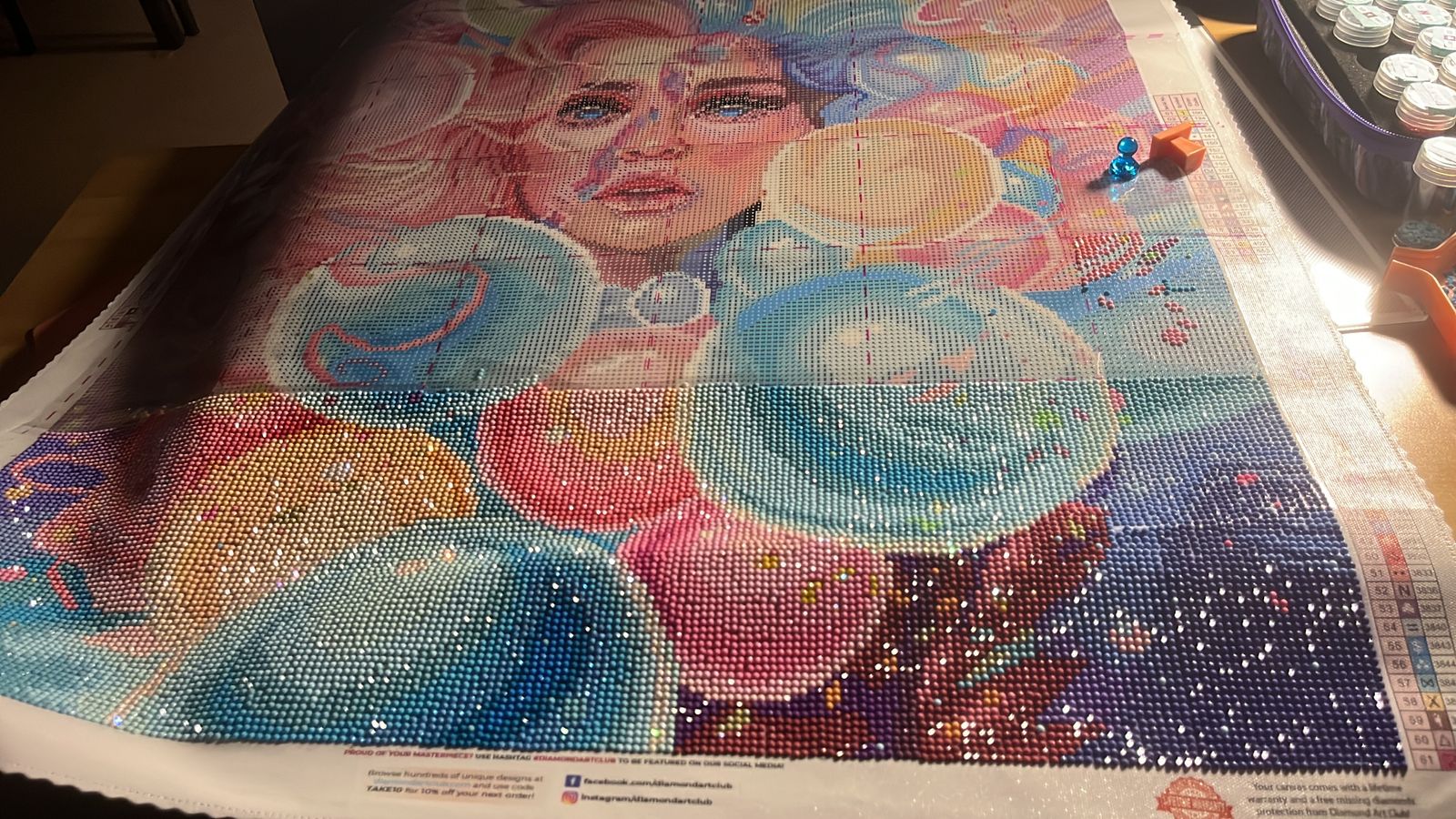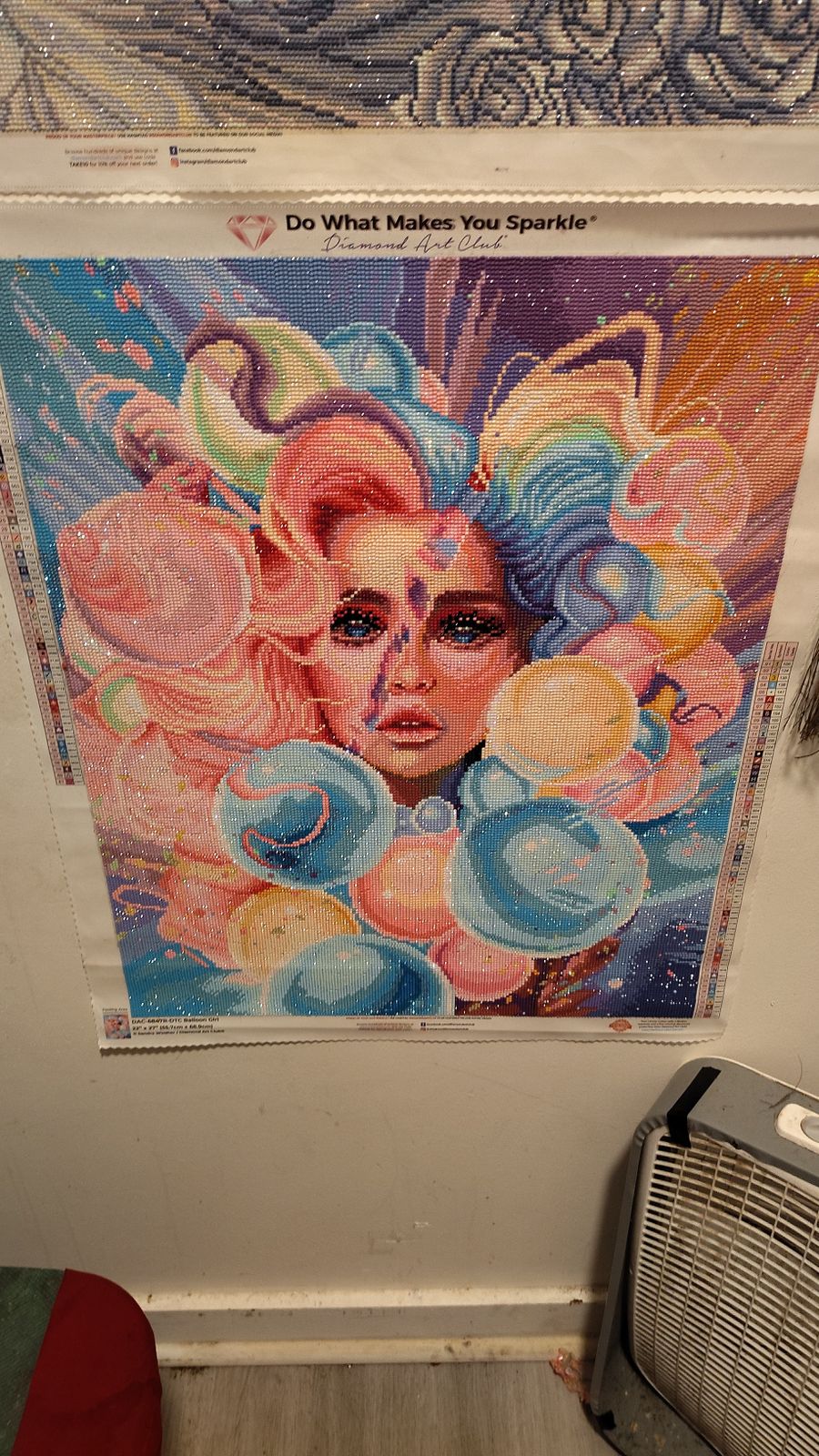 This was my first ever diamond art painting she isn’t finished as of yet. I’m just waiting on replacement colours to come in as I ran out but she’s still beautiful. I am obsessed and from now on will strictly be ordering from diamond art club now I see what the big hype is the quality is amazing.