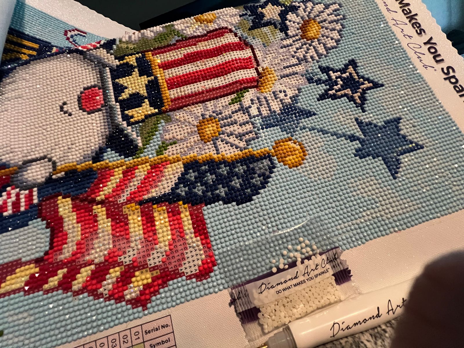 This is really only my third WIP that I recently finished just in time for America’s Birthday. I love the colors, the round drills and the sparkle of each and every drill! This is a great beginners -Intermediate DAC piece. Highly recommended 🥰