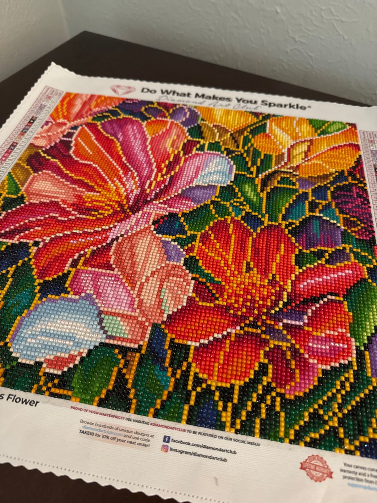 I did this as my first diamond club. It was beautiful canvas but I didn’t feel like it was as sticky as it should have been. Many times I found I had to restick the drills. That took a bit more time than I thought it should. I am finished with the painting and am very proud of it. It’s beautiful
