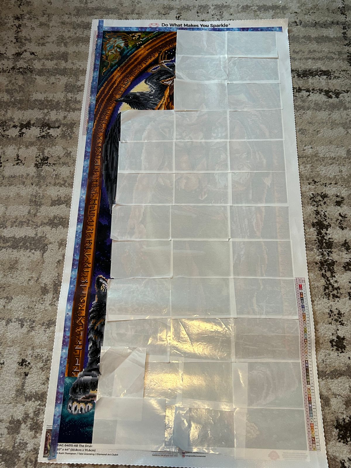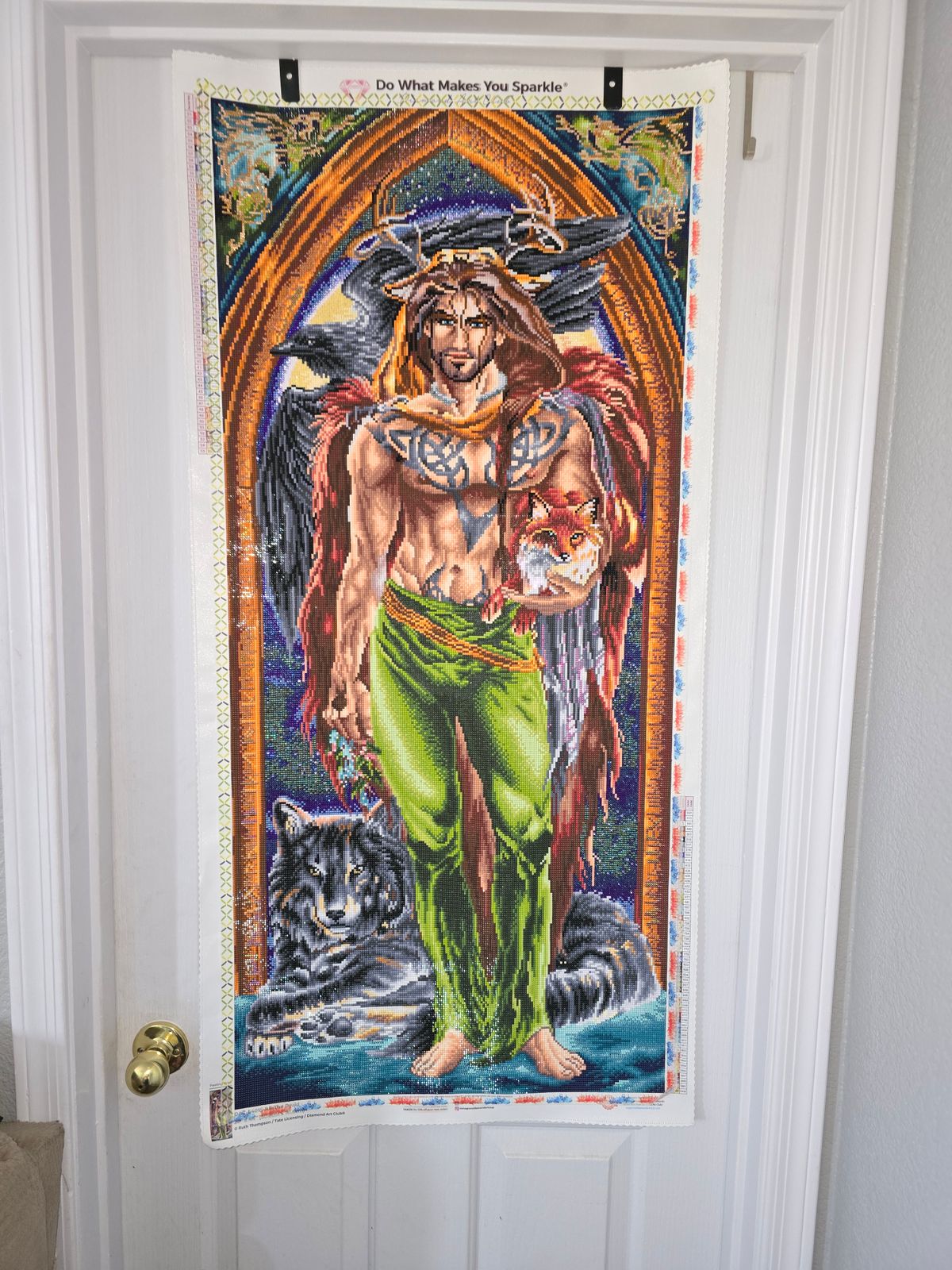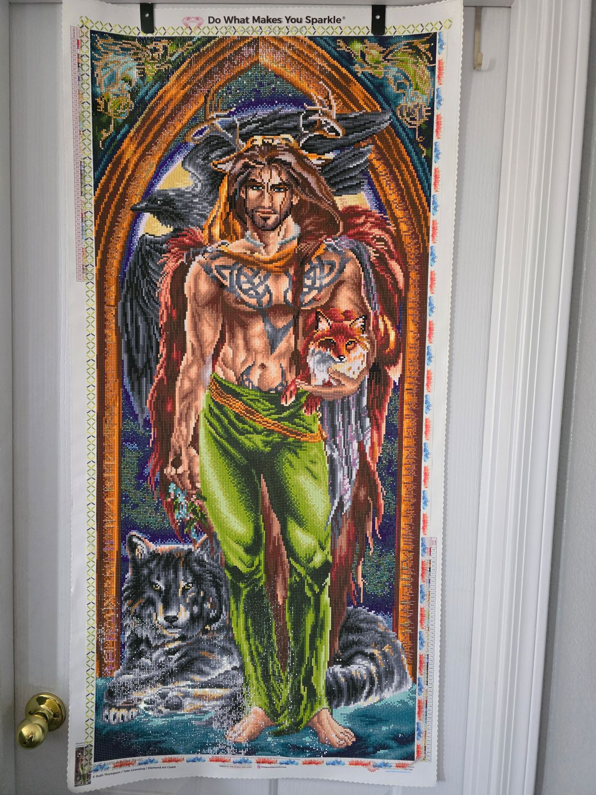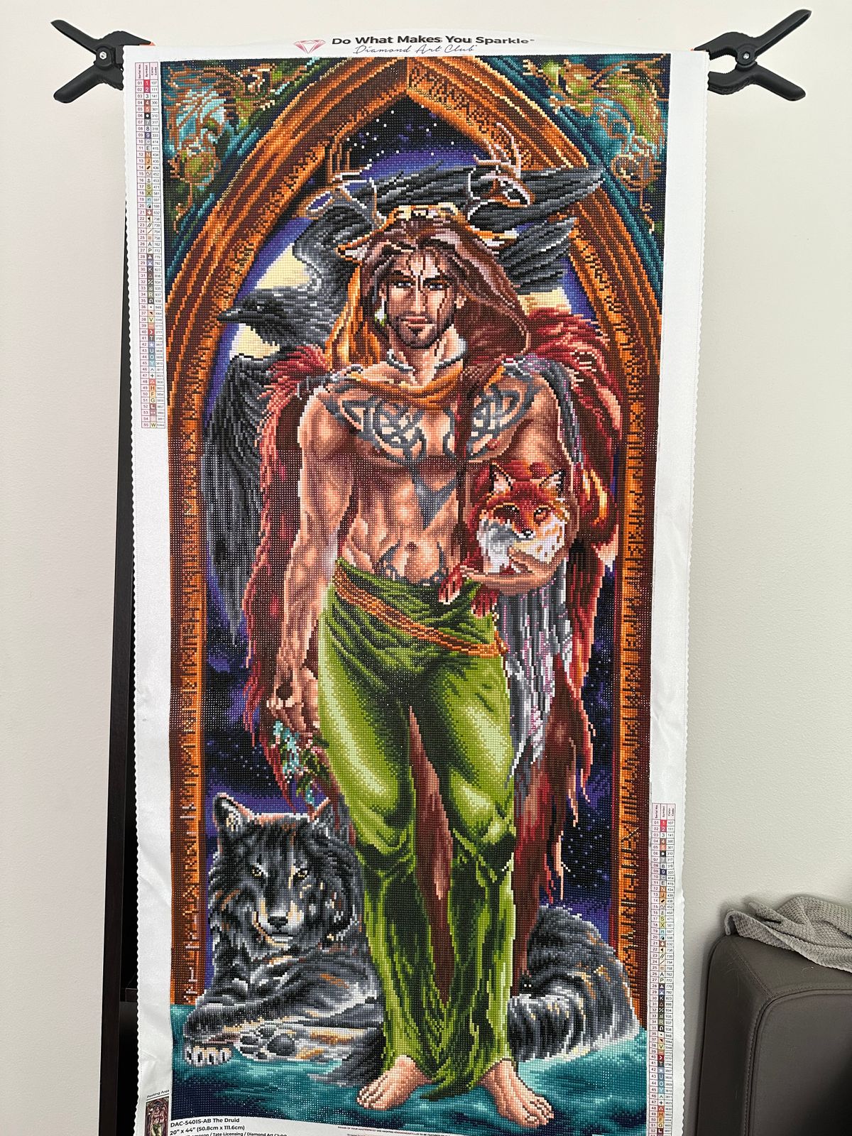 This was so much fun to do. It took me forty-four days to complete, and I have to say he turned out beautiful. With the animals around him...especially the wolf at his feet, just stunning! I will say that out of fifty-five colors, the vast number of drills were clumped together. Since I don't have a grinder, I used two little green trays to separate them. They worked fine. I'm not saying this was bad, just a small irritant. Has anyone else had this problem with the drills? Will it stop me from diamond painting, no it will not! I love Diamond Art Club and have already purchased another painting, and also waiting for another to come back in stock. I'll grab that one as soon as I'm notified. I also hope Ruth Thompson does a painting of a Druid woman. That would be awesome!