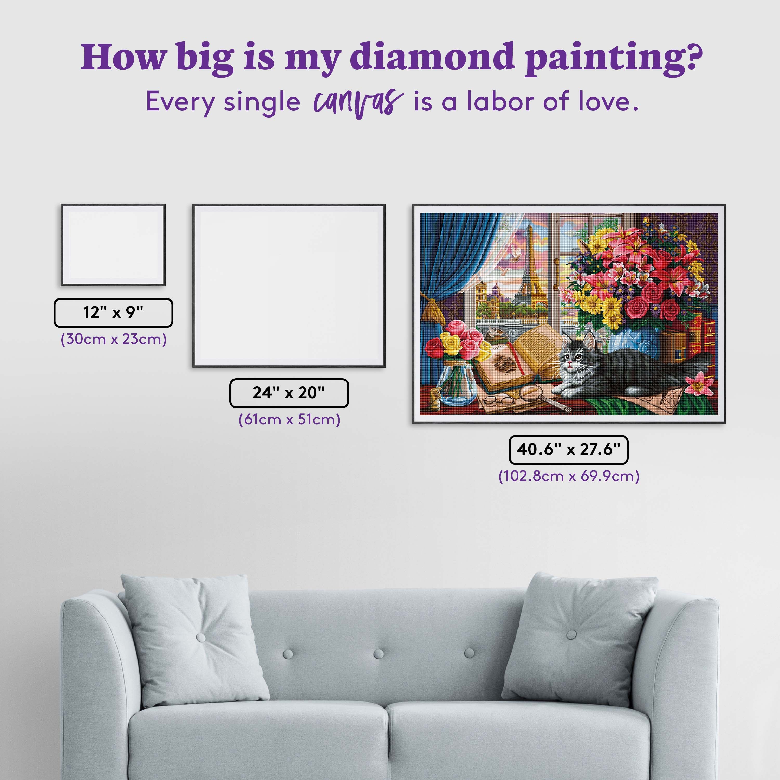 Delight in the charms of Paris as seen from an enchanting window nook. Find companionship with a cozy feline and inspiration in stunning bouquets and the famous tower's glow.