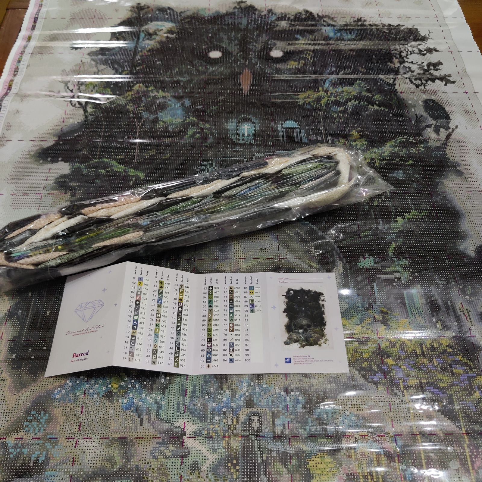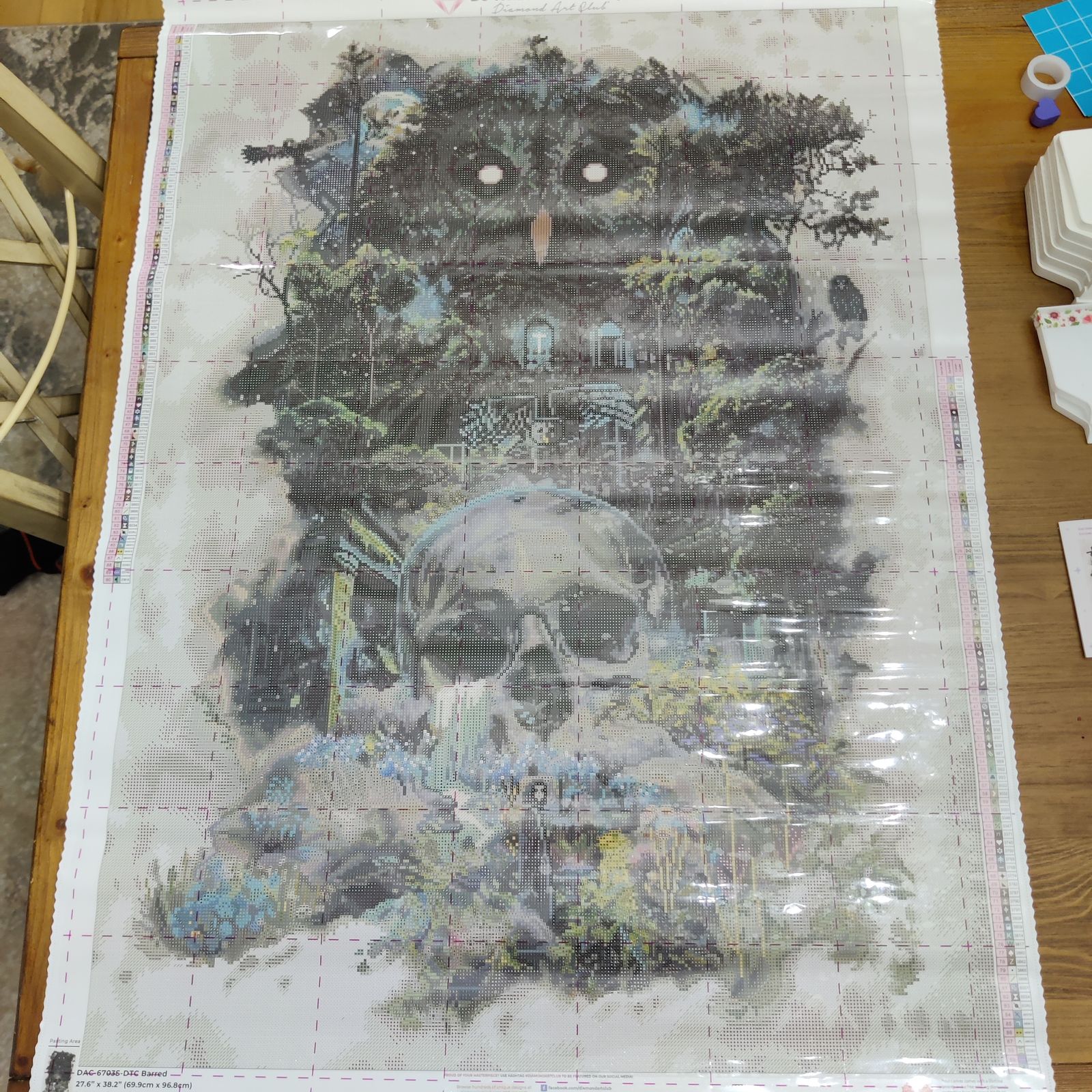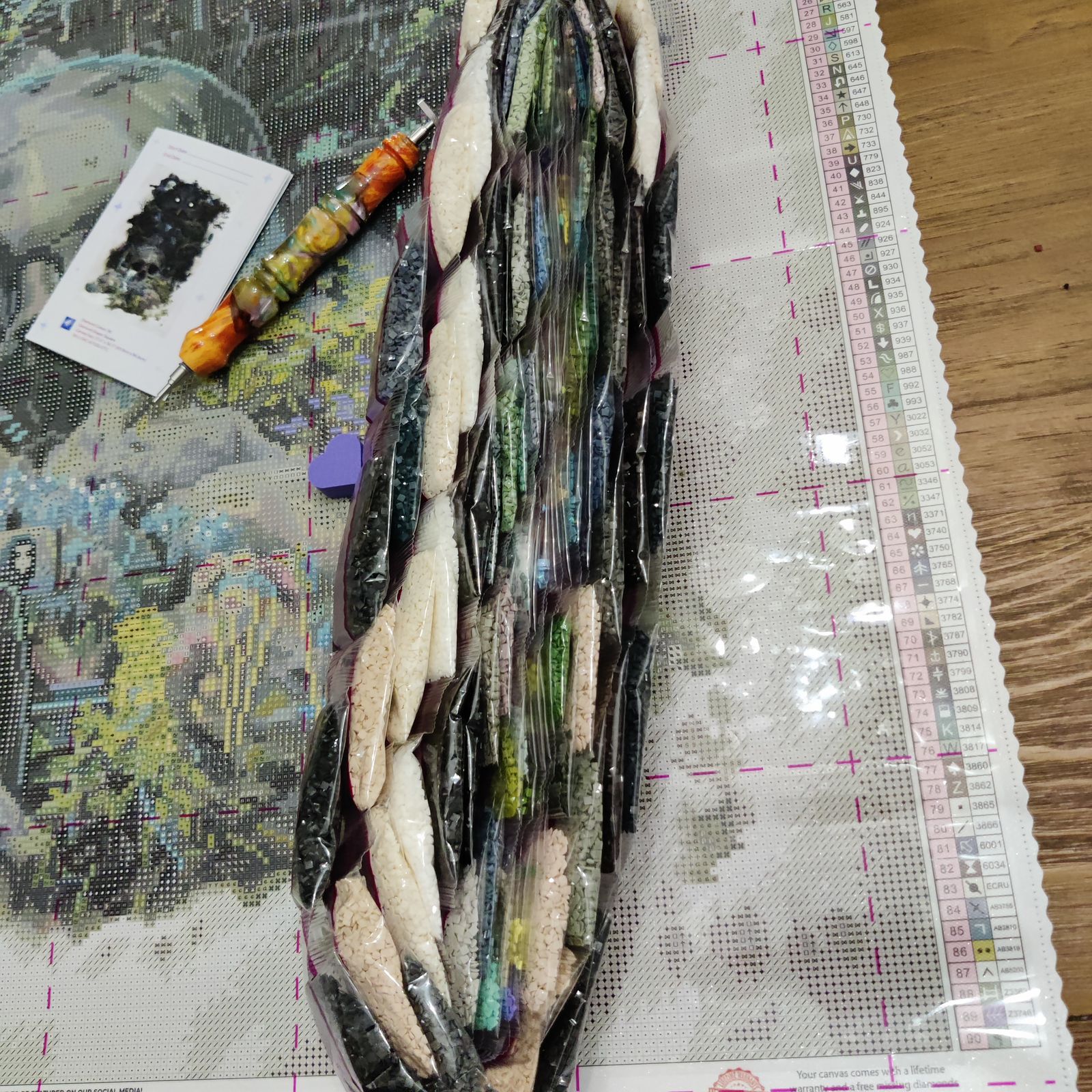 The upper part of the painting, especially the large owl’s head and the small owl, really tested my patience. The colors were extremely dark, and working on it was truly challenging. You wouldn’t believe it, but the painting uses a total of 90 colors! You wouldn’t notice that at first glance, but it becomes obvious with all the tiny confetti areas, mostly made up of shades of gray, blue, brown, and green. Despite the difficulty, I just couldn’t stop working on it and kept going. Something about this piece completely drew me in and kept me motivated to see it through.