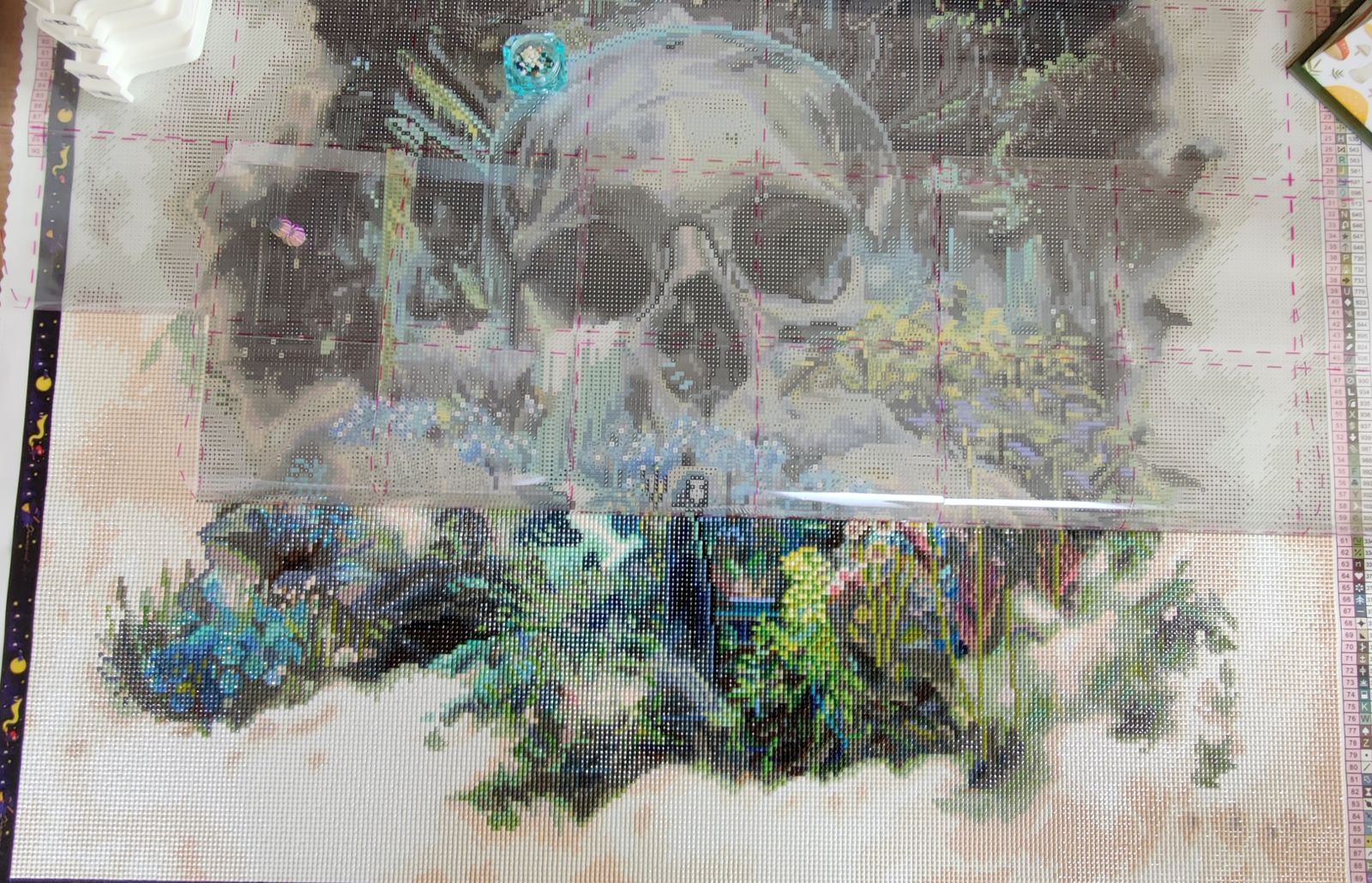 Now that it’s finished, I’m absolutely thrilled. The details are stunning. I particularly love the lower part of the painting, the trees on the right, the ruins, and the moon at the top – everything comes together beautifully. The light border was a refreshing change from the darker tones and made working on that section very enjoyable.