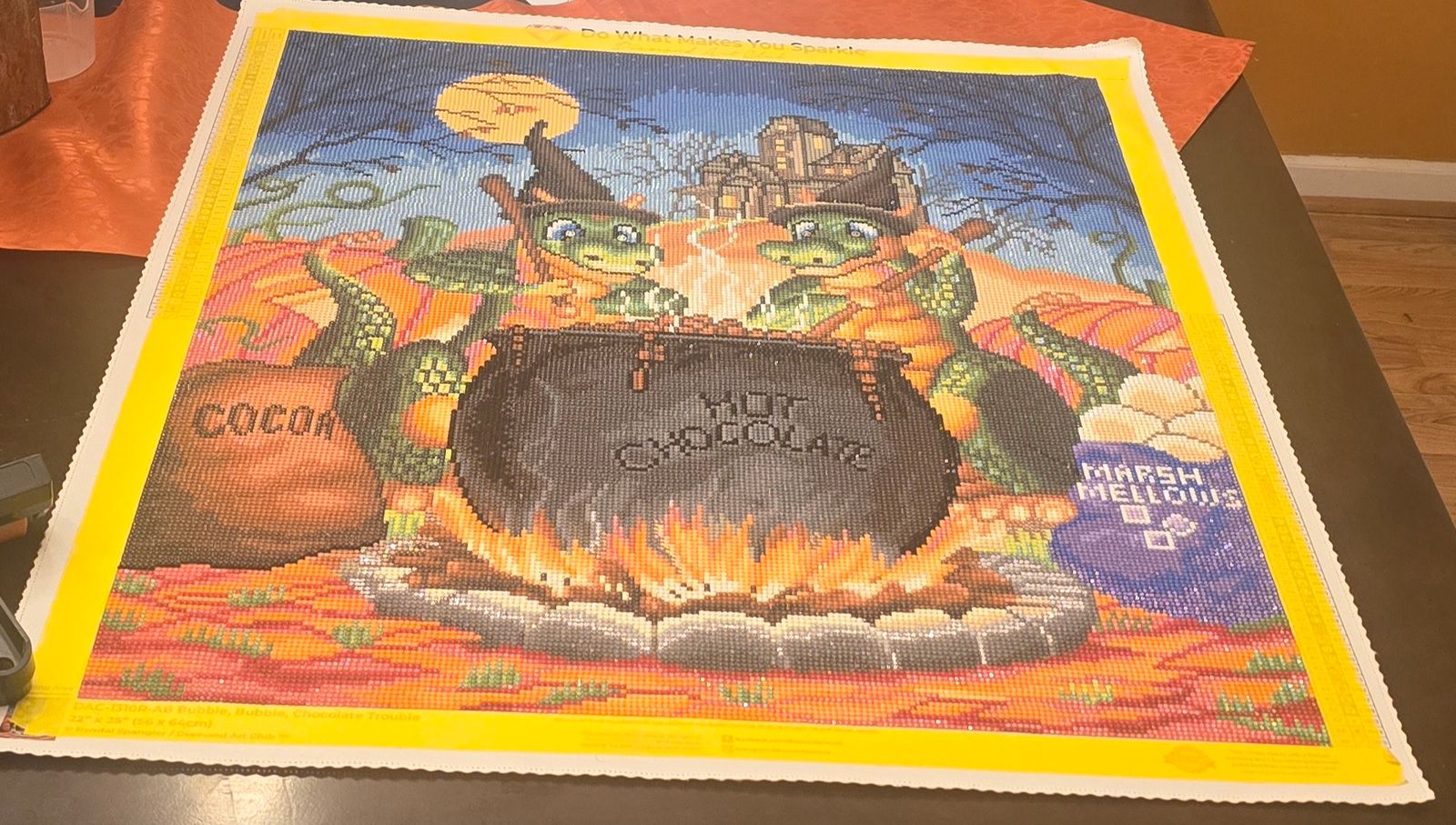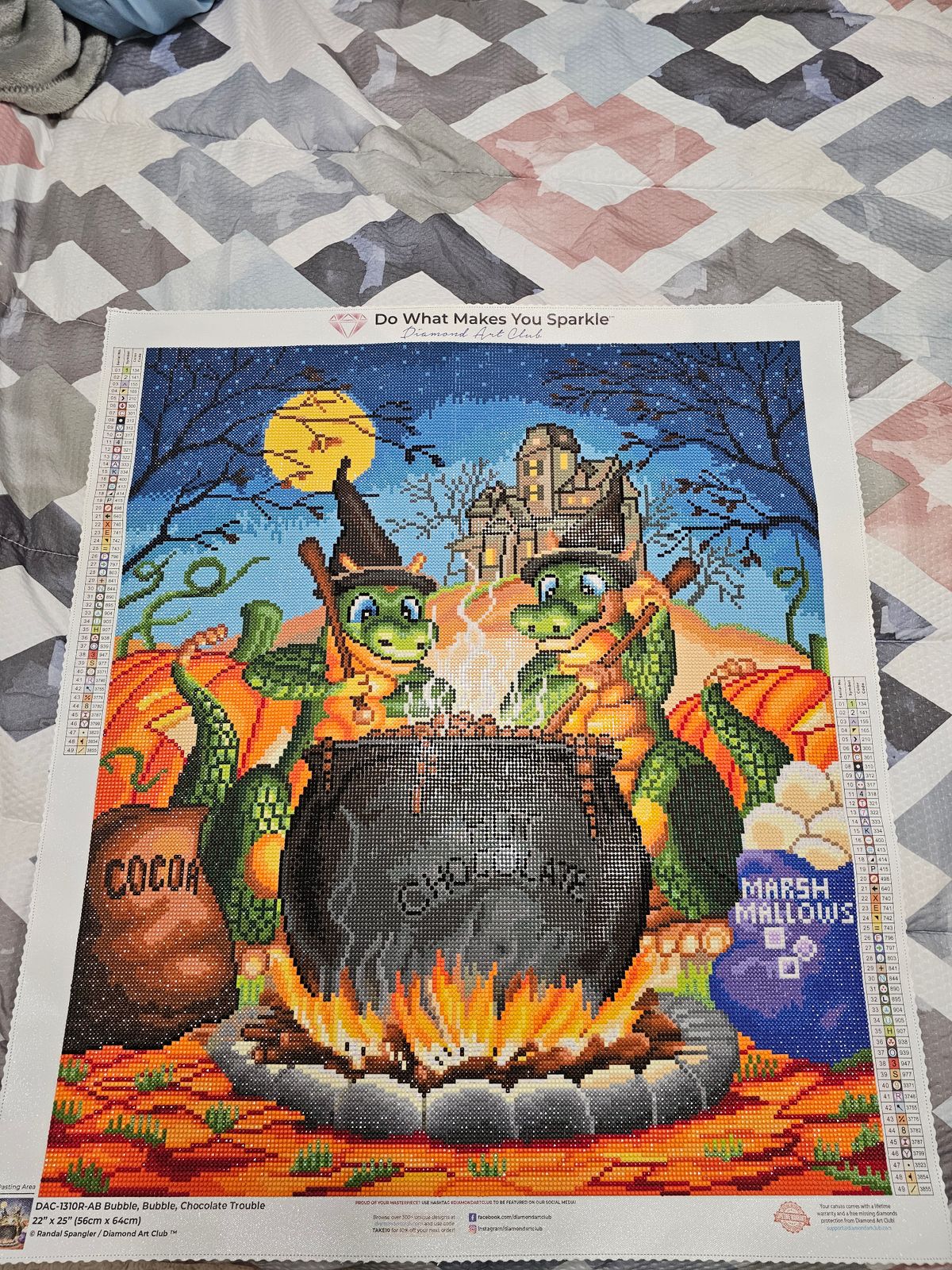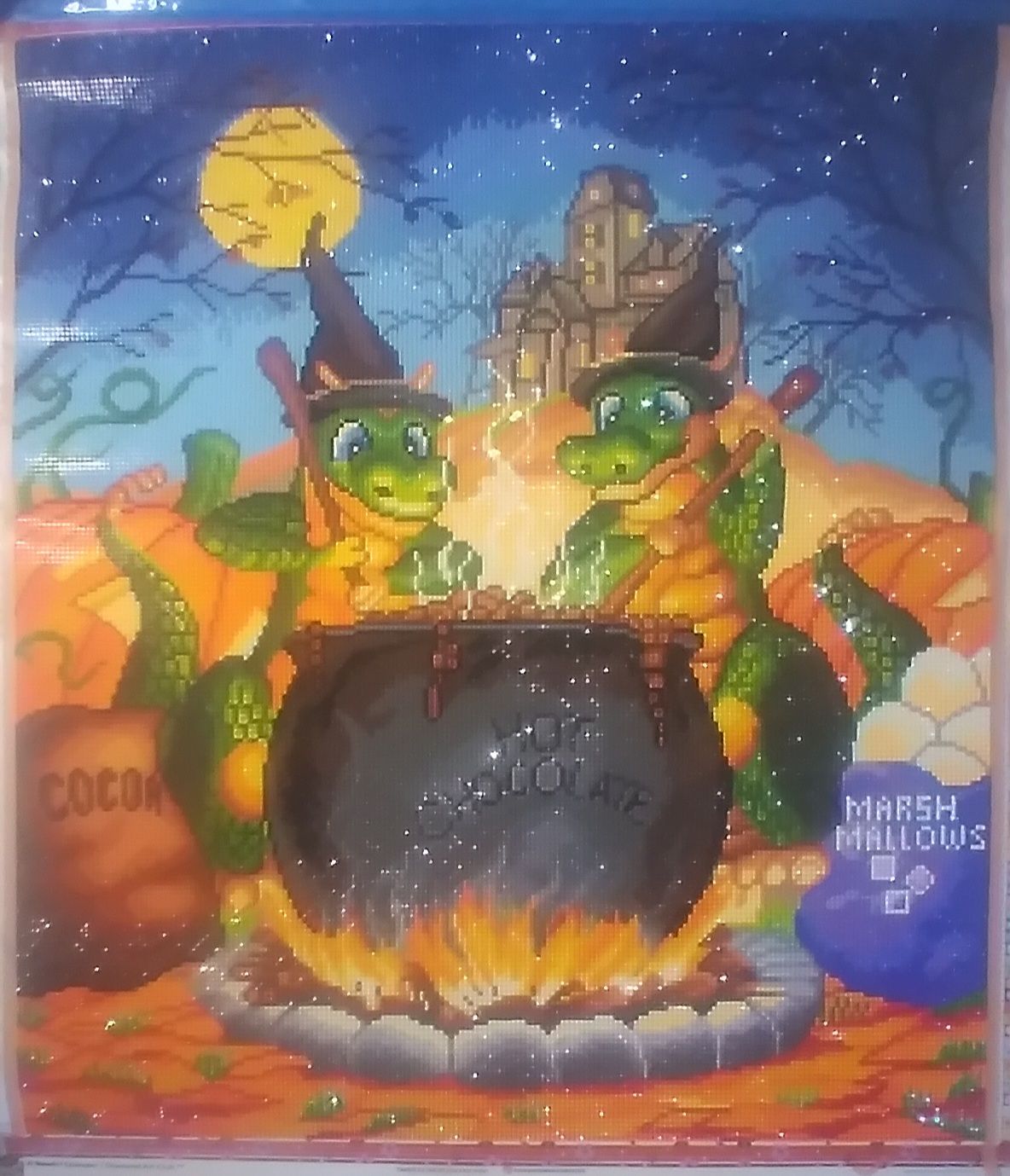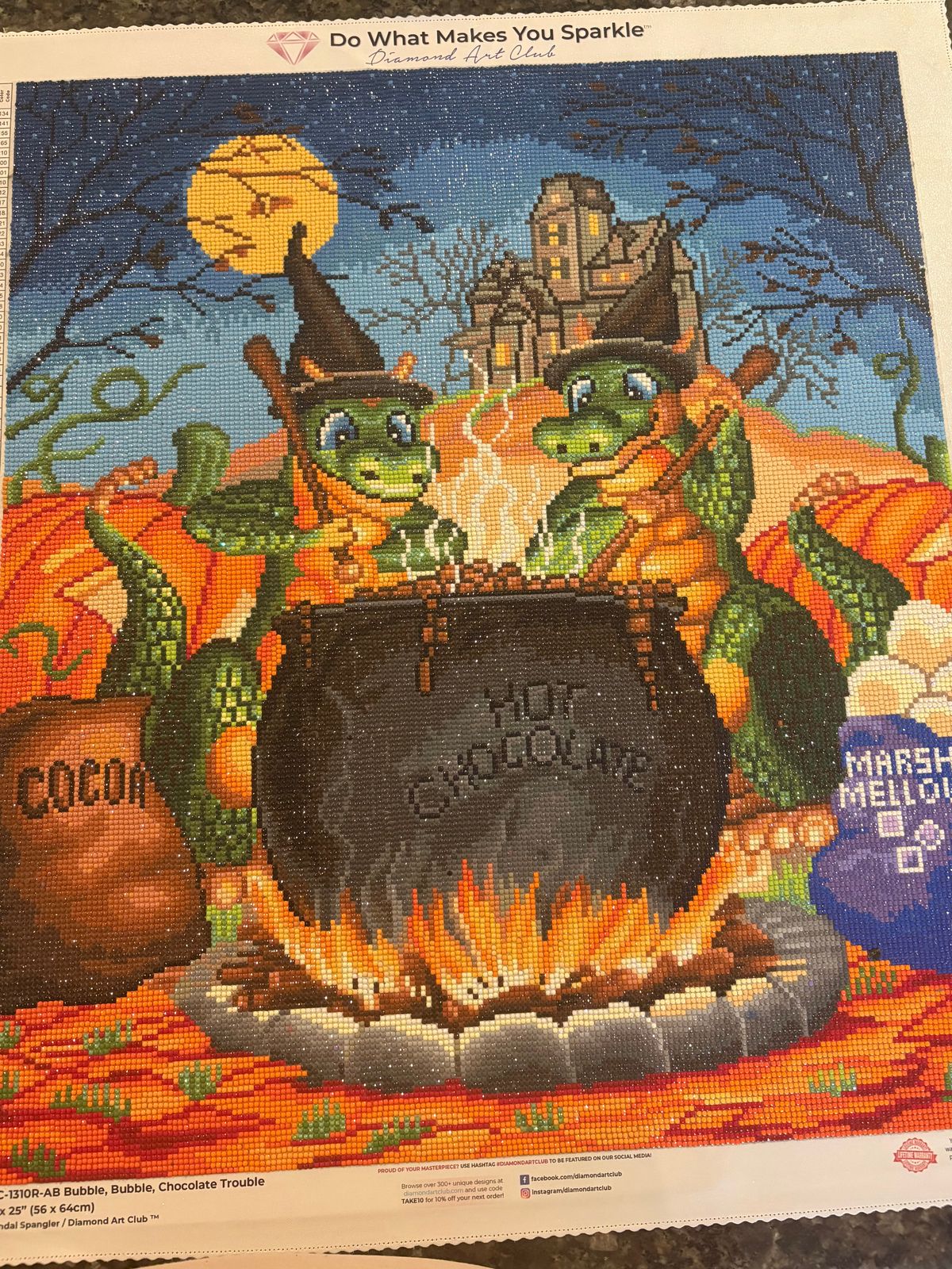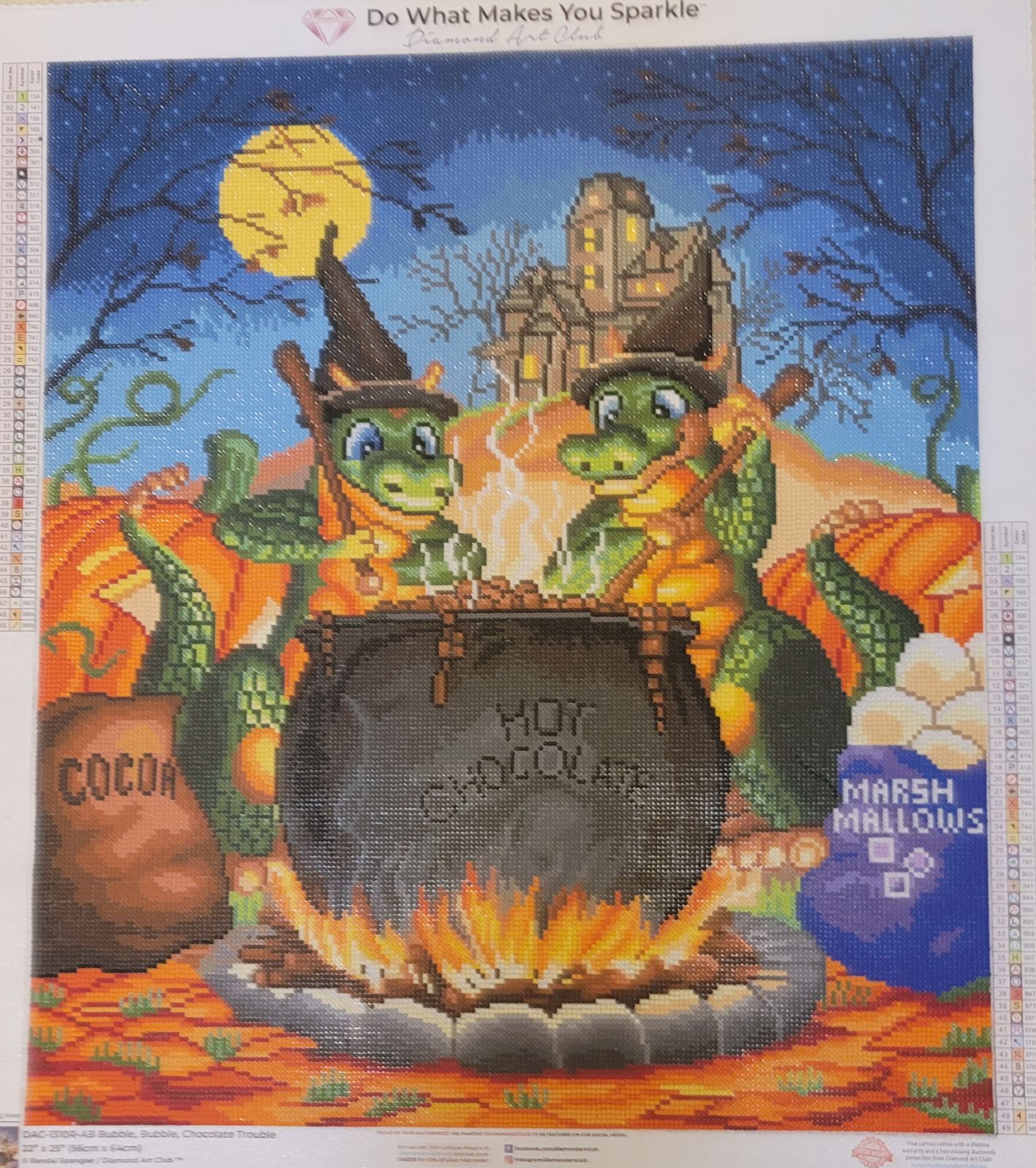 Adorable Dewey and Dagmar brewing up some yummy hot chocolate!! What an awesome and fun Halloween image!! Drill field is clear, adhesive is even throughout. Colors are rich and vibrant, drills are gorgeous and sparkly!! Another winner from DAC!!