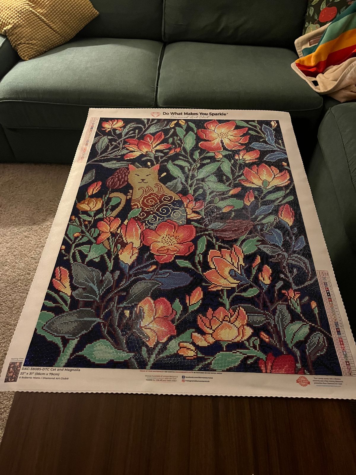 I LOVED working on this piece! High quality canvas and drills lend to a beautiful finish even for a beginner diamond artist. Looks like two different works of art depending on how bright or dark the room is. Very happy with the process and especially the result!