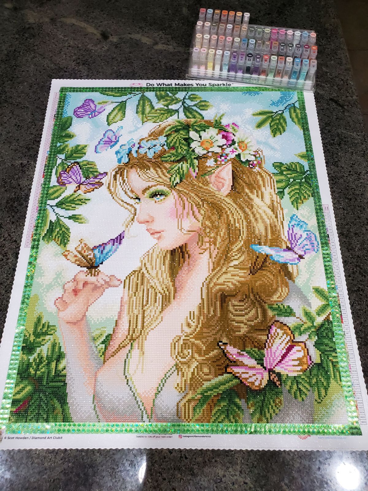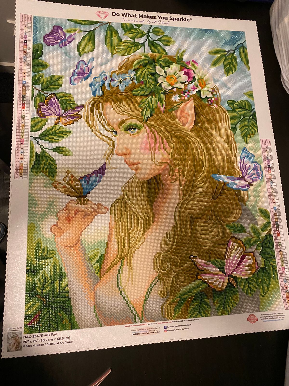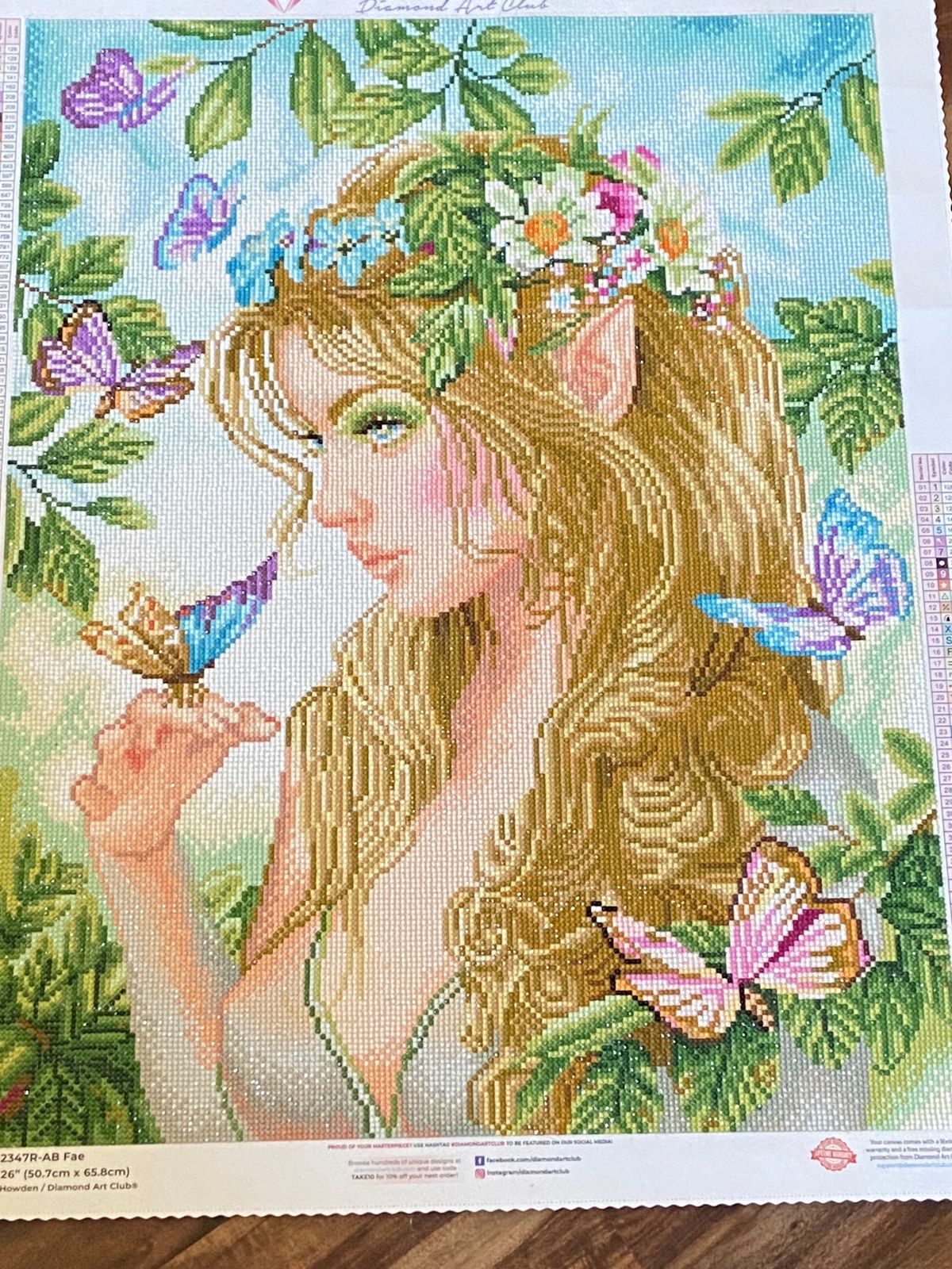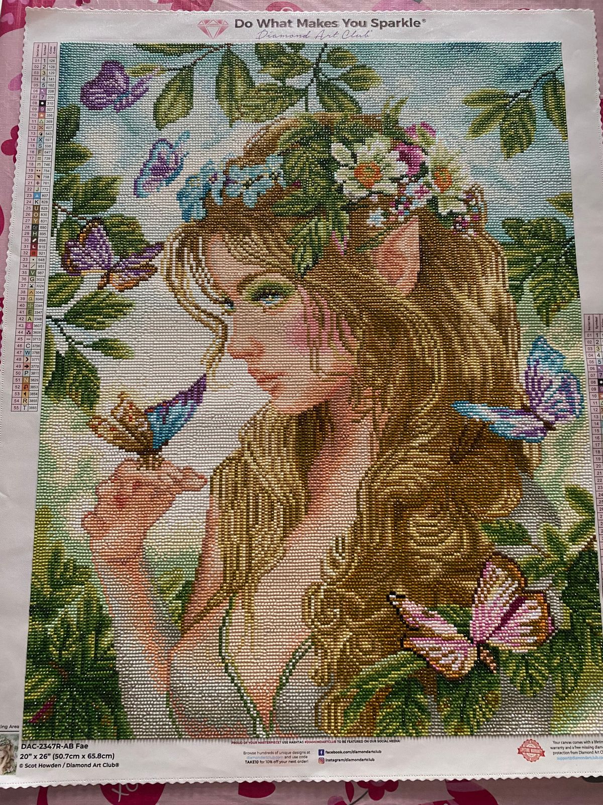 I’m not a fan of color blocking so the background was a slag also I through the lower part with her arms being gray was a bit of an odd choice but the butterflies and her crown were so pretty and the overall effect is really soft and beautiful. I will say quality wise for glue/drills/canvas was incredible per usual. The ABs chosen for this kit were also phenomenal.