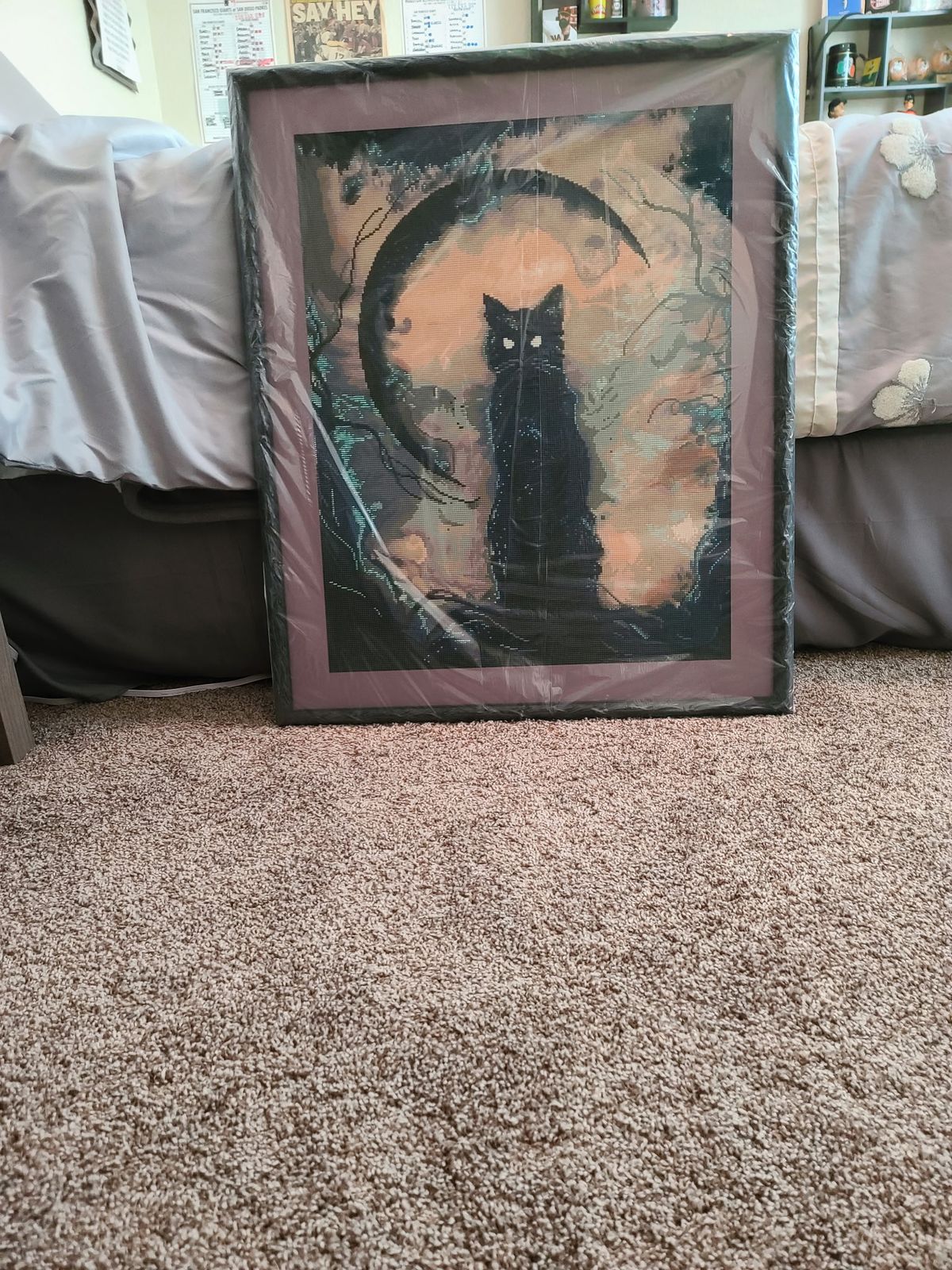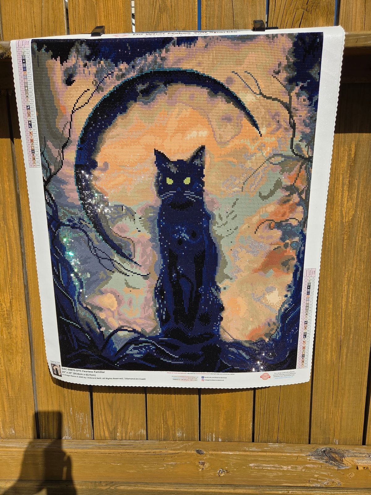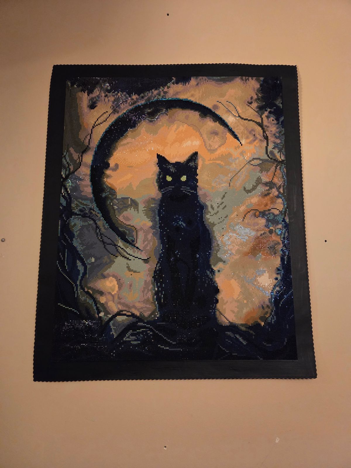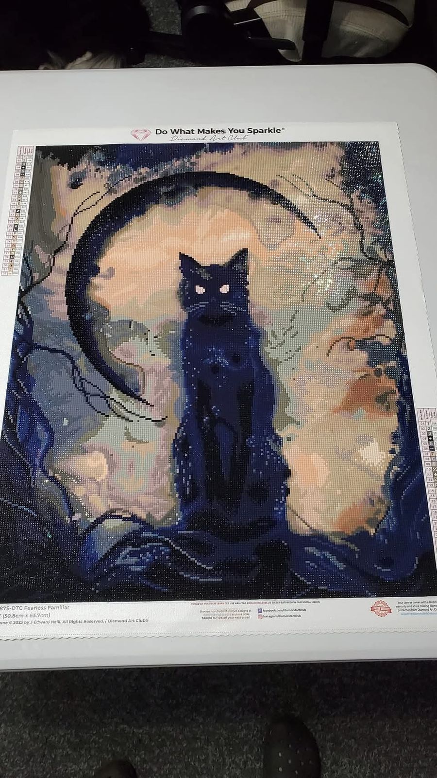 Enjoyed working on this kit. It was a smaller square kit that took me 50 hours to complete. I added black ABs around the moon and used a light green AB drills for the eyes. No issues with the canvas and drills. Actually the black drills that were in this kit were perfect when sometimes black drills could be a headache.