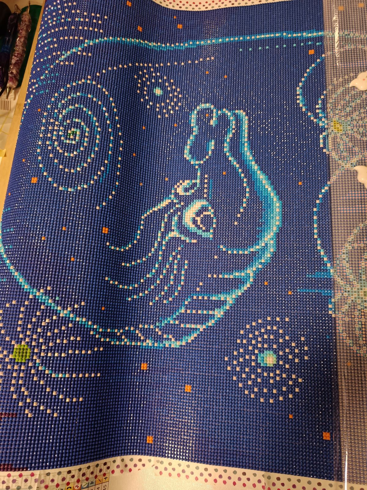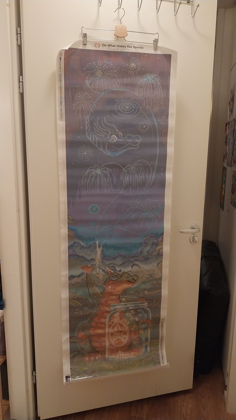 I underestimated how big this painting was. My husband is 6 ft tall for reference. This took me just over a year to complete with 3 other smaller paintings in the mix. The colors are absolutely gorgeous and the shading is amazing. The bottom part has some confetti, but not horrible. The top has quite a bit of opportunity for horizontal and vertical color blocking. I replaced the fireworks with glow in the dark AB’s so the sky glows at night. Absolutely beautiful painting overall!