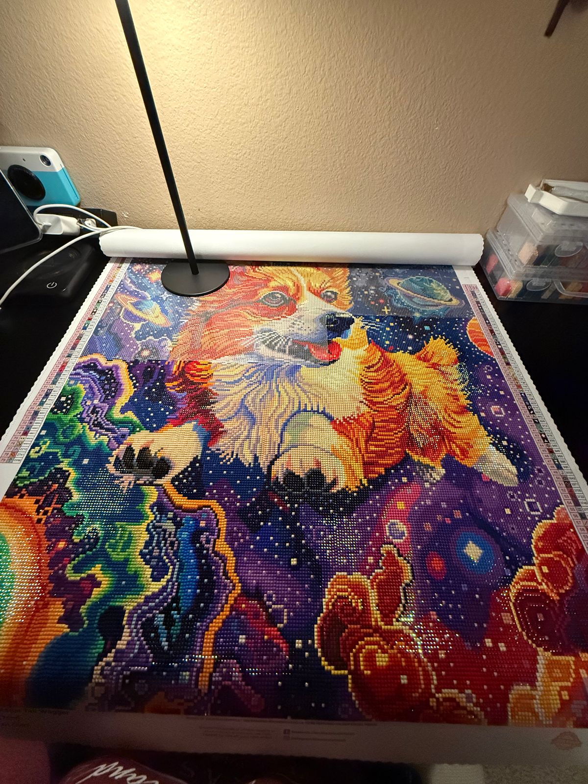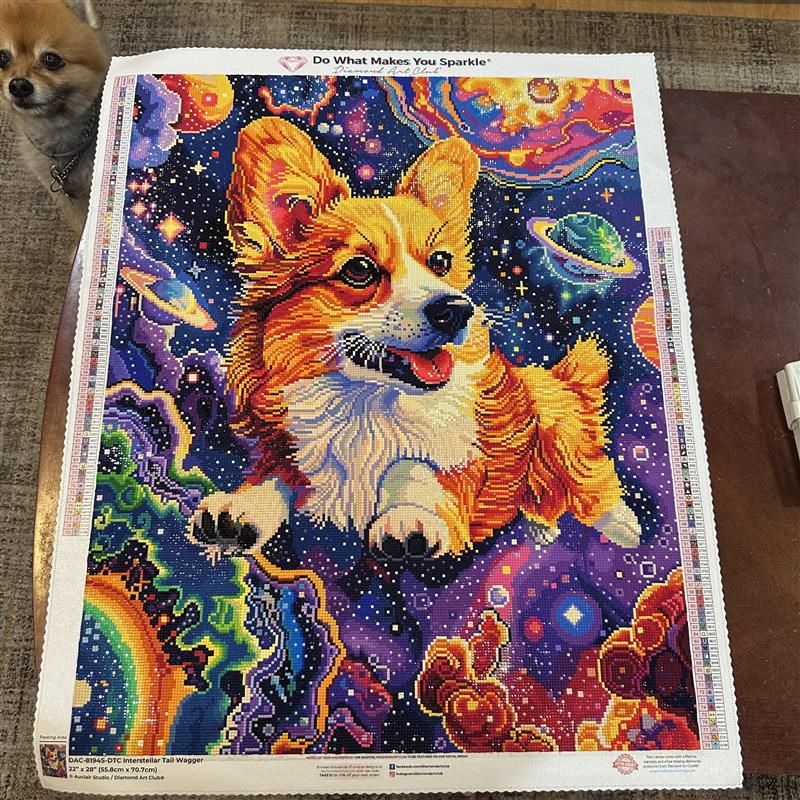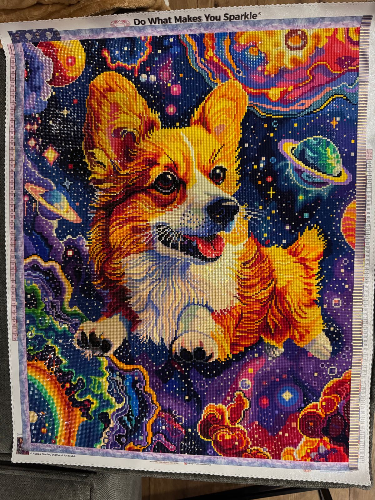 Loved all the bright colors on this painting. It looks a lot like my corgi. Love every minute working on this painting and can't wait to get it framed and up on my wall