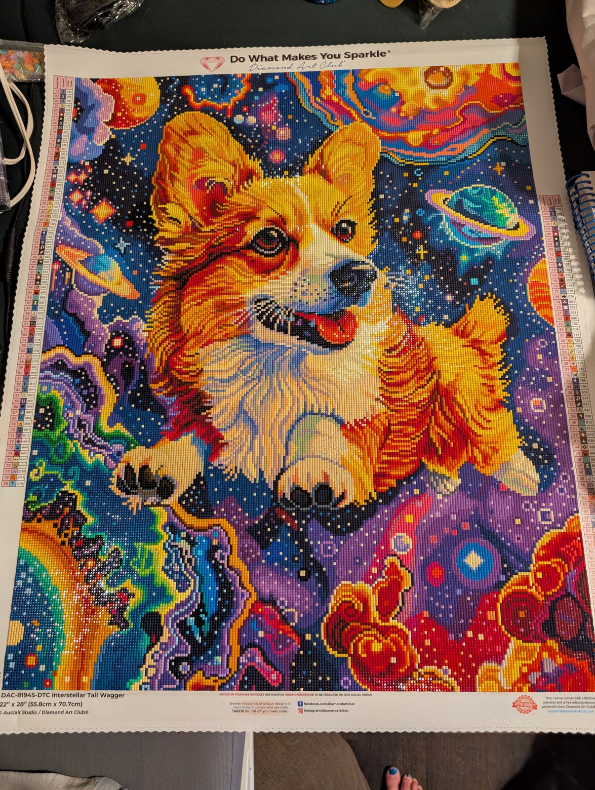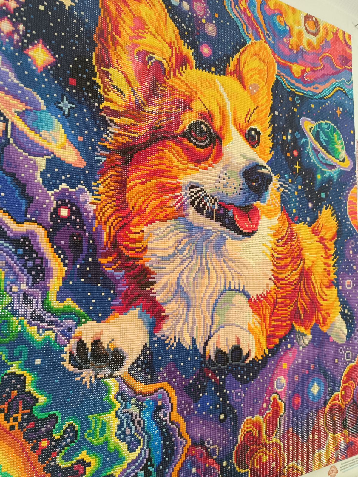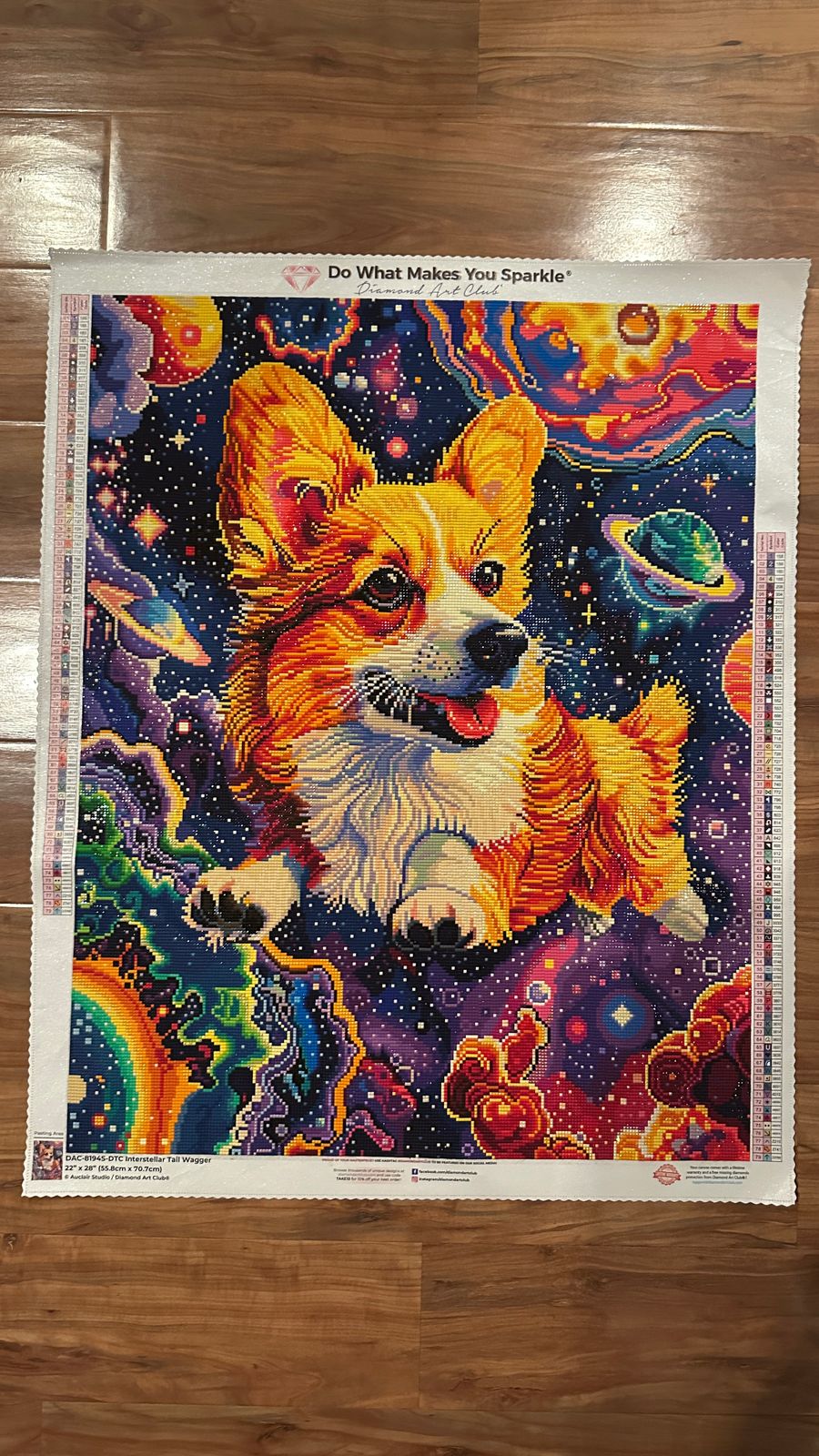 Loved all the bright colors on this painting. It looks a lot like my corgi. Love every minute working on this painting and can't wait to get it framed and up on my wall