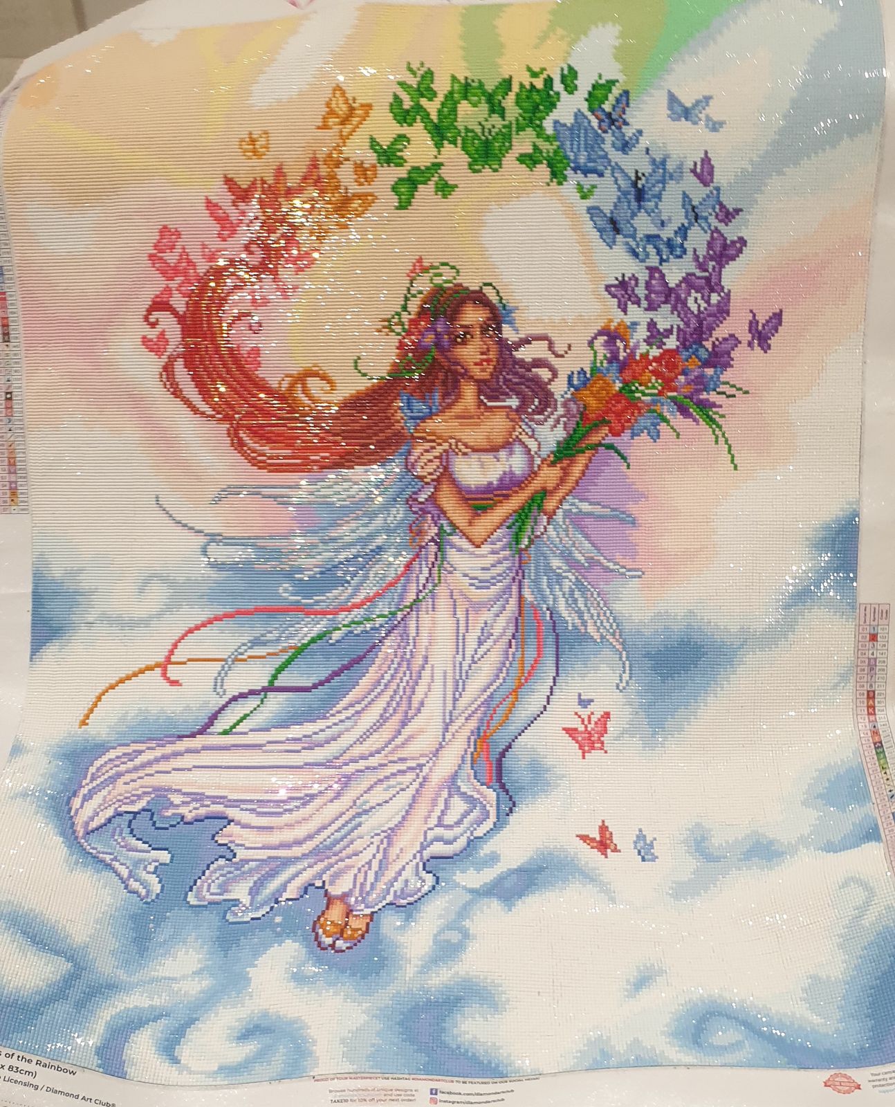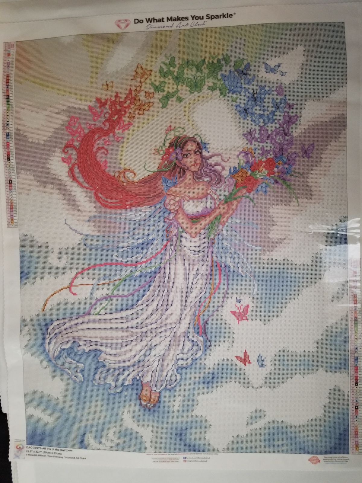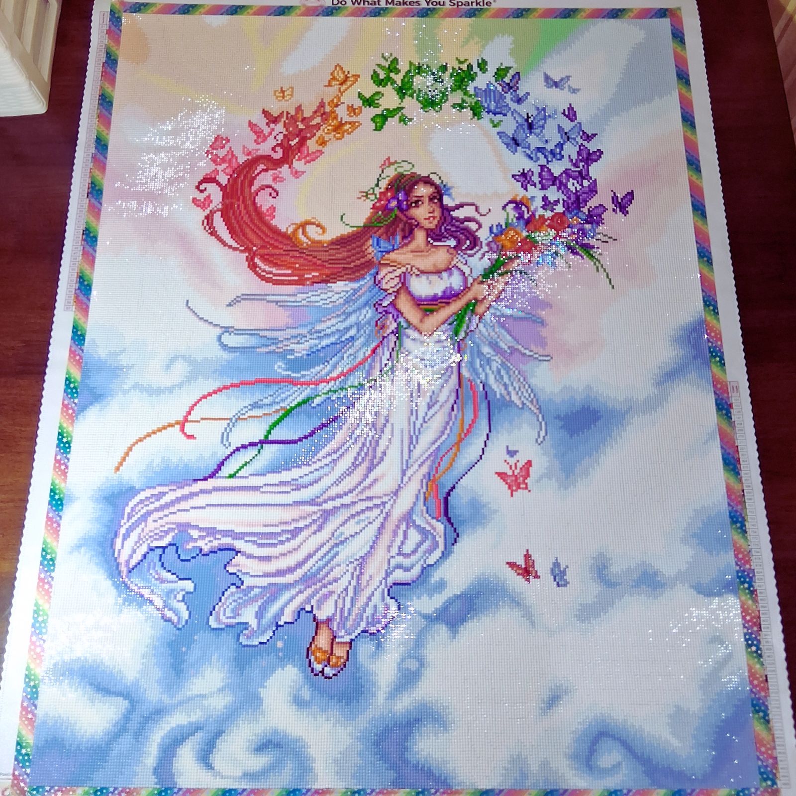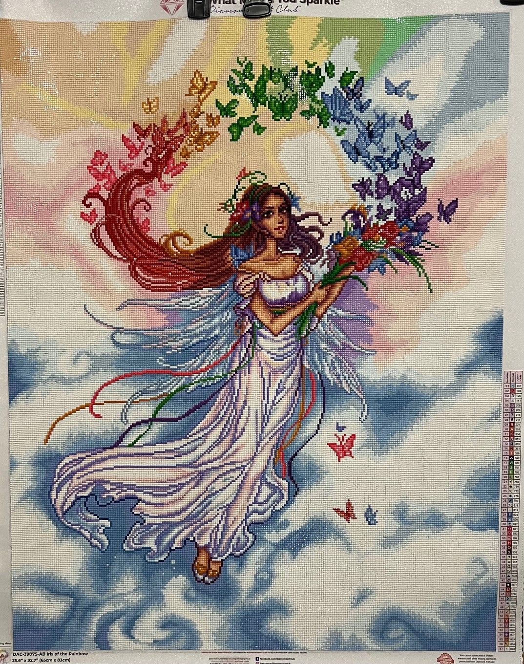 This is the most beautiful painting I've ever worked on, and currently my favorite painting I've done. I don't like color blocking because I feel like you can tell more easily when the drills aren't lined up, but I loved working on this painting anyways. The swirls of blue and white on the lower portion are so pretty. Then Iris is full of beautiful ABs. Her wings are full of blue ABs, her dress is full of lilac ABs, and her hair is full of red ABs. Absolutely breathtaking. Unfortunately I ran out of 1 color but I took some from another kit.