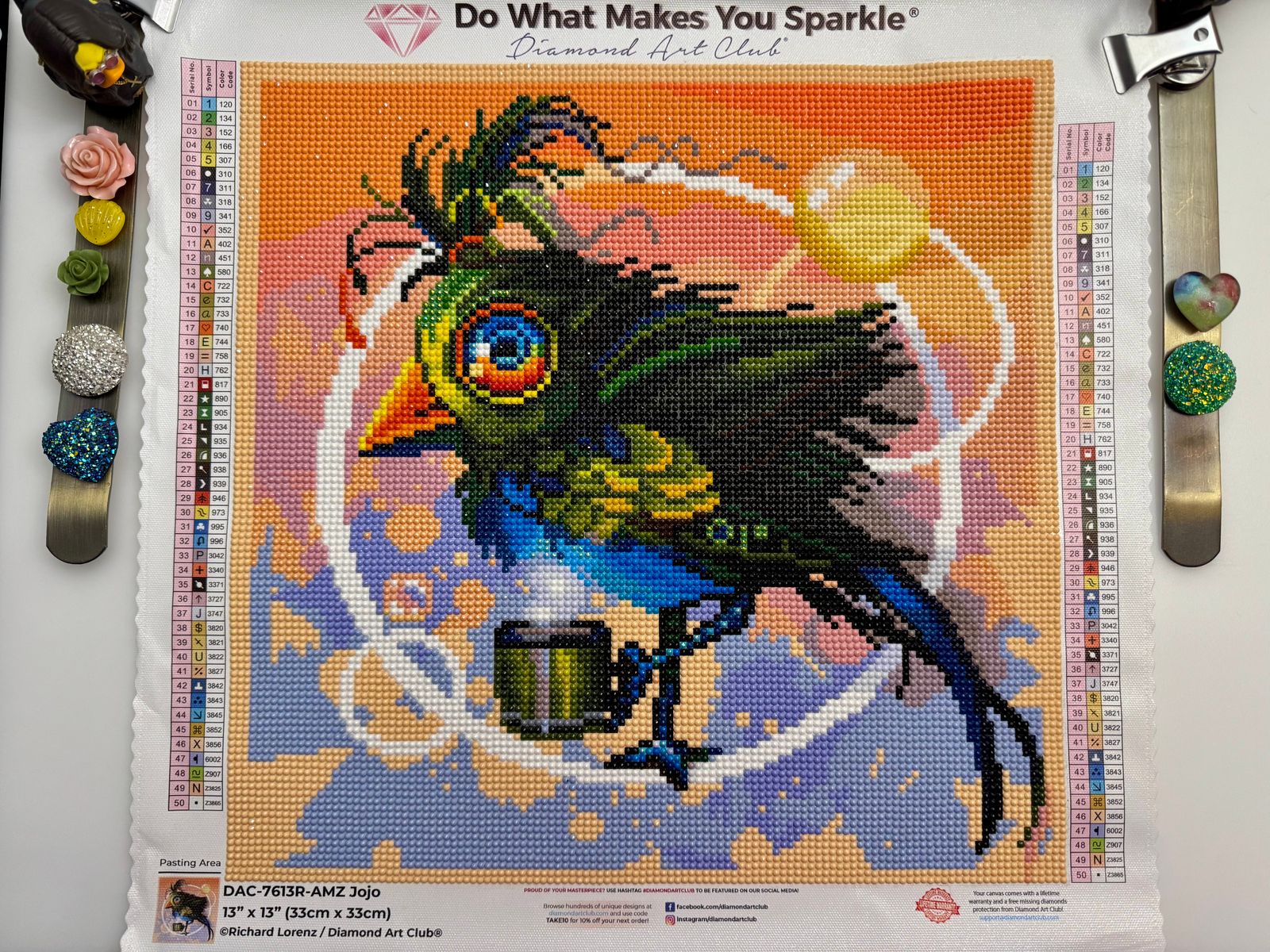 This was my first full diamond painting after trying out one of the mini dazzles kits. After getting some more diamond painting experience, I can say that Jojo was a great introduction! I love the colors, and the smaller size and my love for this goofy little bird made the process fly by.